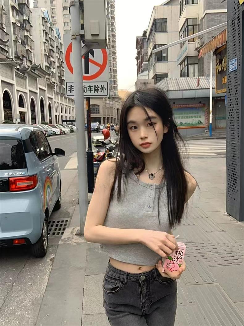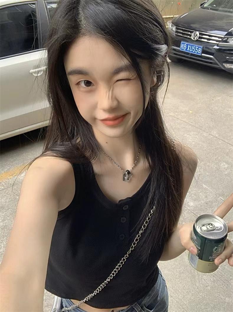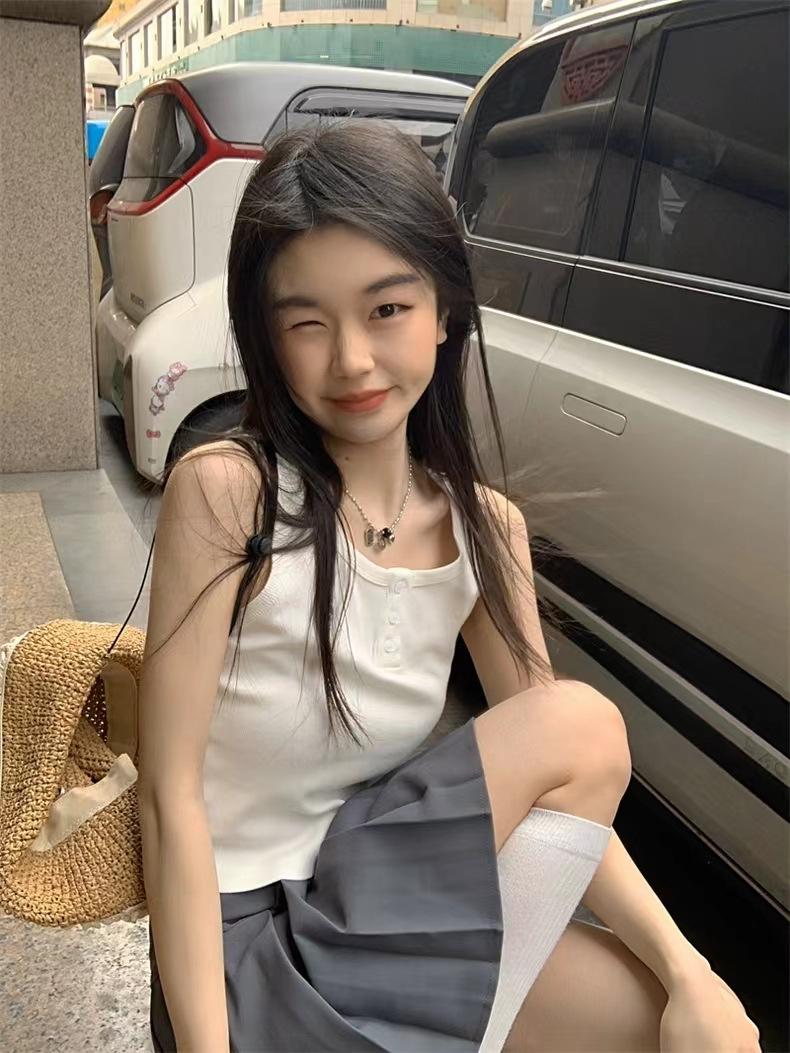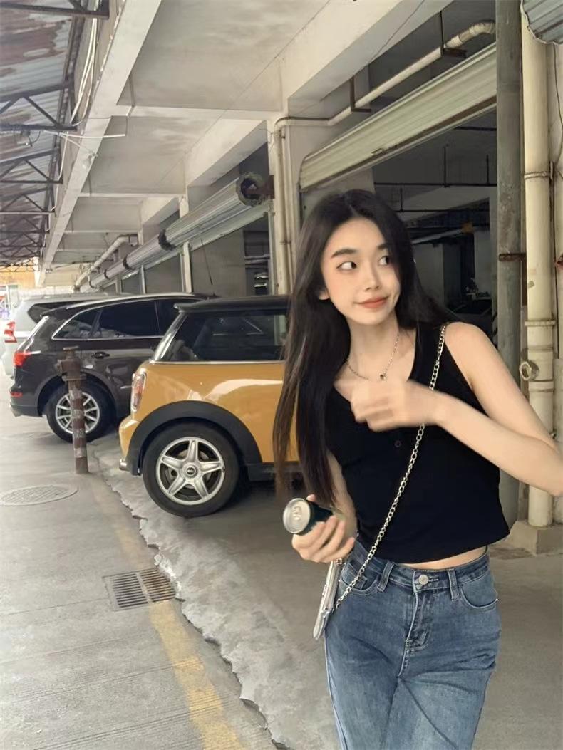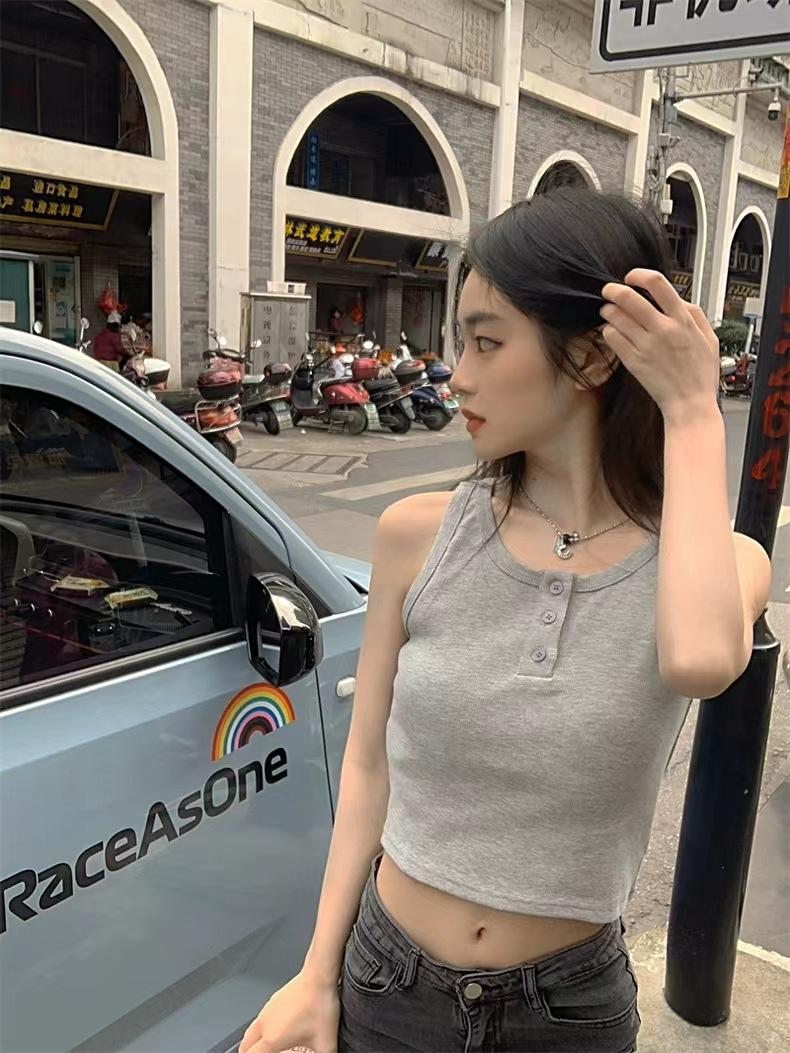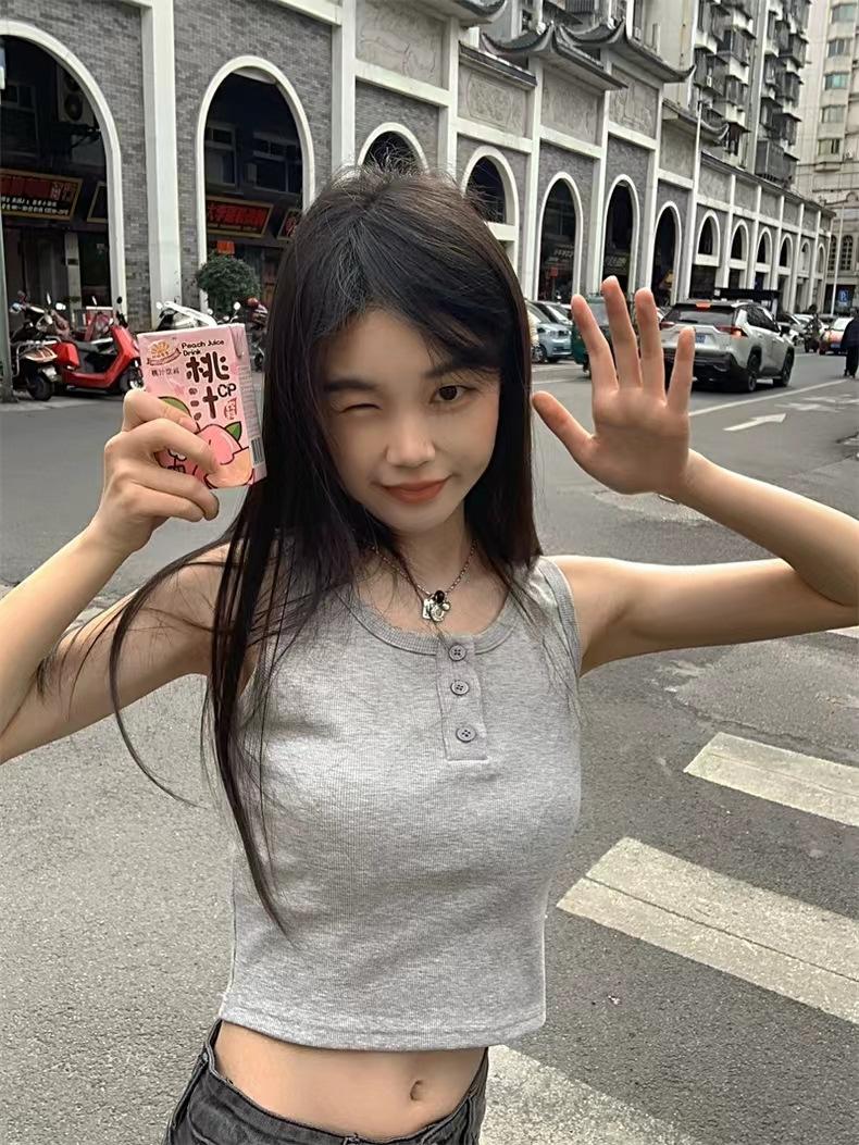 Camisola de Botones sin Mangas de Verano Nueva Ajustada Corta Camiseta Básica Top Nicho Ins