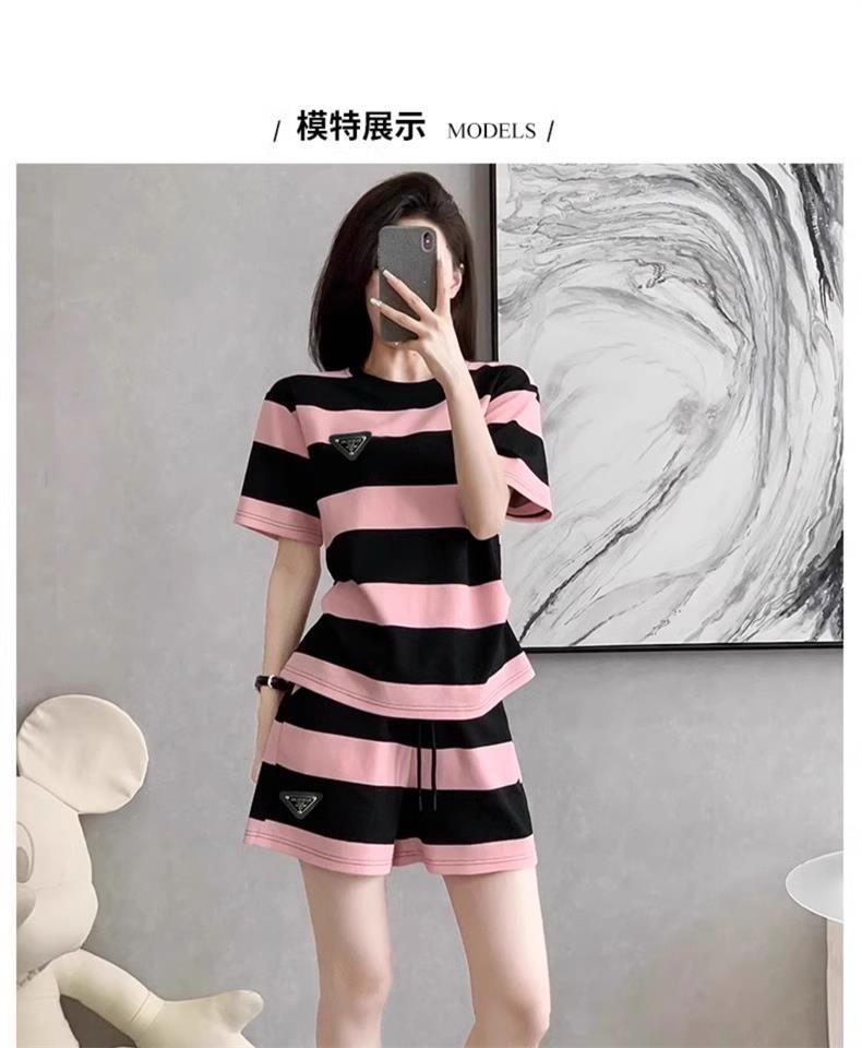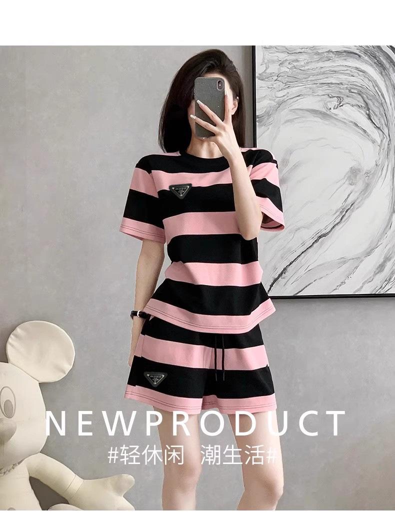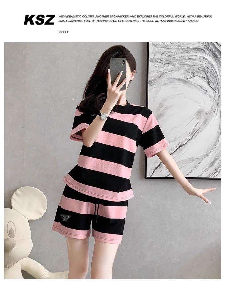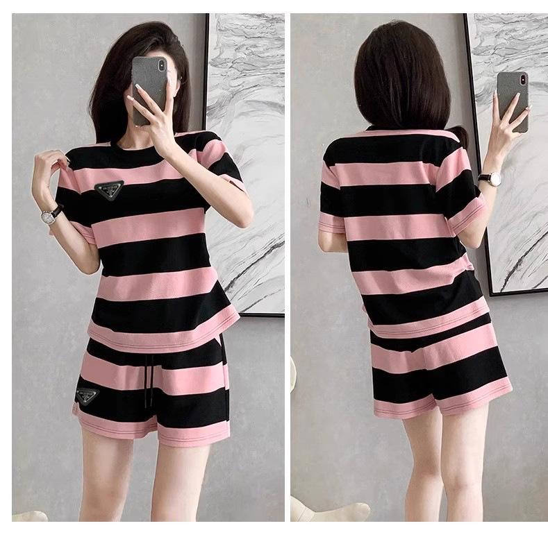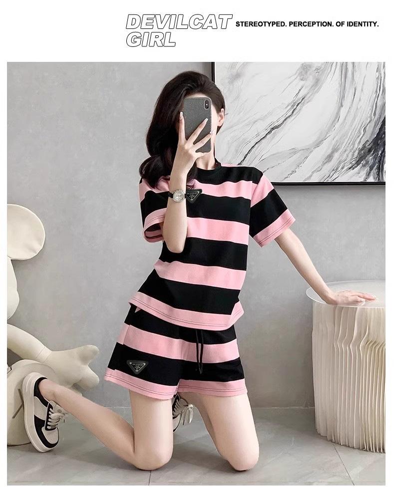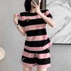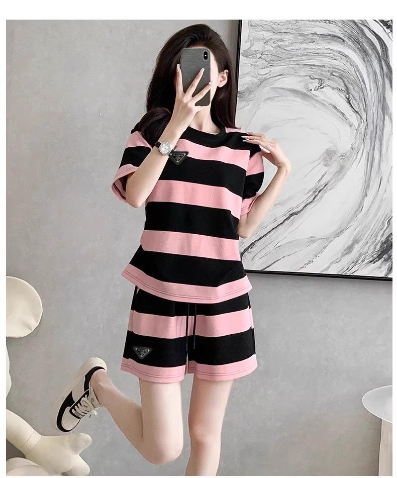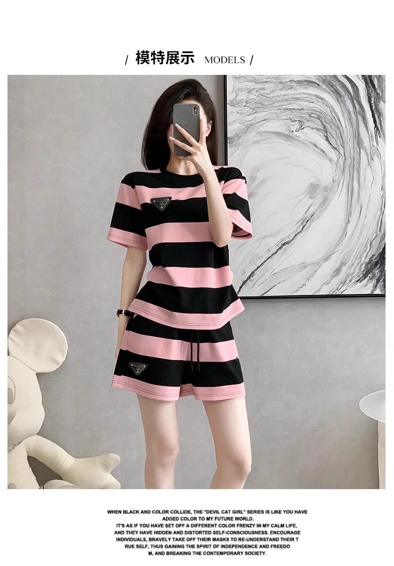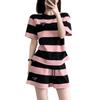 Conjunto deportivo informal retro estilo Hong Kong para mujer, verano 2025, nuevo conjunto de dos piezas con pantalones cortos a rayas rosas y negras de manga corta