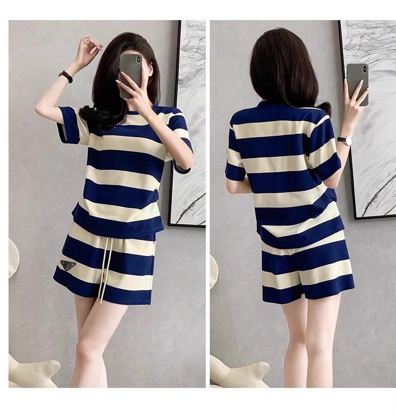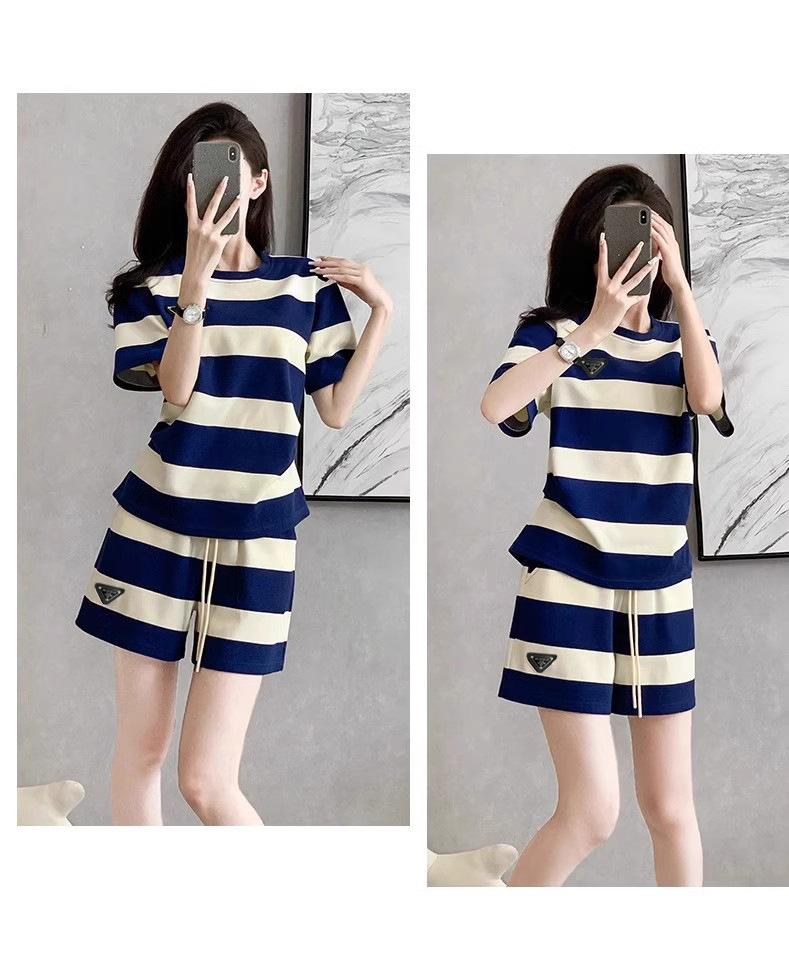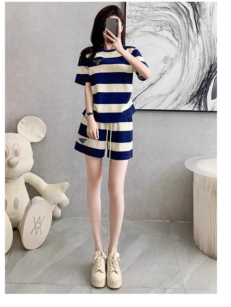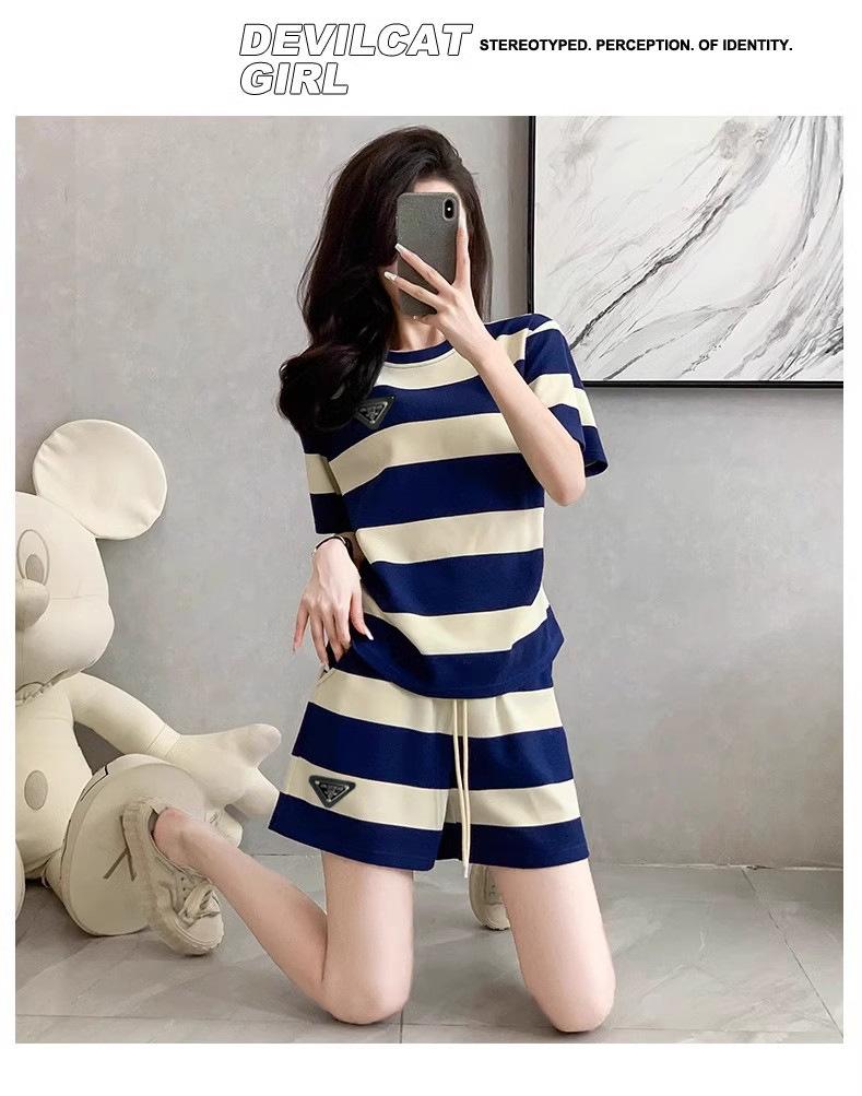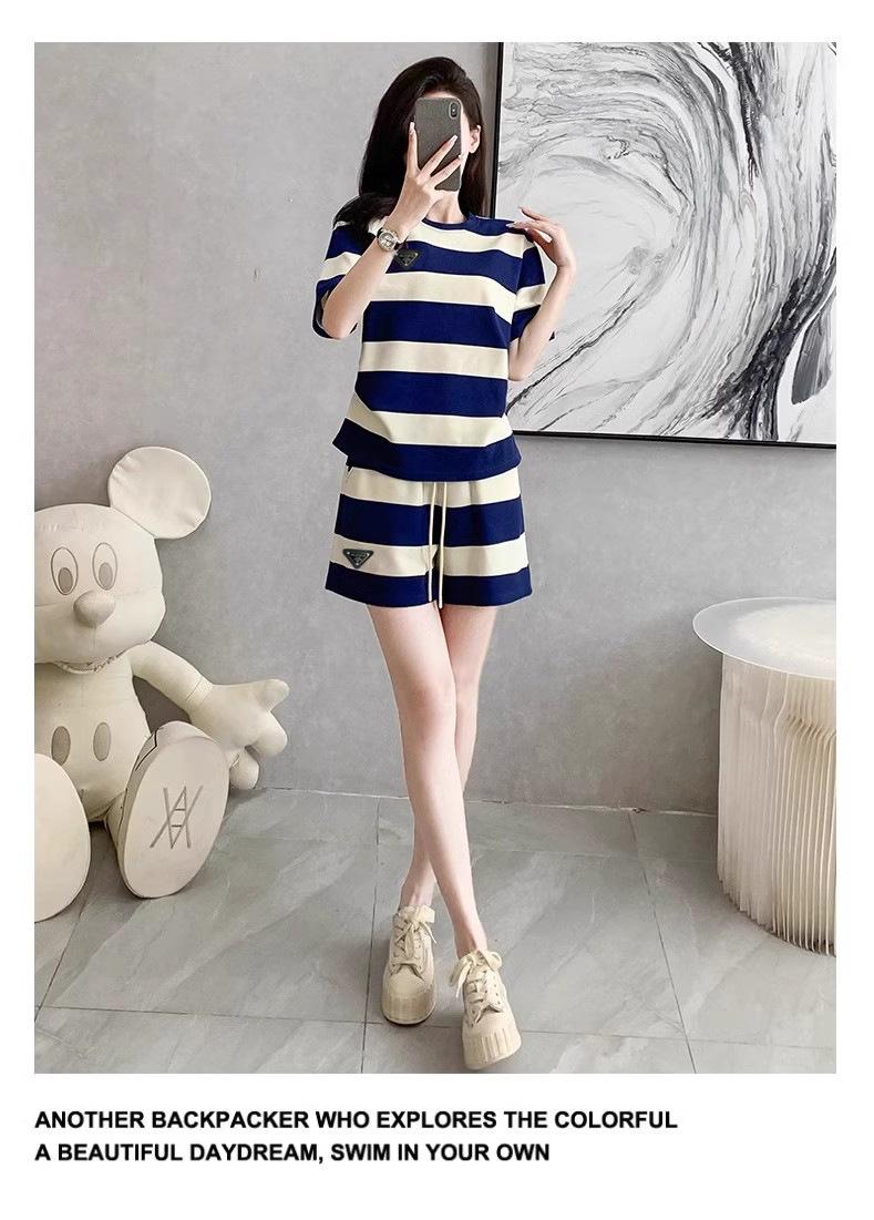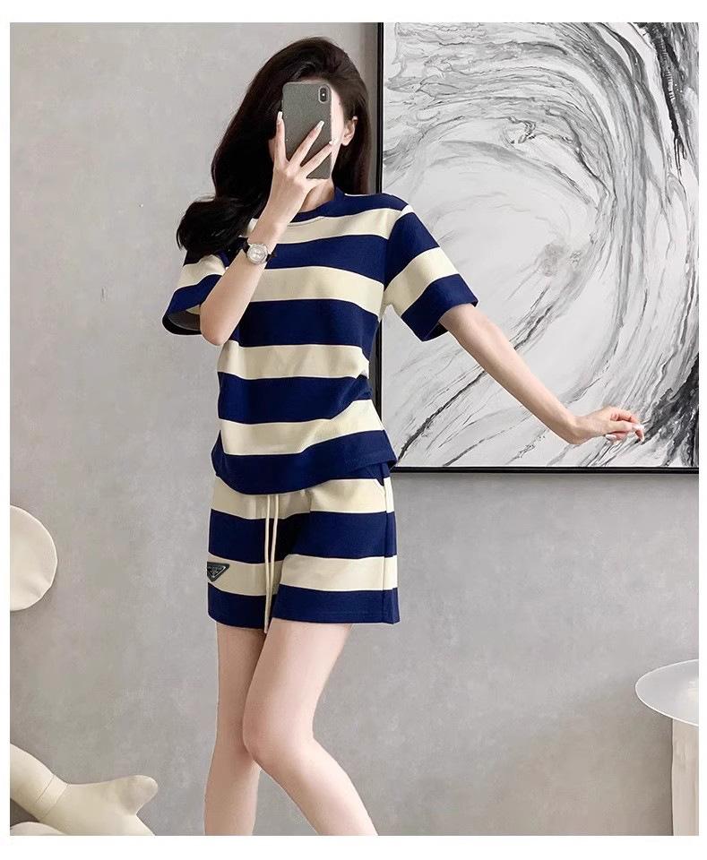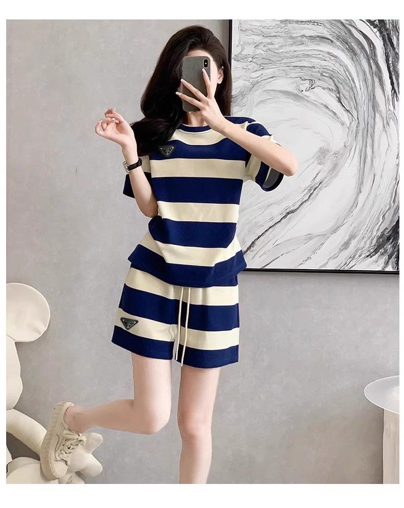 Conjunto deportivo informal retro estilo Hong Kong para mujer, verano 2025, nuevo conjunto de dos piezas con pantalones cortos a rayas rosas y negras de manga corta
