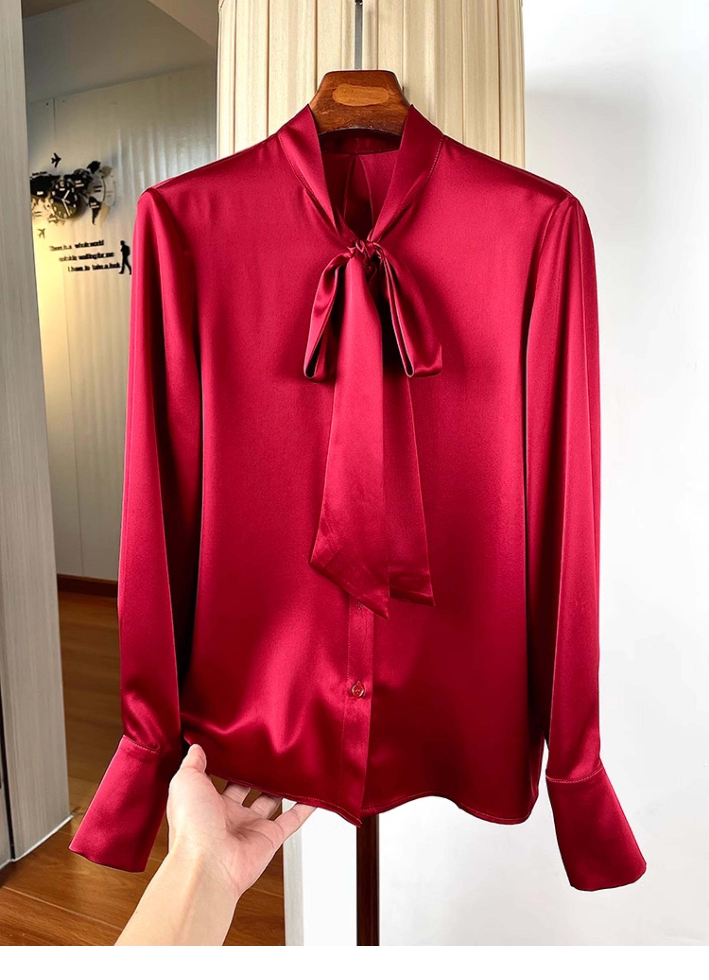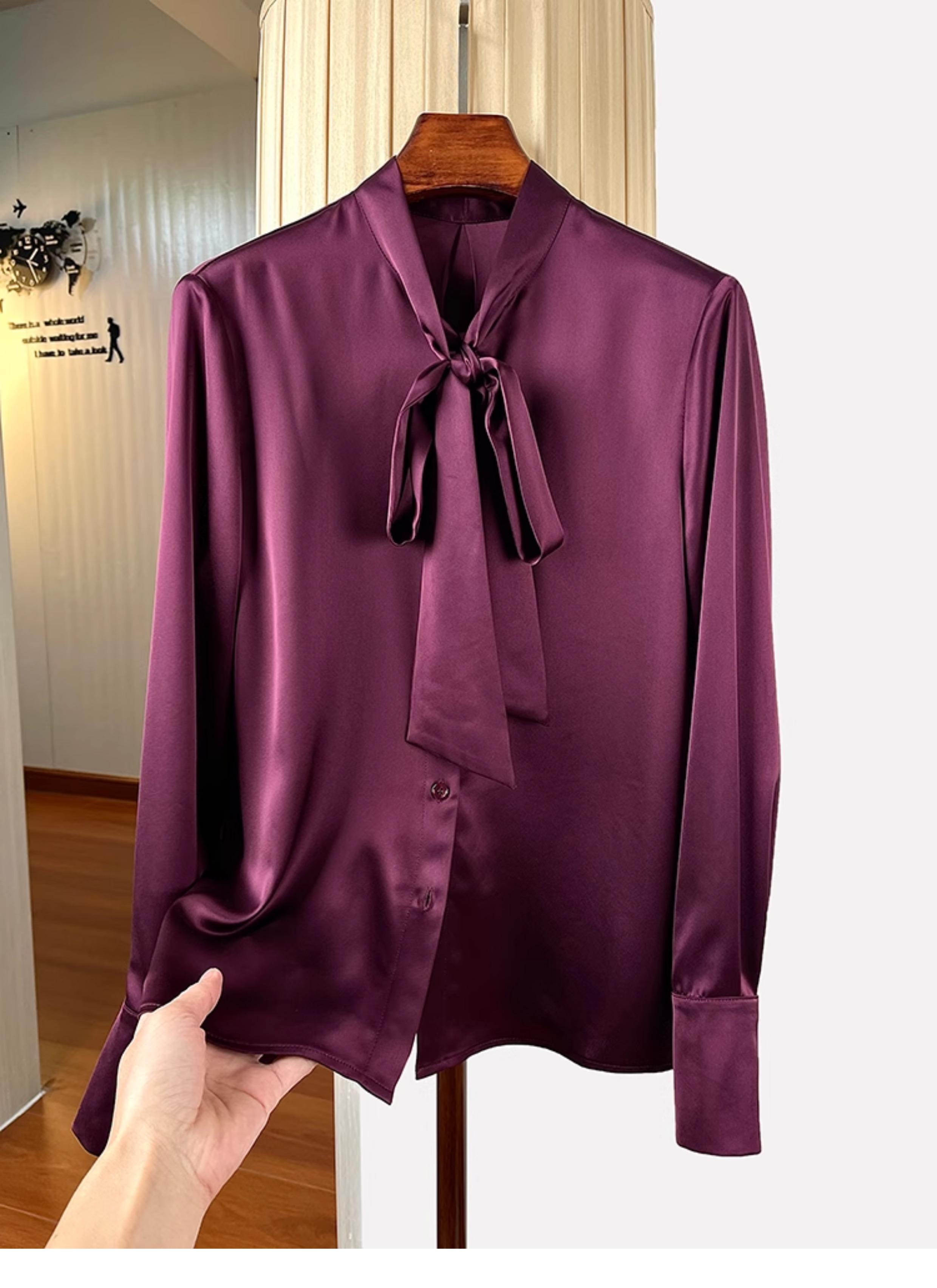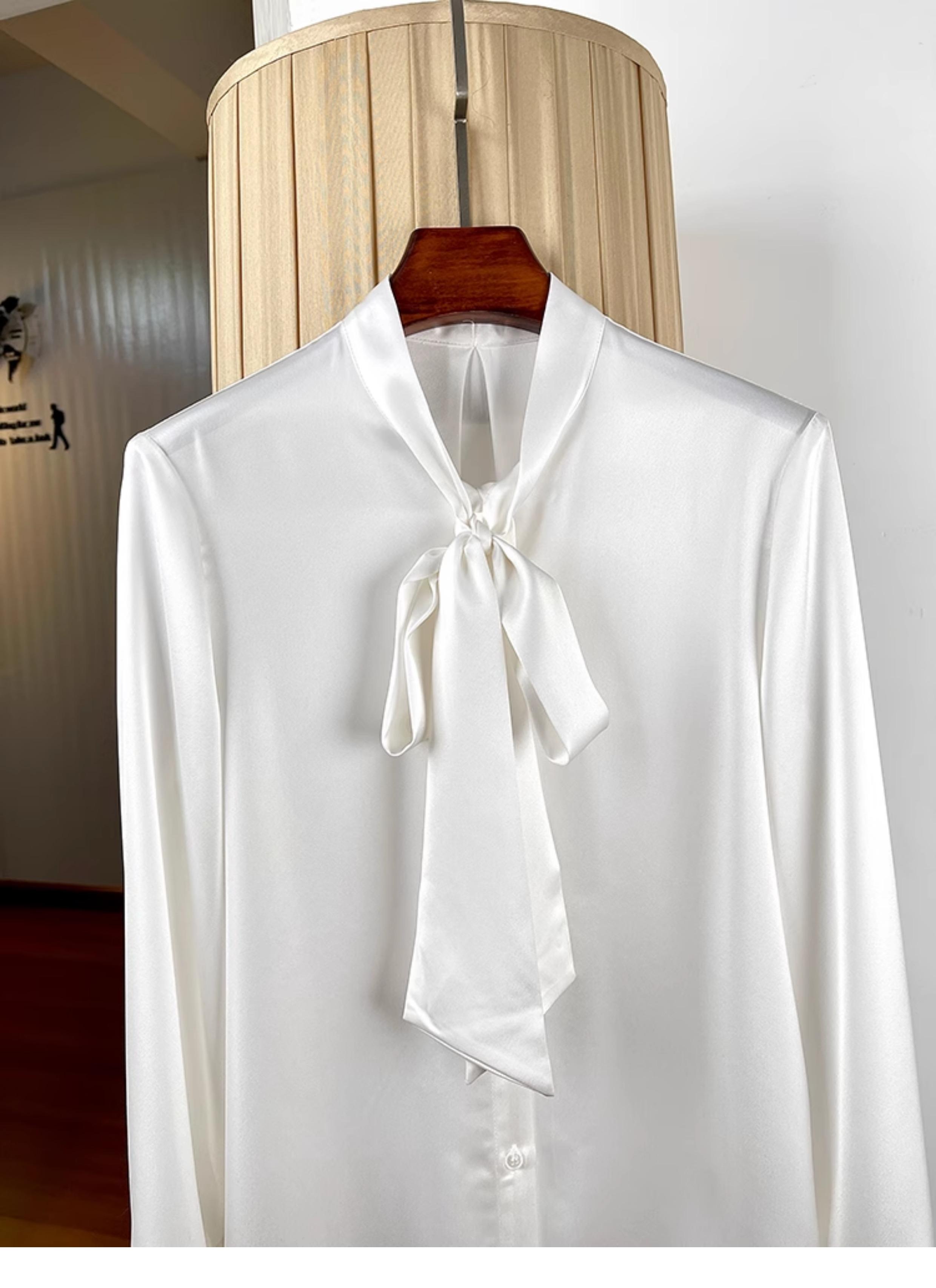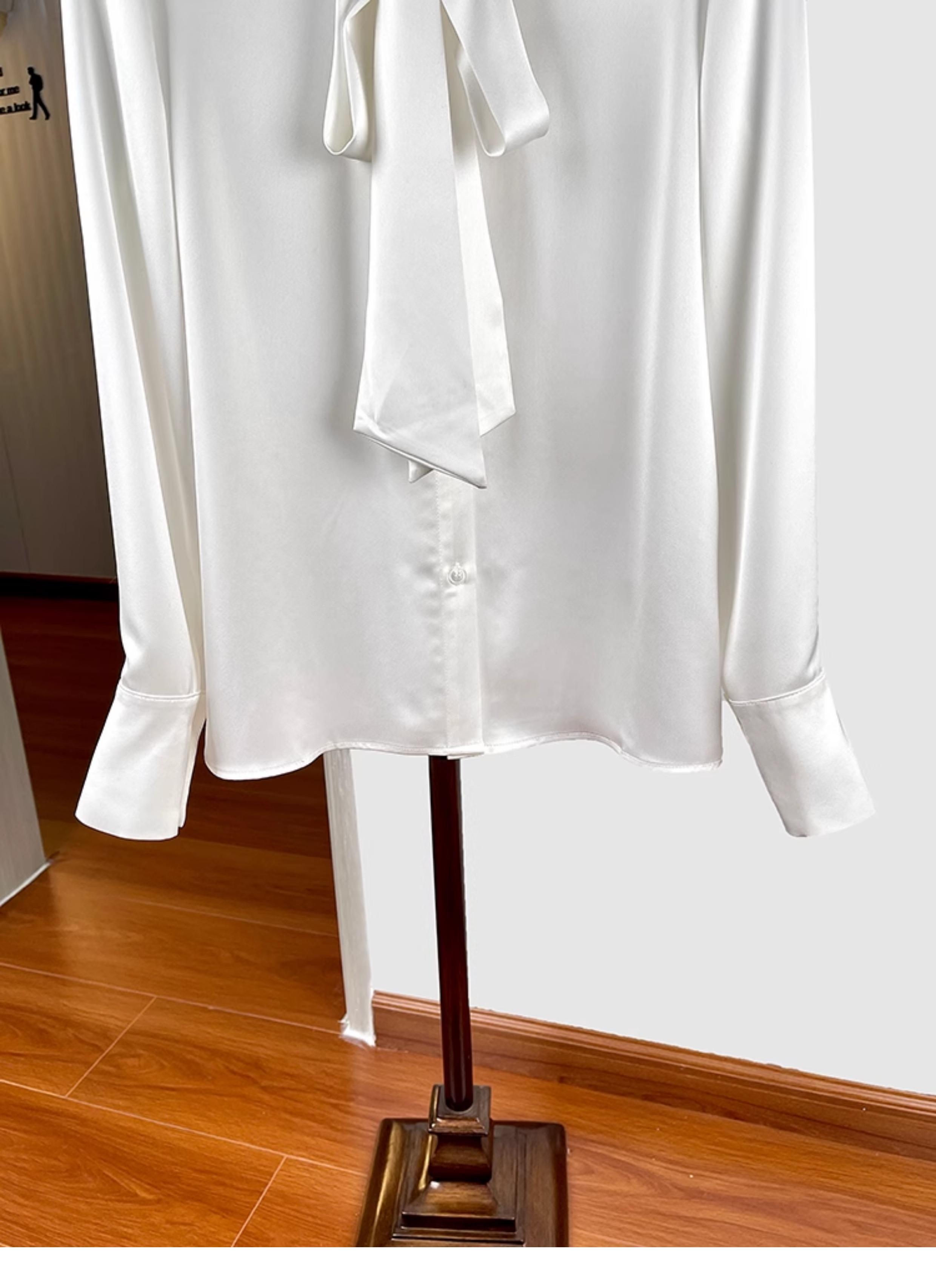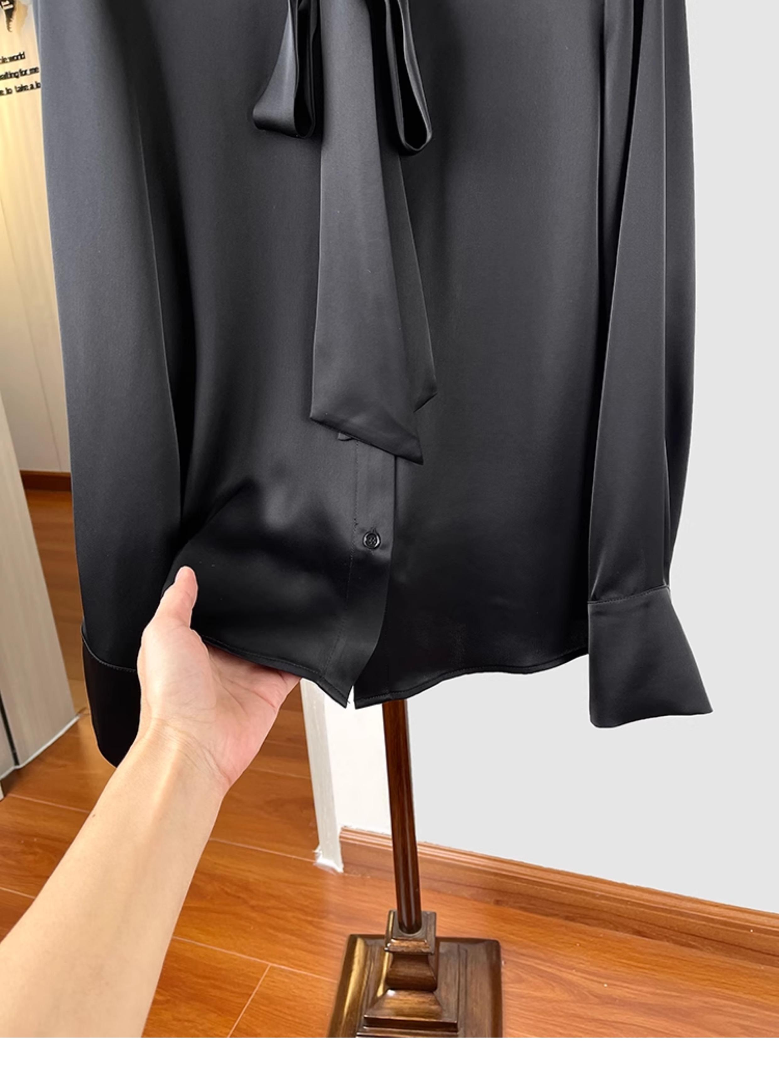 2025 Primavera y Verano Nuevo Elegante Suelto Seda Acetato Lazo Cinta Manga Larga Camisa Top Mujer