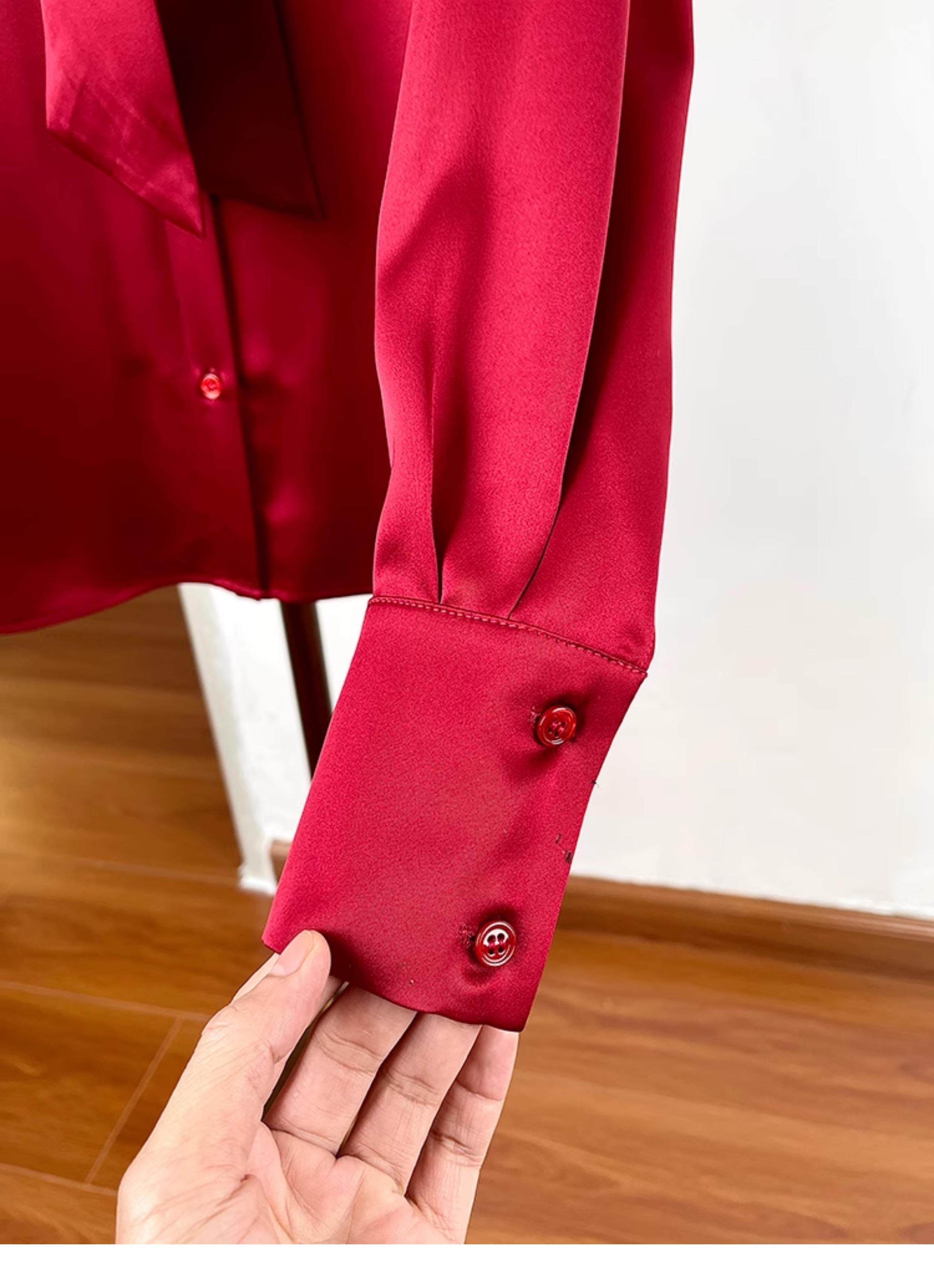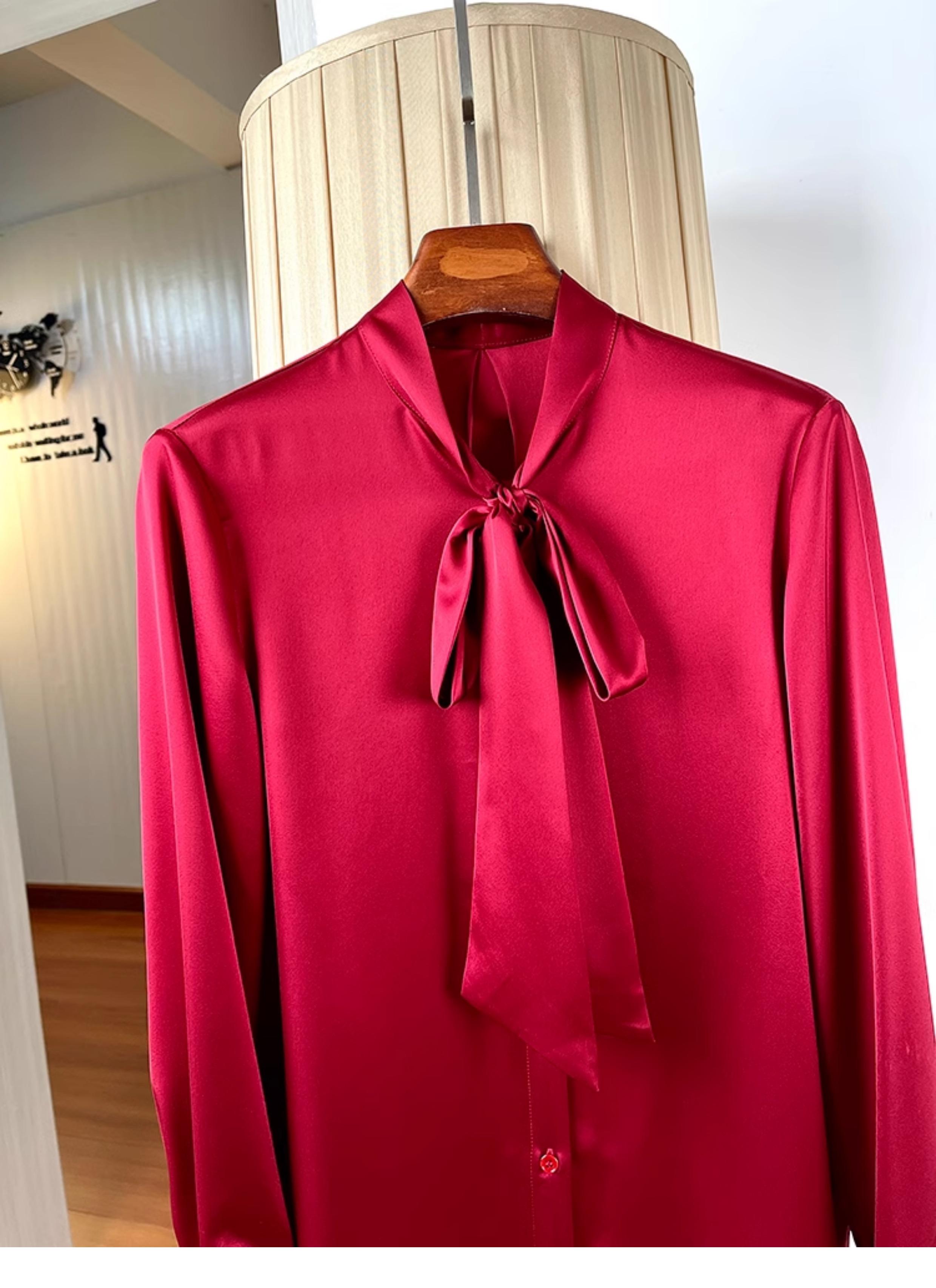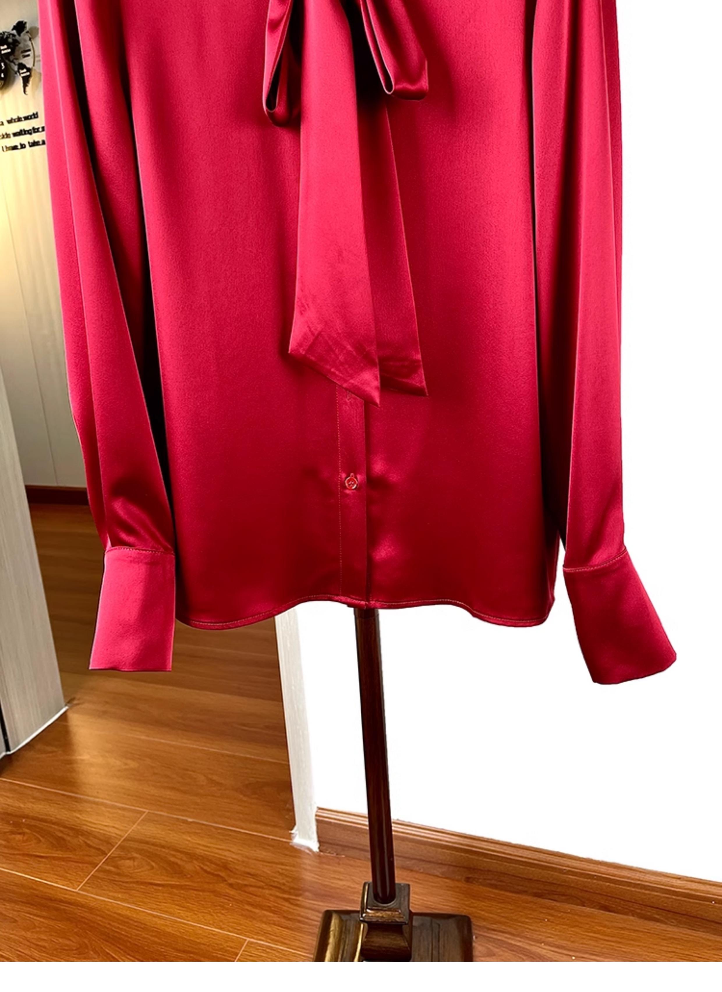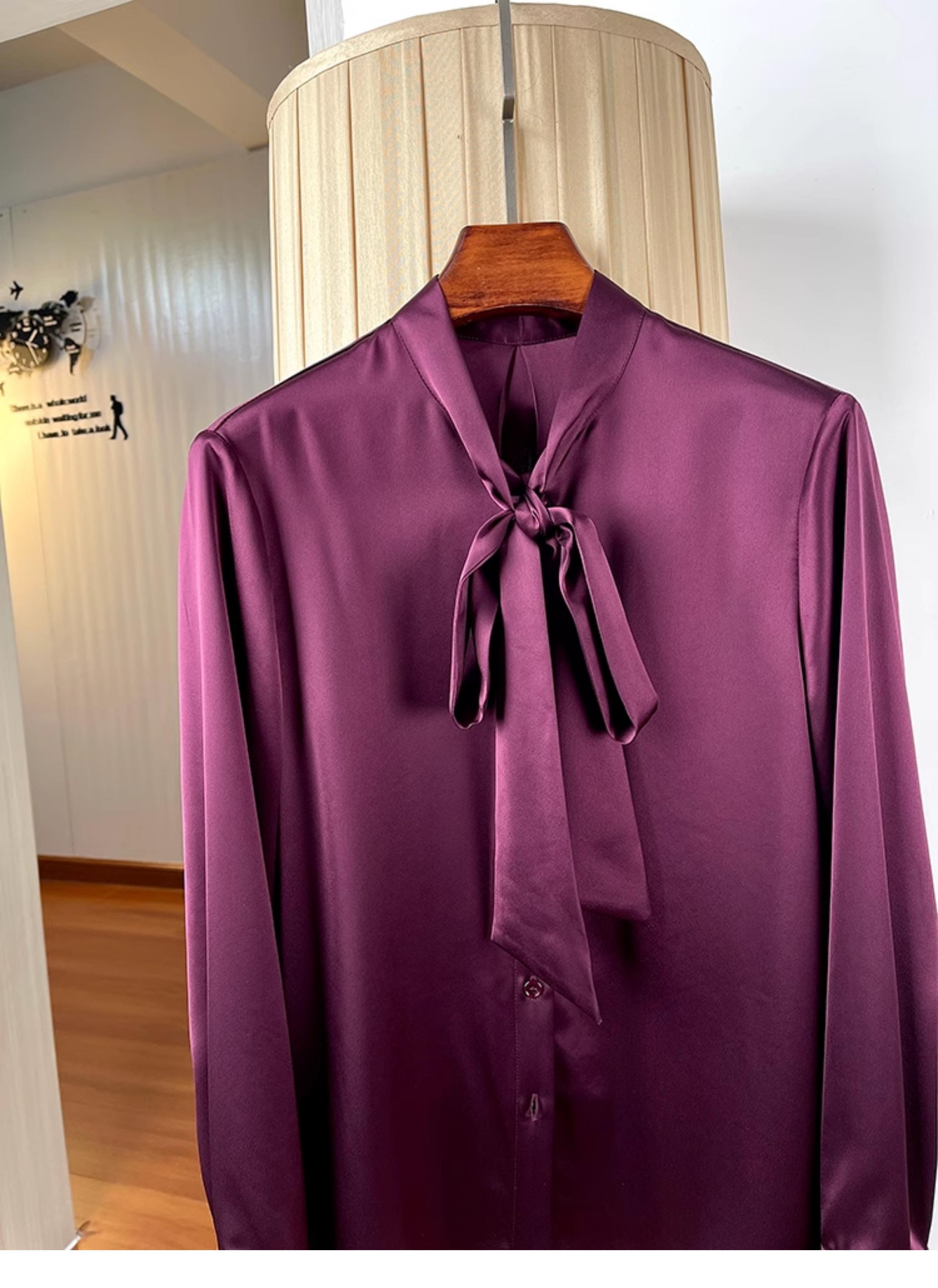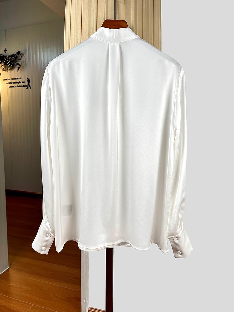 2025 Primavera y Verano Nuevo Elegante Suelto Seda Acetato Lazo Cinta Manga Larga Camisa Top Mujer
