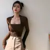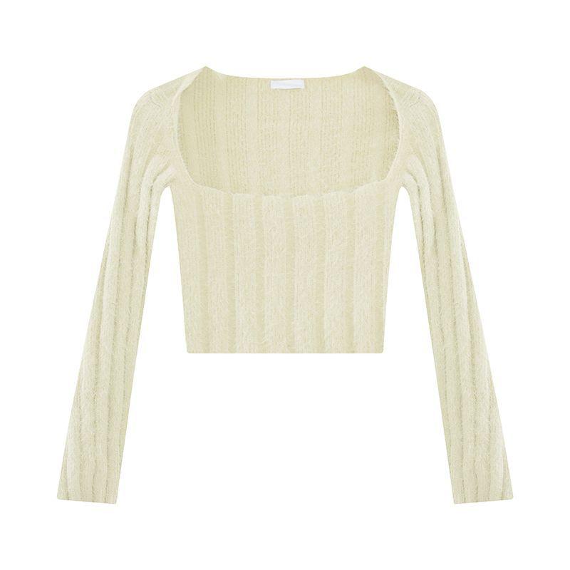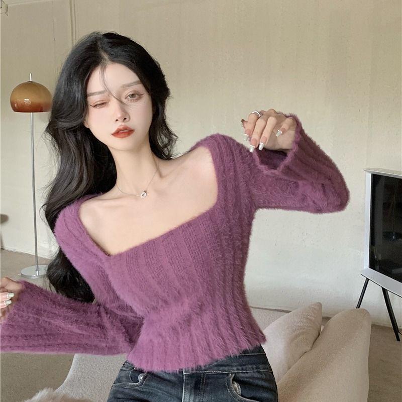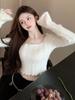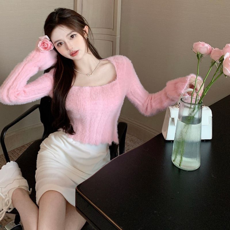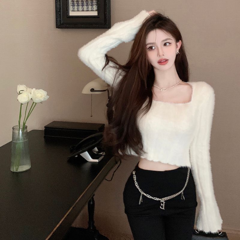 Invierno Cuello Cuadrado Moda Suave Cera Suéter Camiseta Dulce Chica Picante Sexy Deseo Puro Corto Grueso Tejido Camisa Top Ins Mujeres