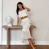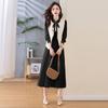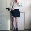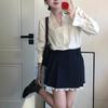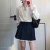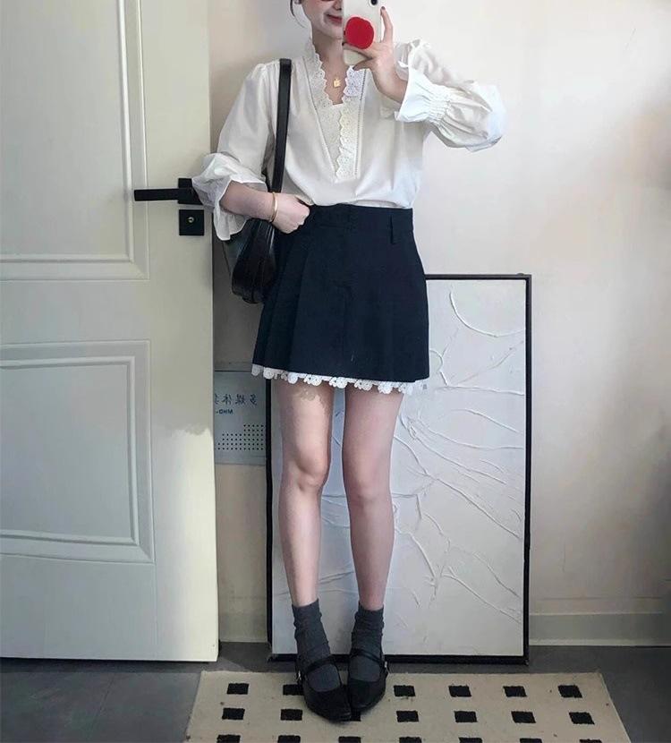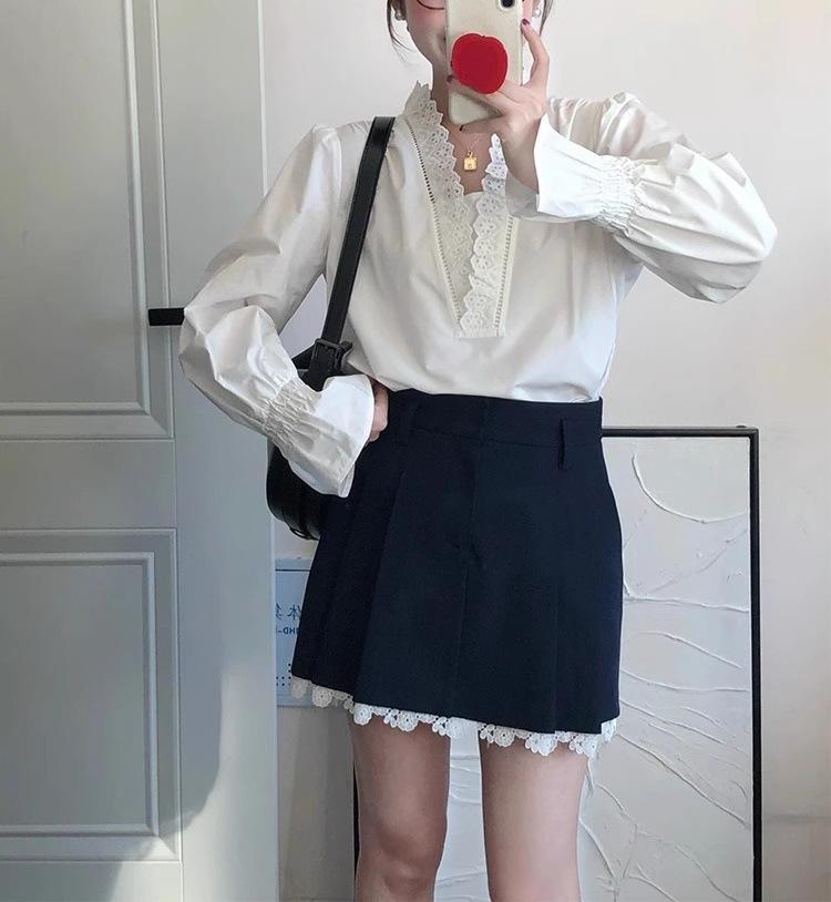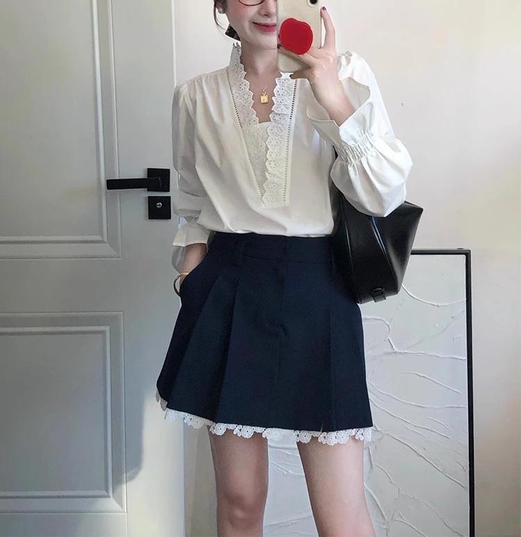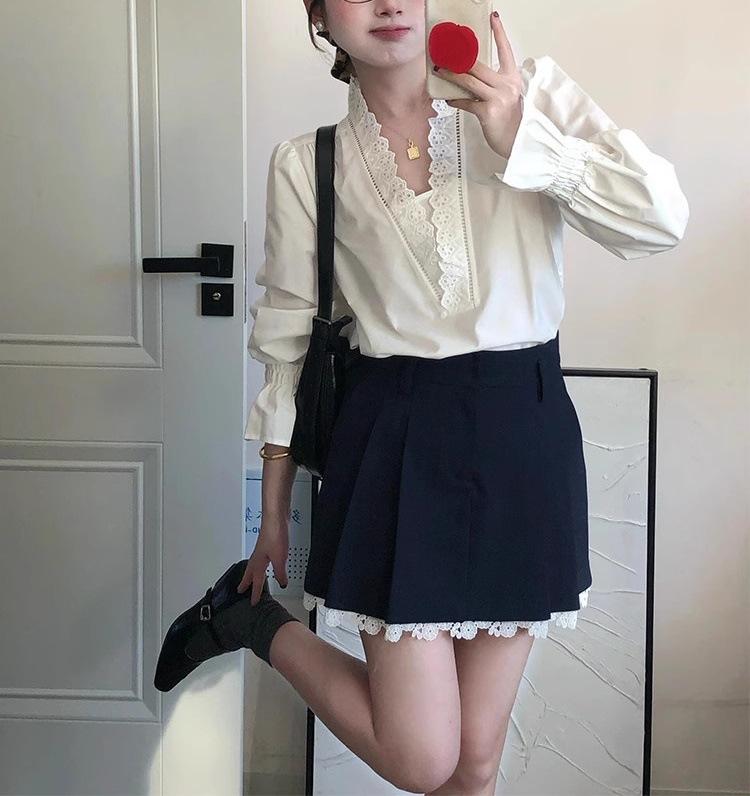 Hermoso traje de primavera y otoño de estilo francés 2025, nuevo conjunto de dos piezas con camisa y falda con costuras de encaje y escote en V ajustado.