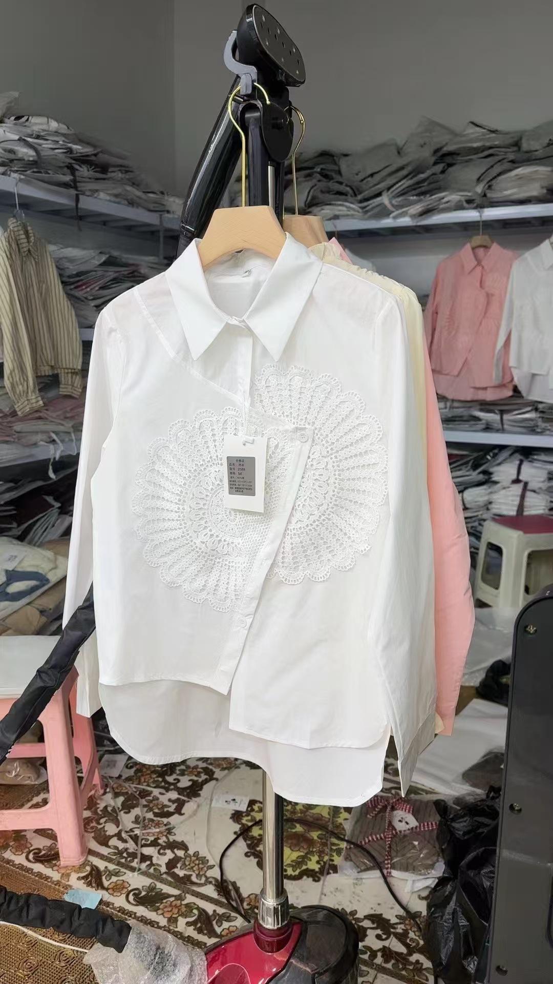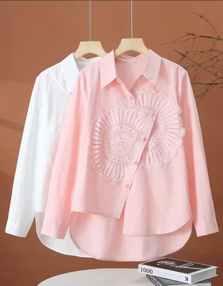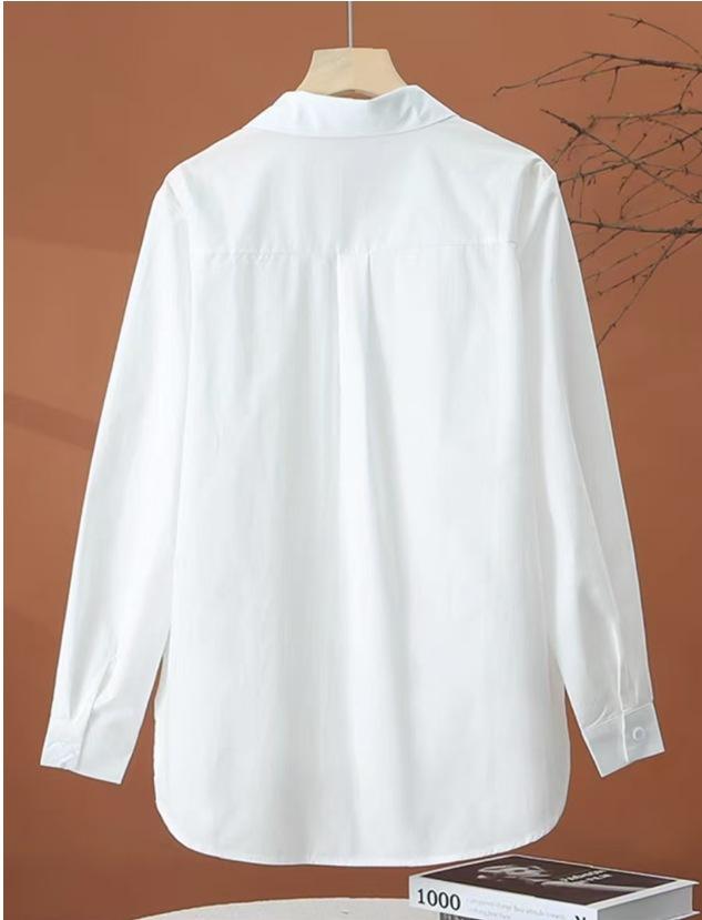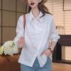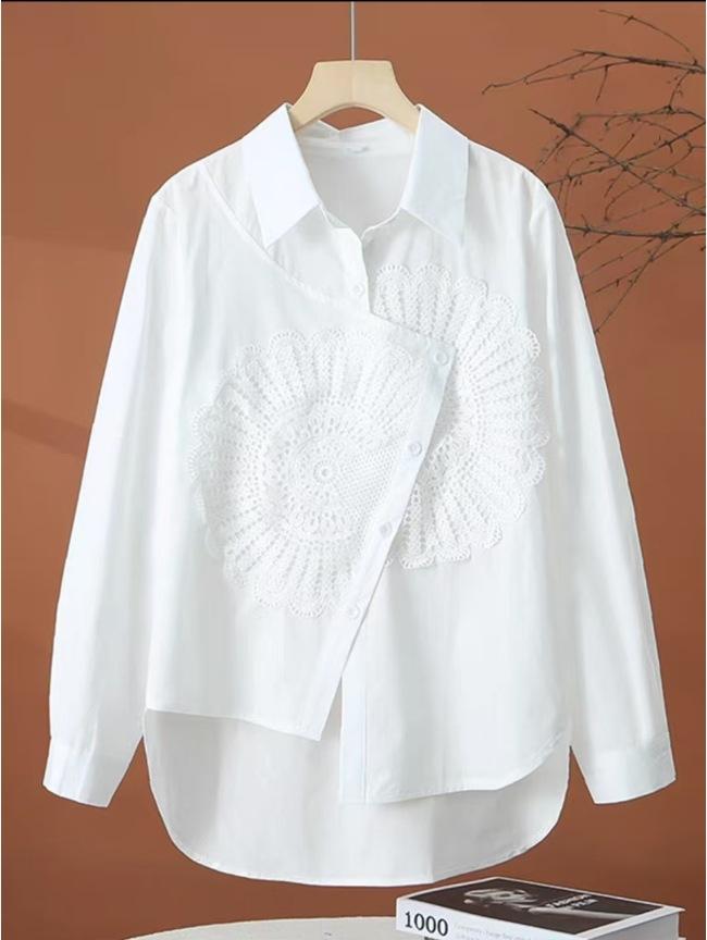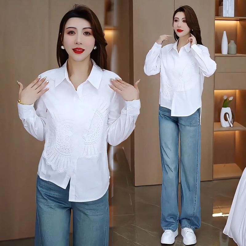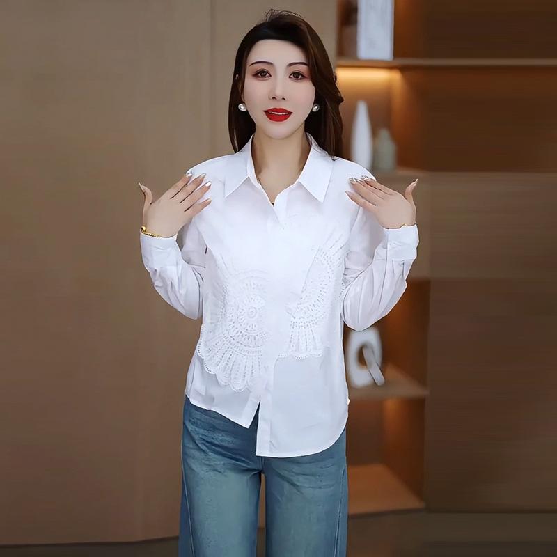 Camisa blanca para mujer 2025, nuevo diseño, costuras de encaje, suelta, a la moda, reductora de edad, top apilado