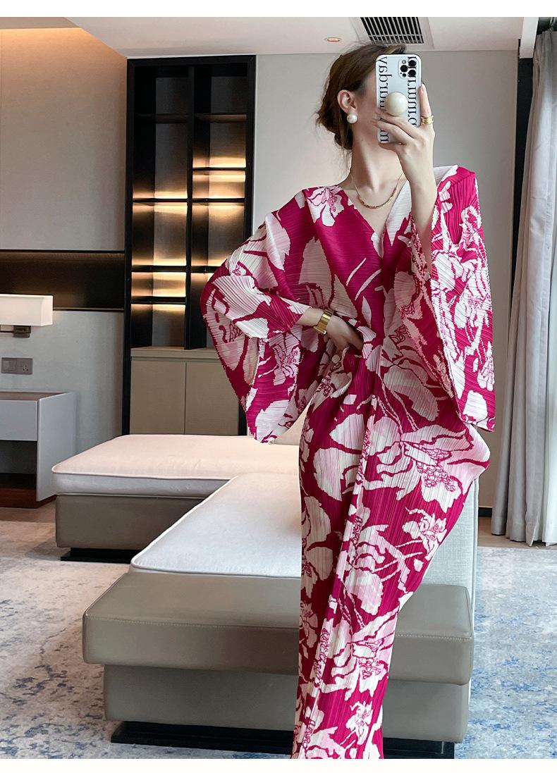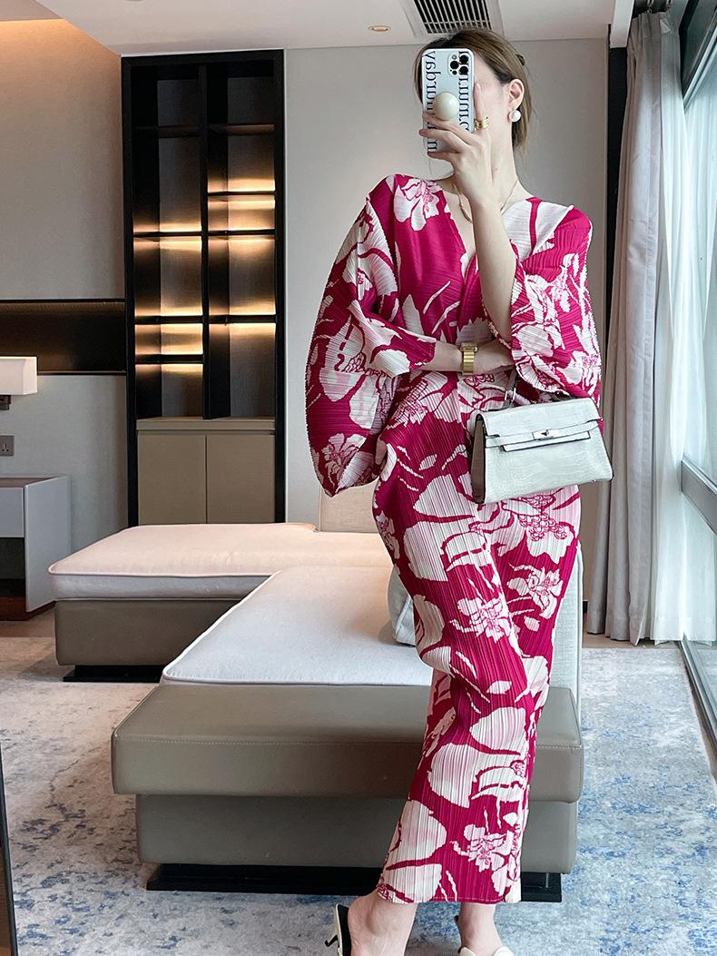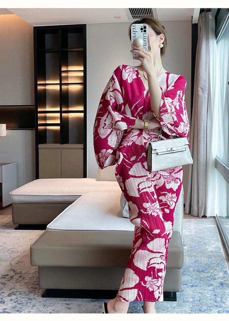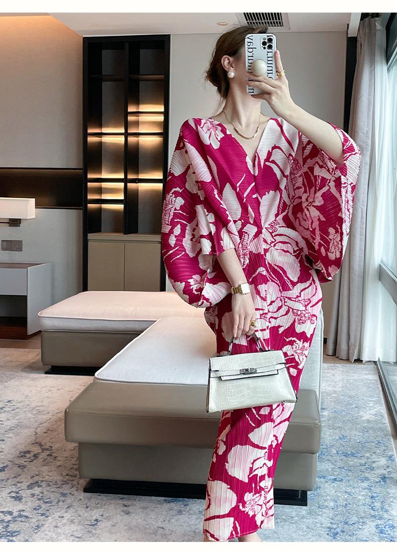Miyake Otoño Nuevo Vestido Largo Estampado Suelto Cuello en V Entallado Adelgazante Plisado Elegante Vestido de Alta Gama
