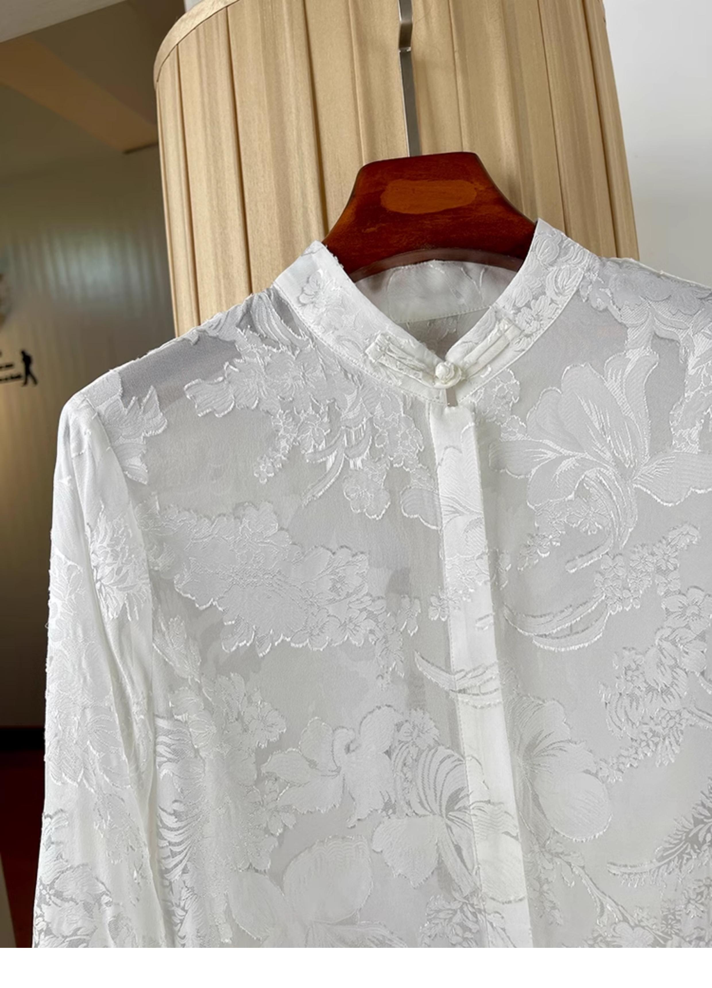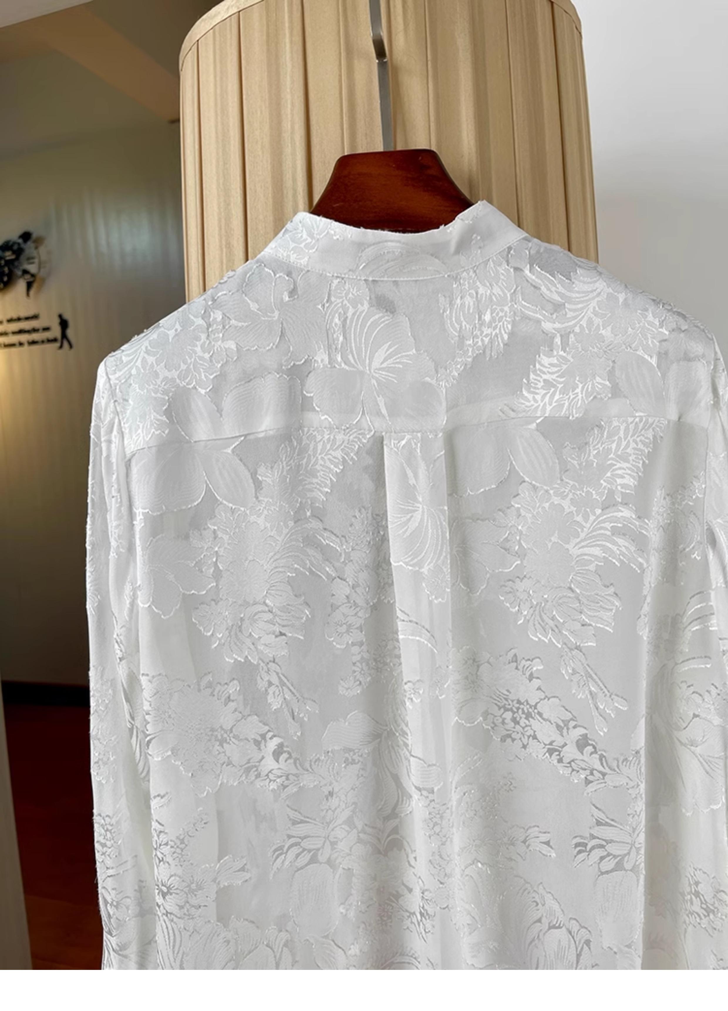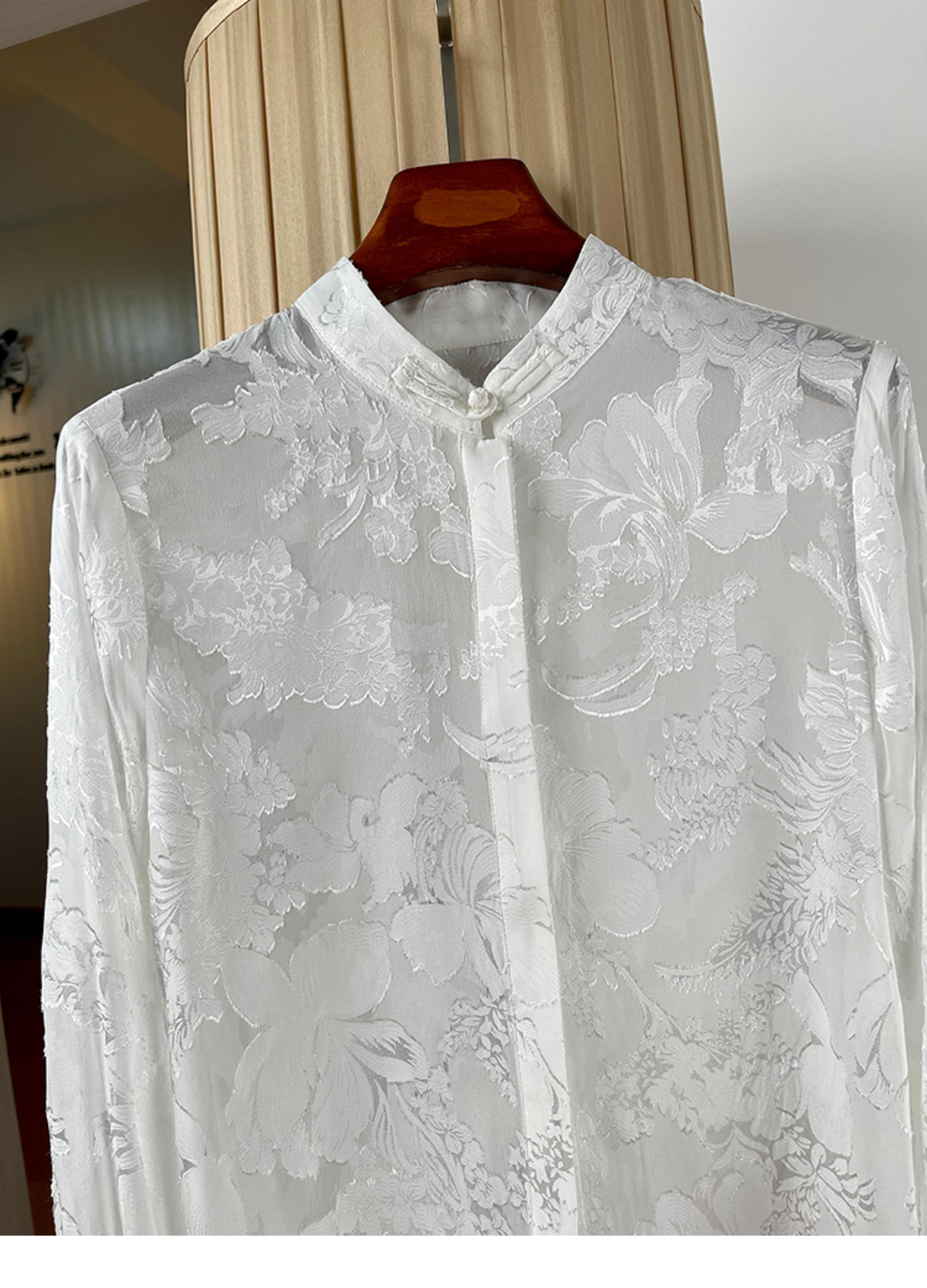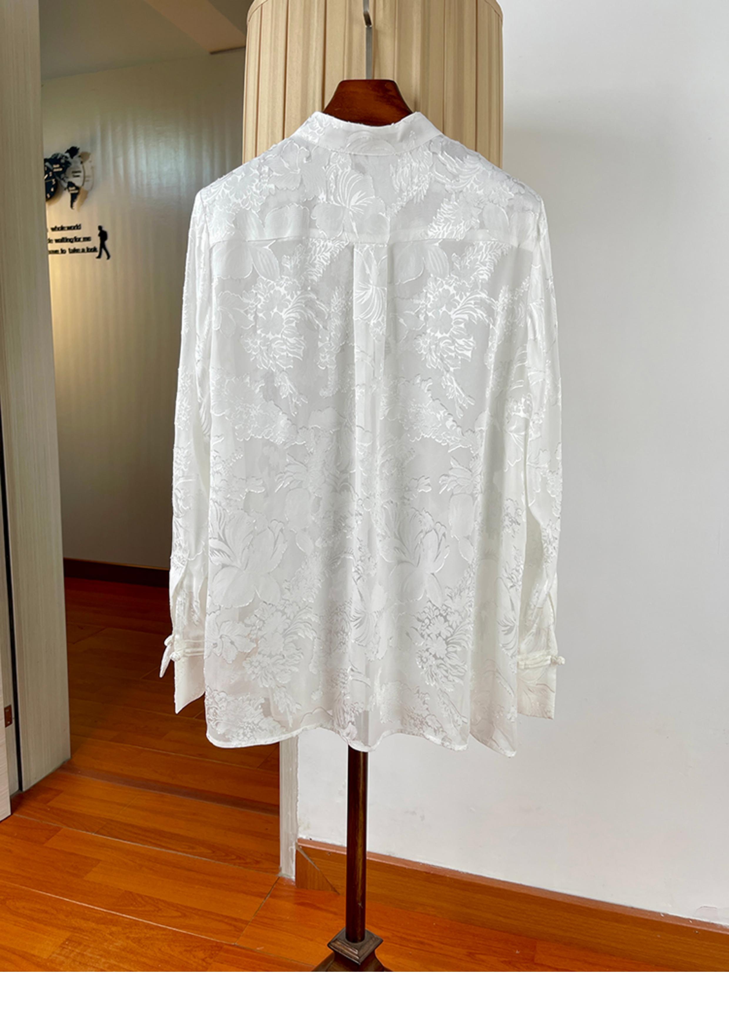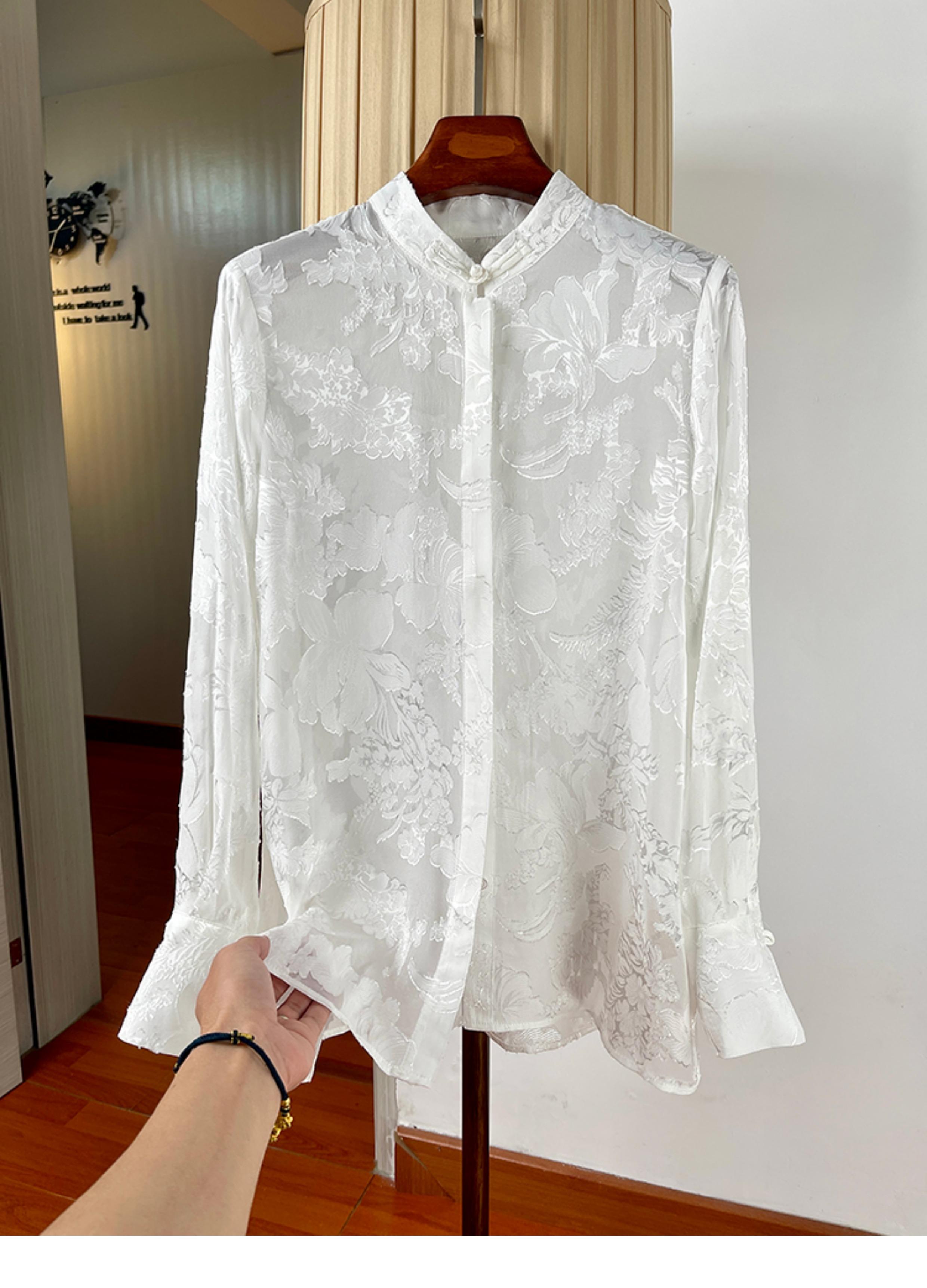 Camisa de seda hueca con flores quemadas, estilo nacional ligero, de manga larga y cuello holgado, con botones, de jacquard y seda morera, para mujer