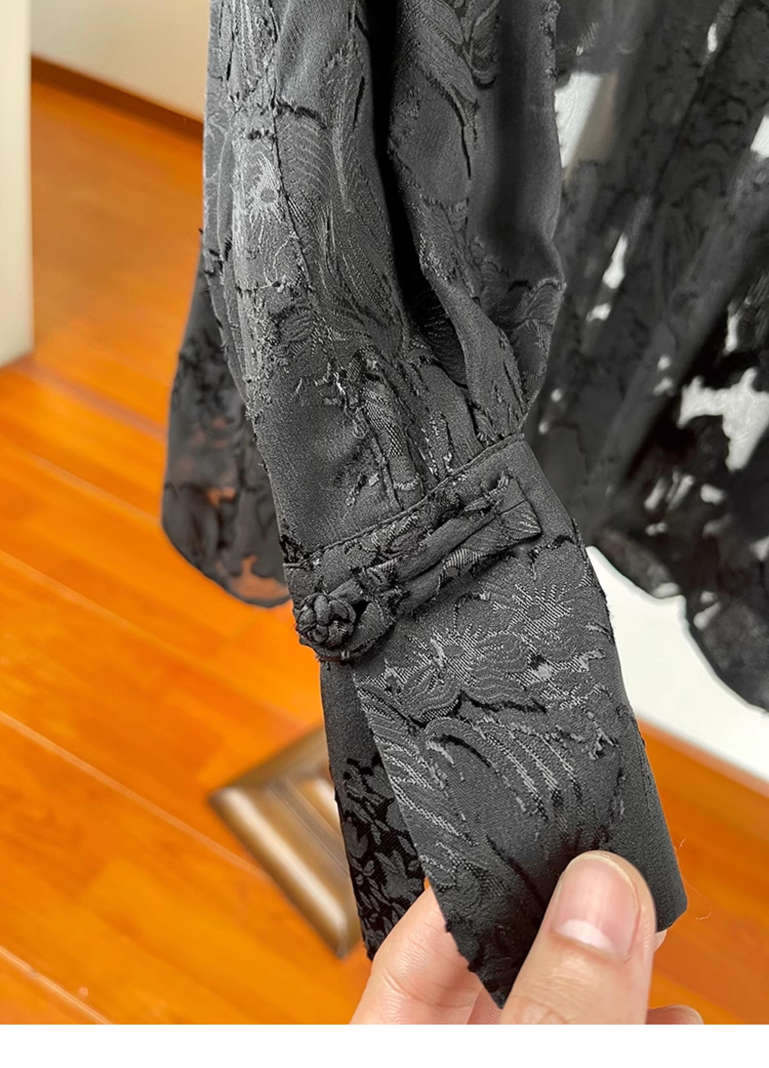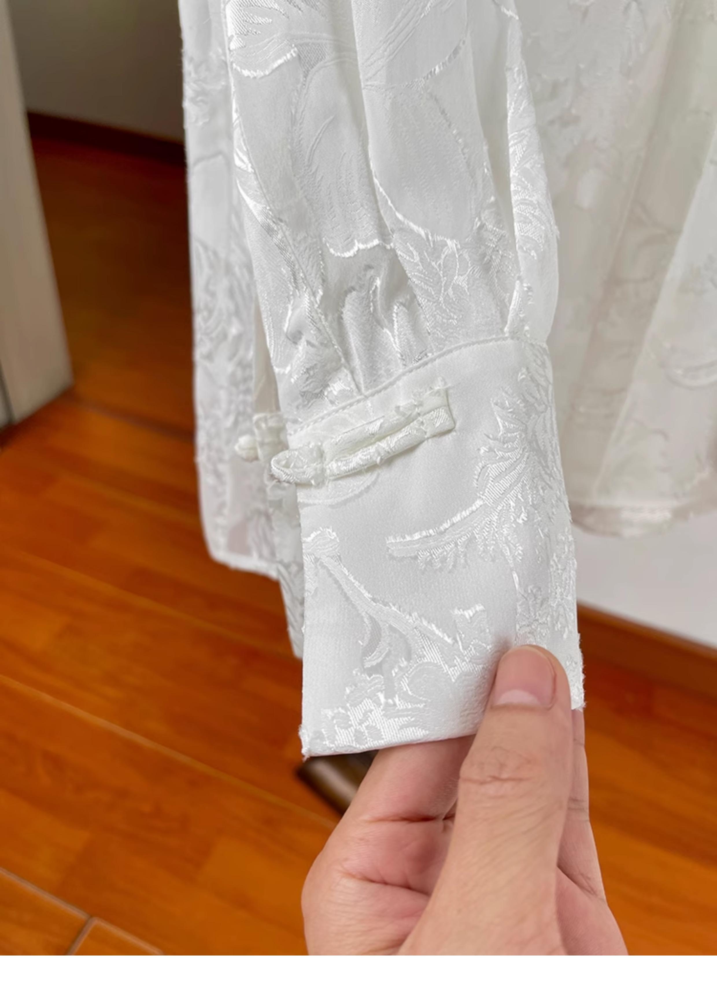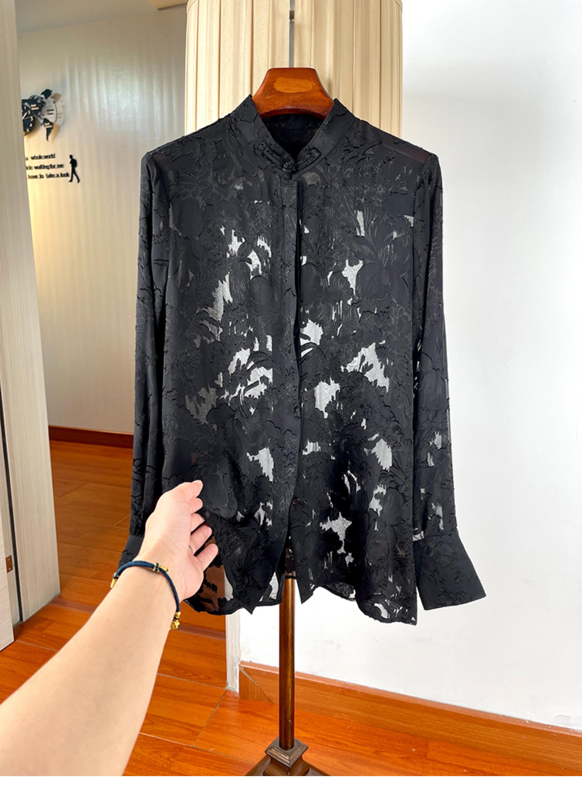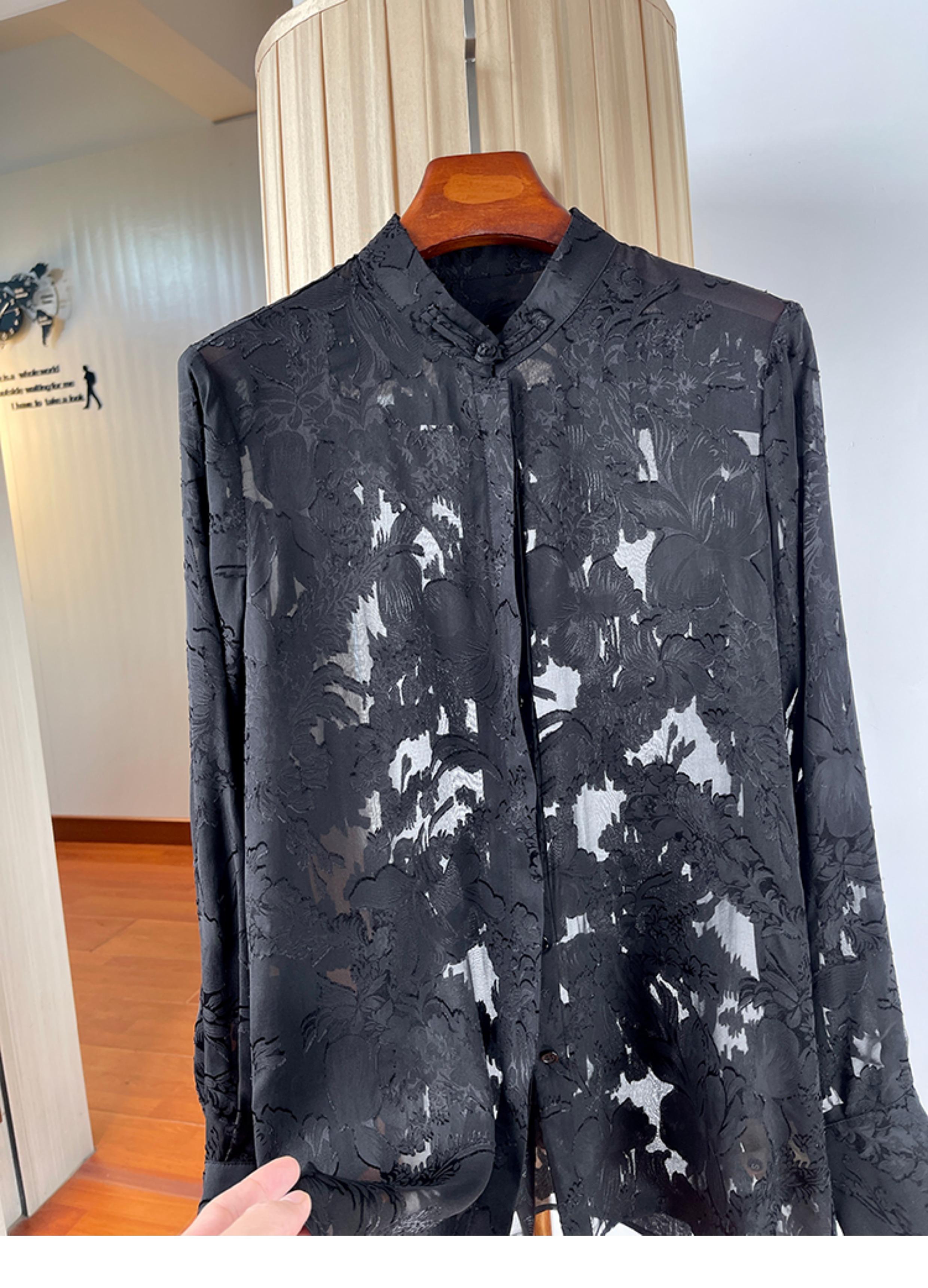 Camisa de seda hueca con flores quemadas, estilo nacional ligero, de manga larga y cuello holgado, con botones, de jacquard y seda morera, para mujer