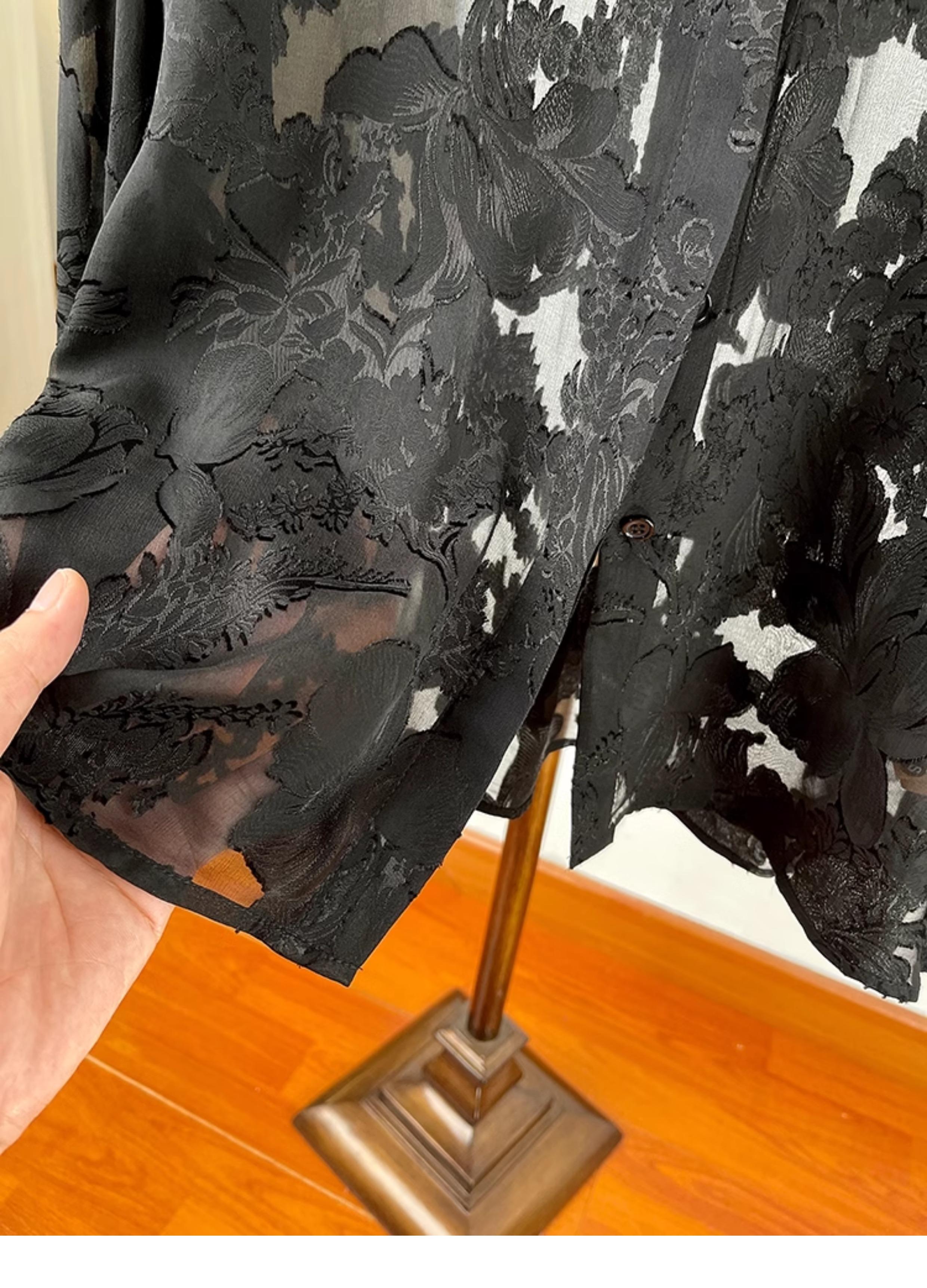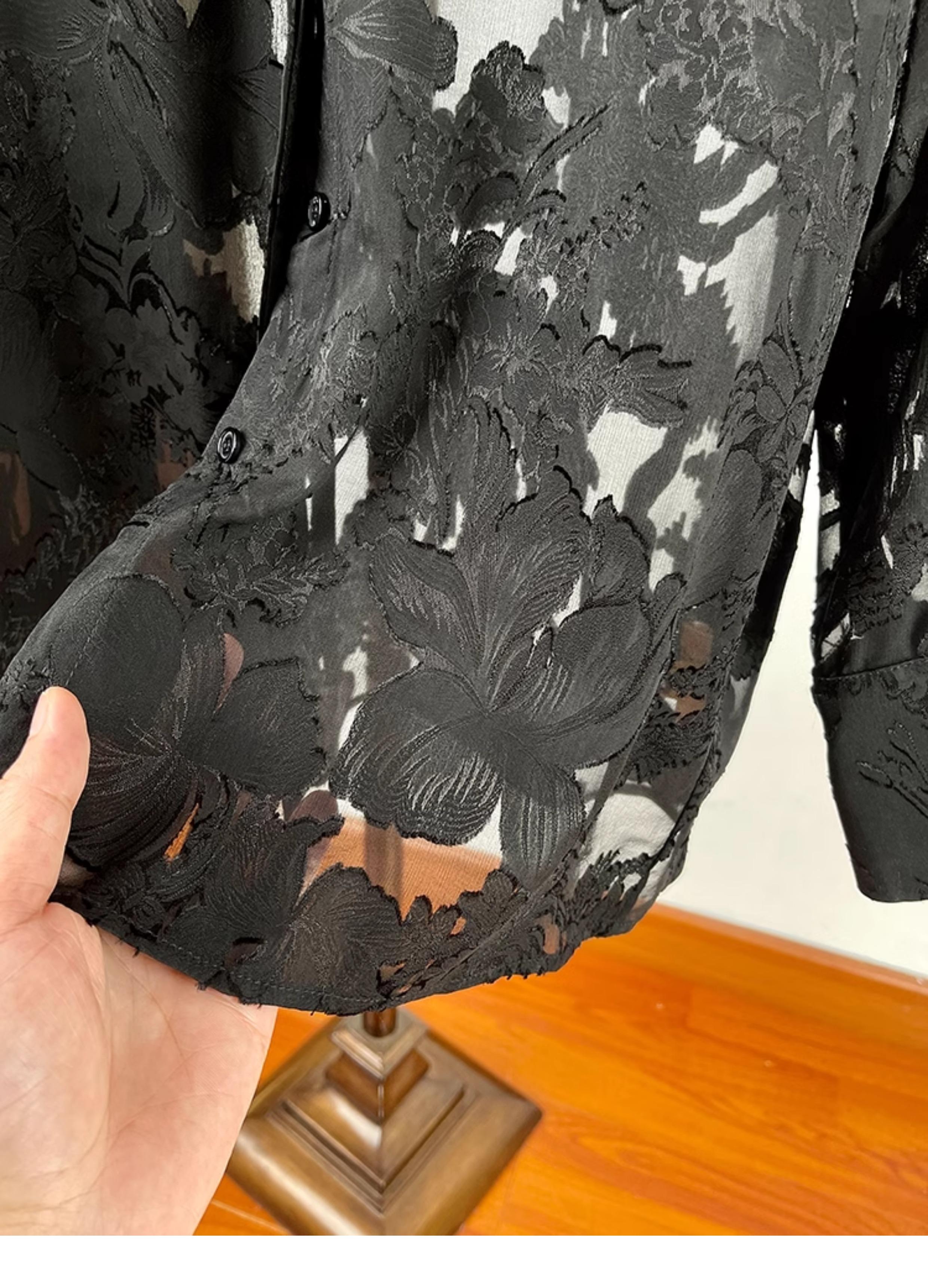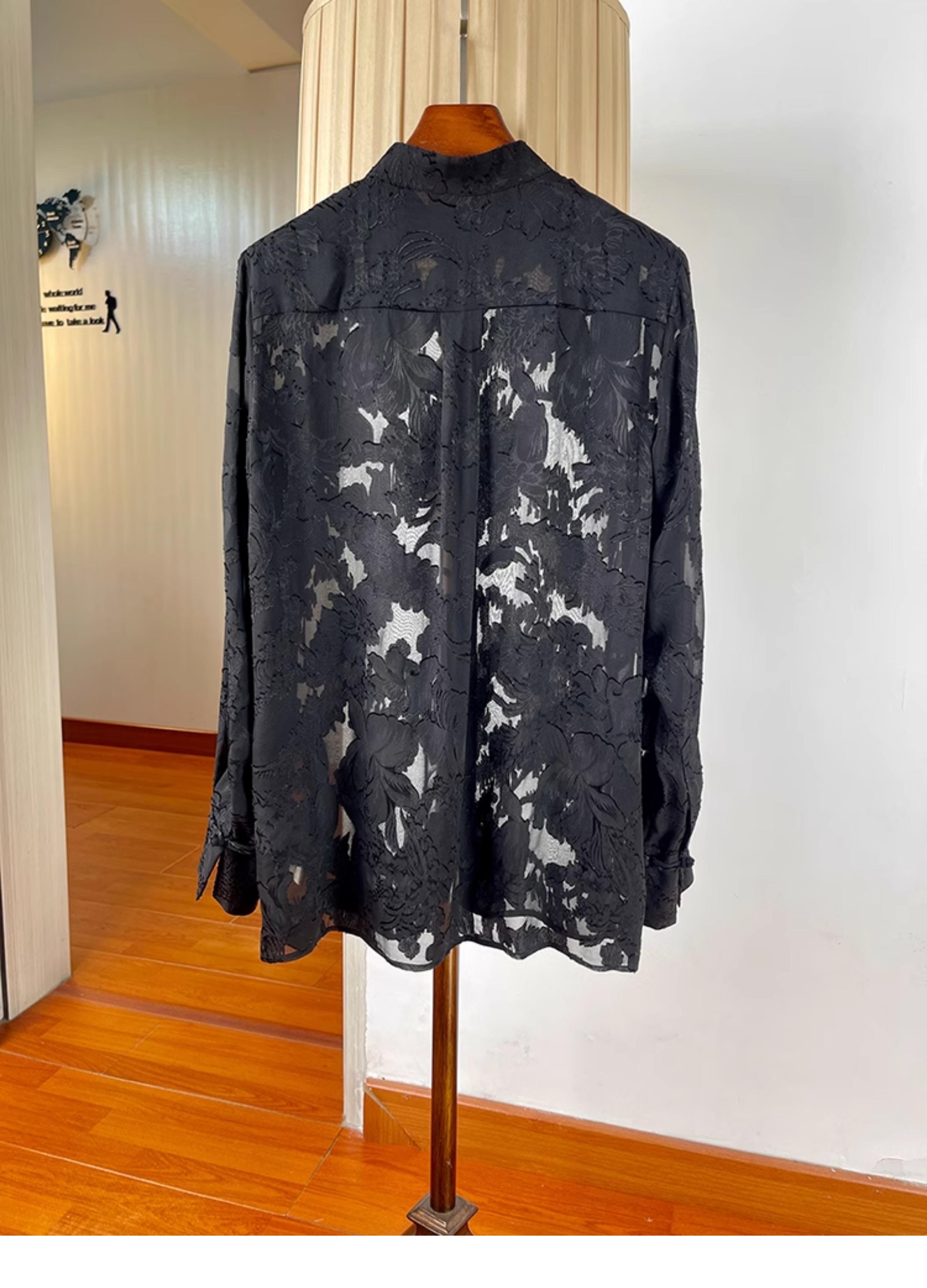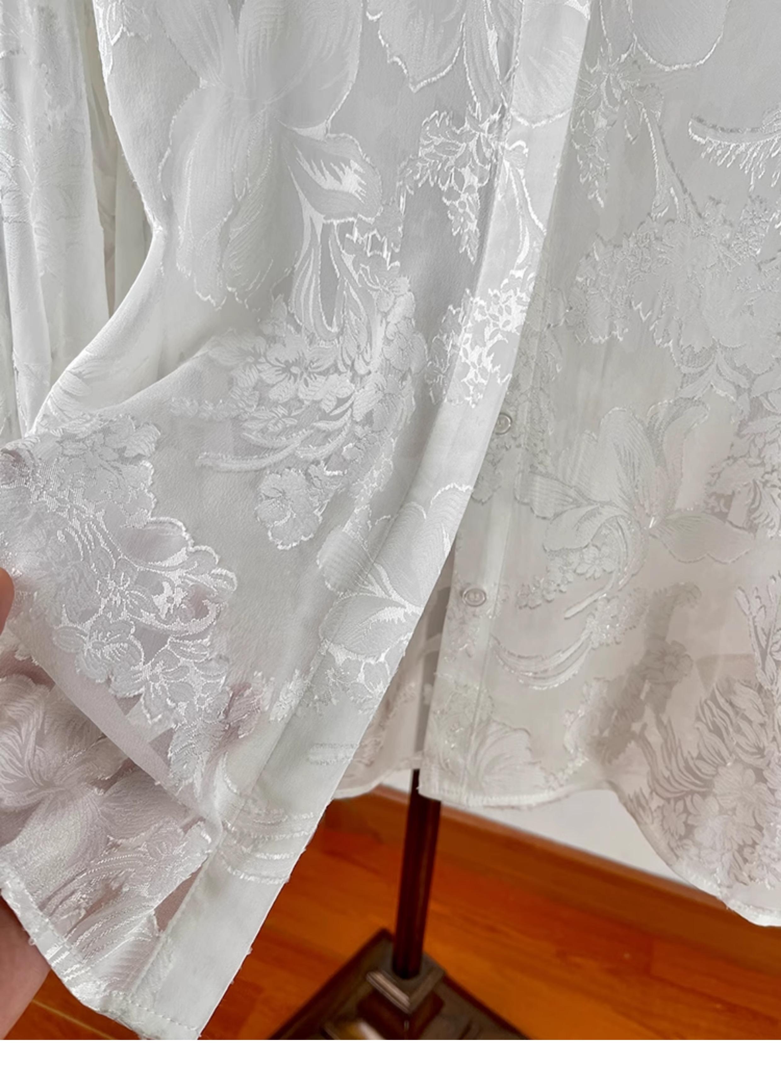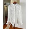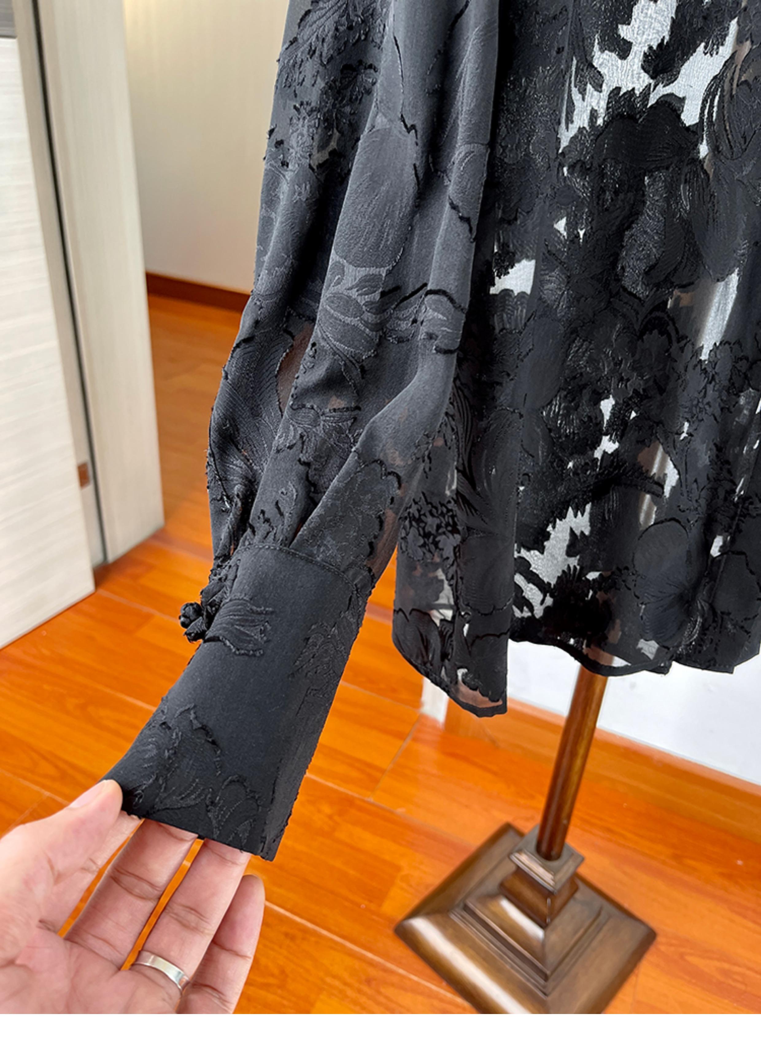 Camisa de seda hueca con flores quemadas, estilo nacional ligero, de manga larga y cuello holgado, con botones, de jacquard y seda morera, para mujer