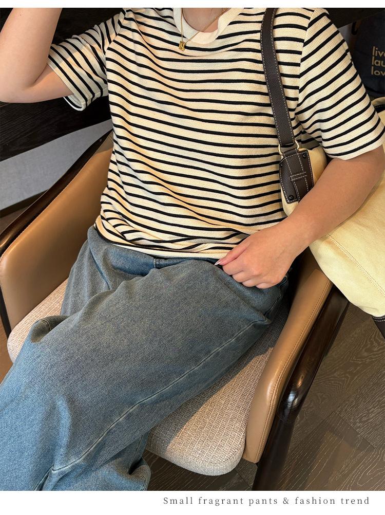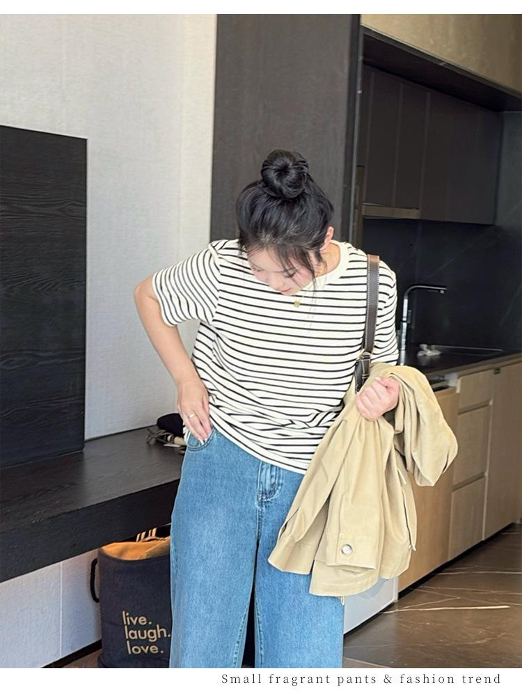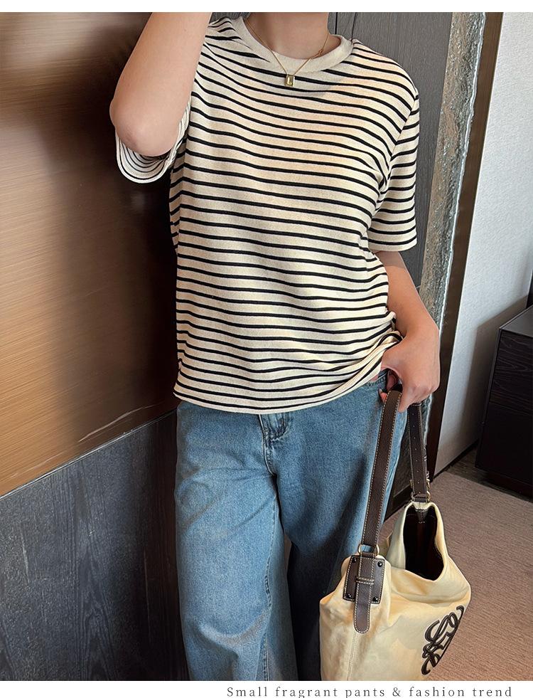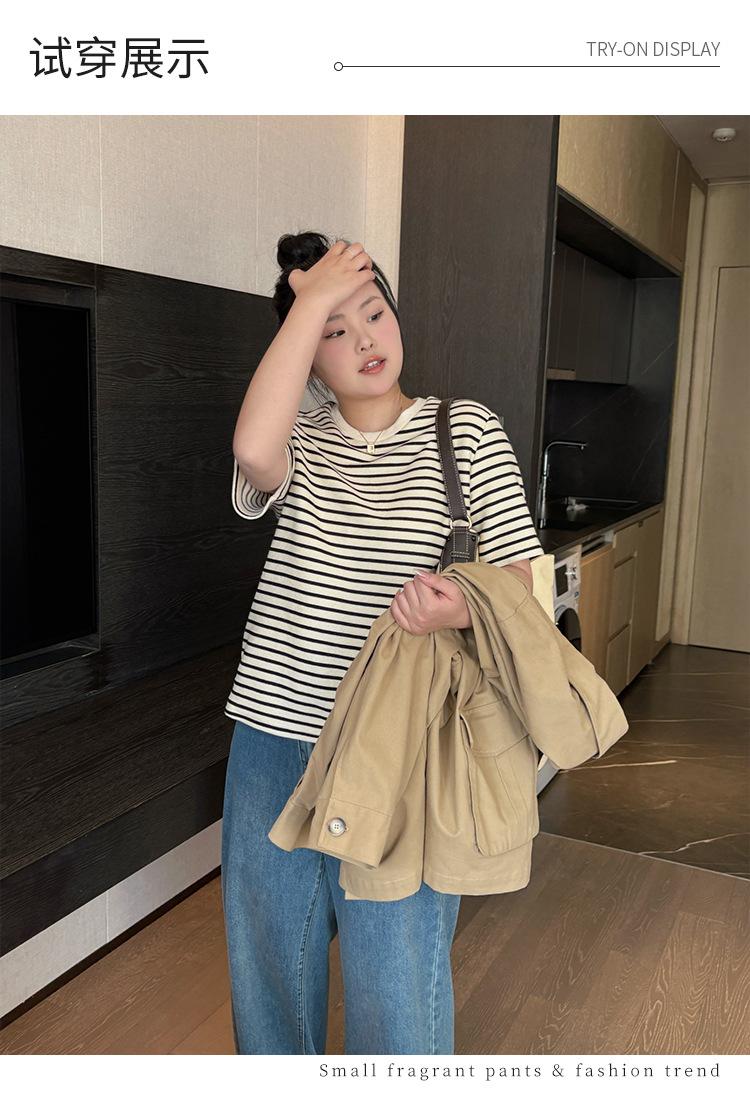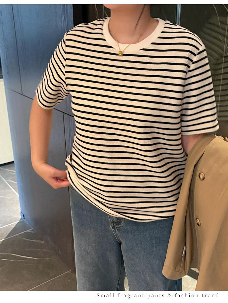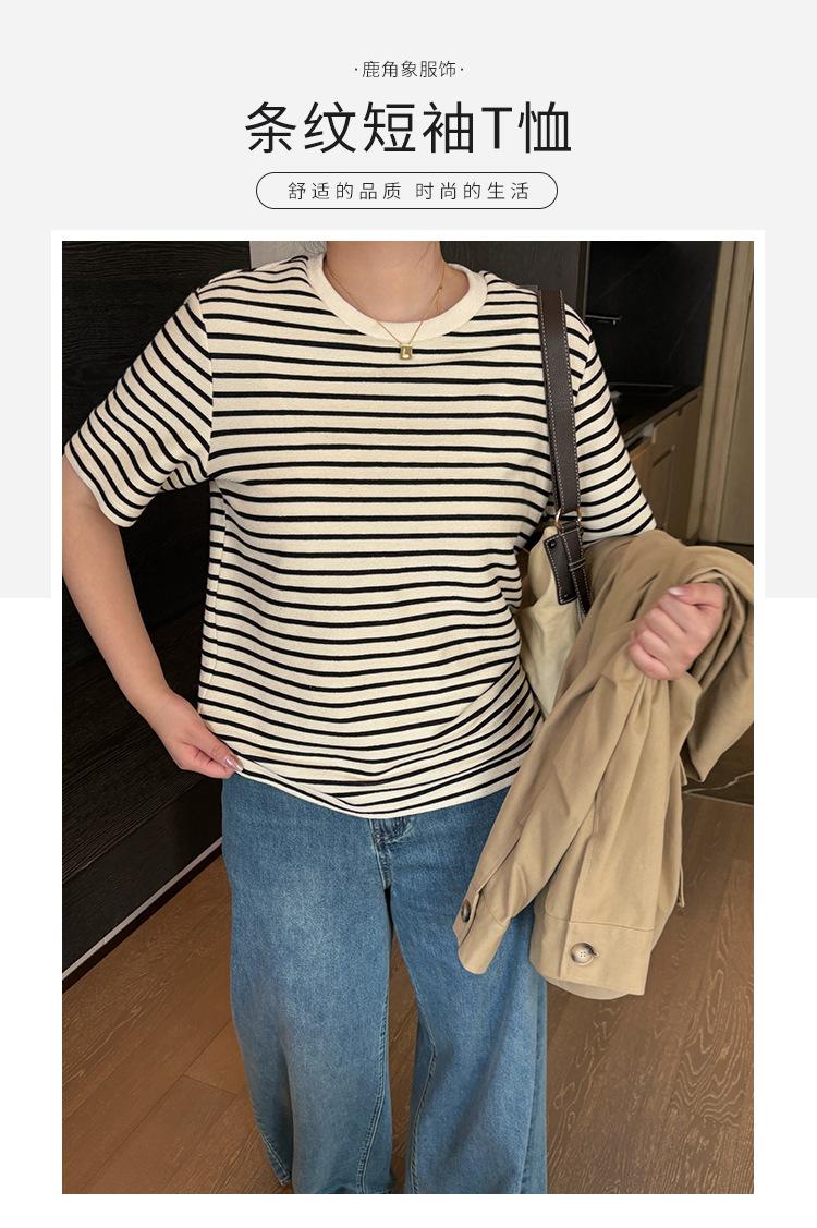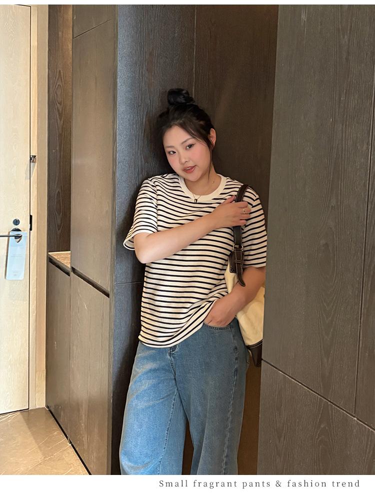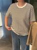 Camiseta de manga corta con cuello redondo y base pequeña para mujer, estilo vintage a rayas, nueva, de talla grande