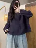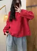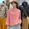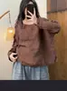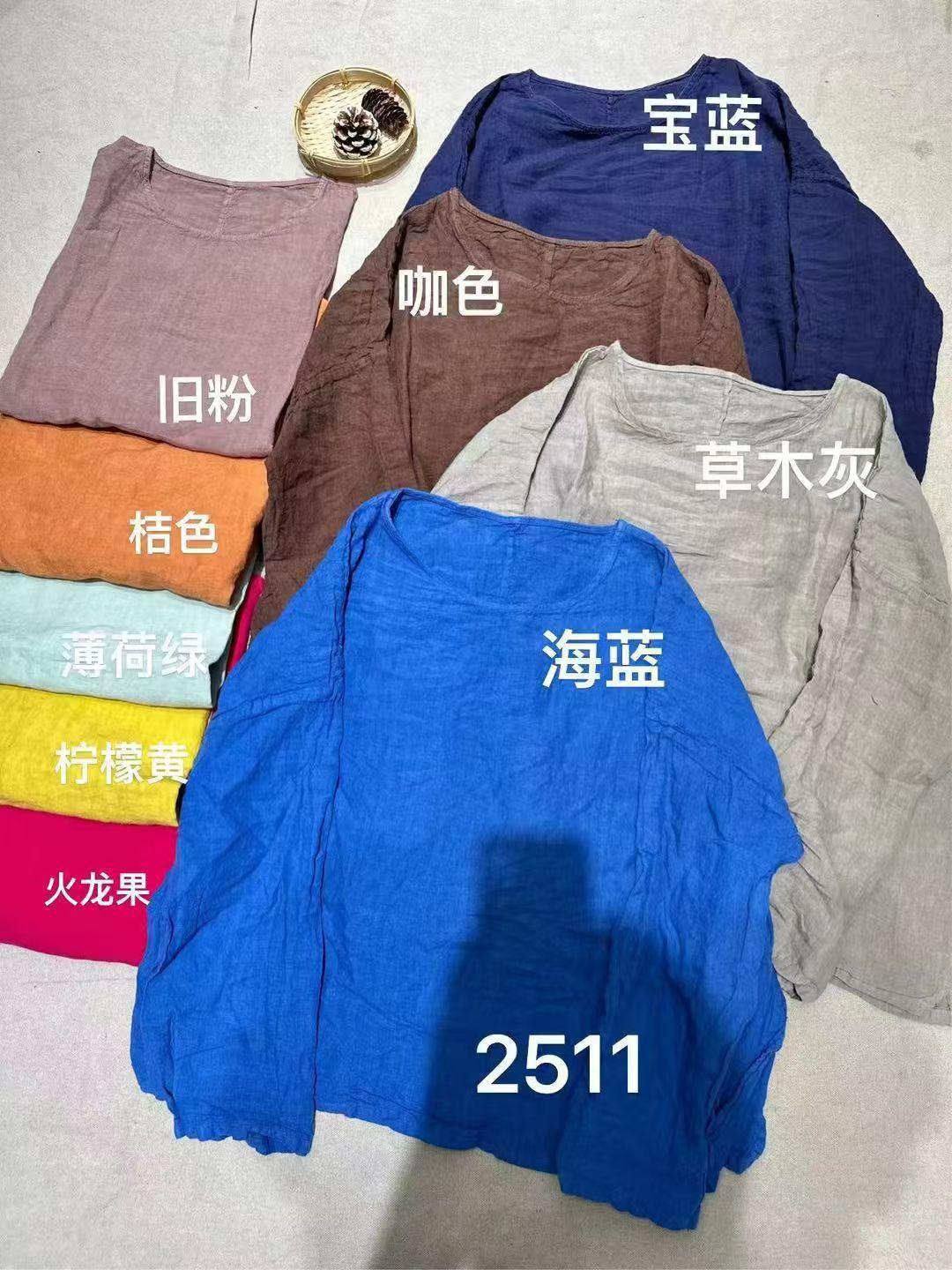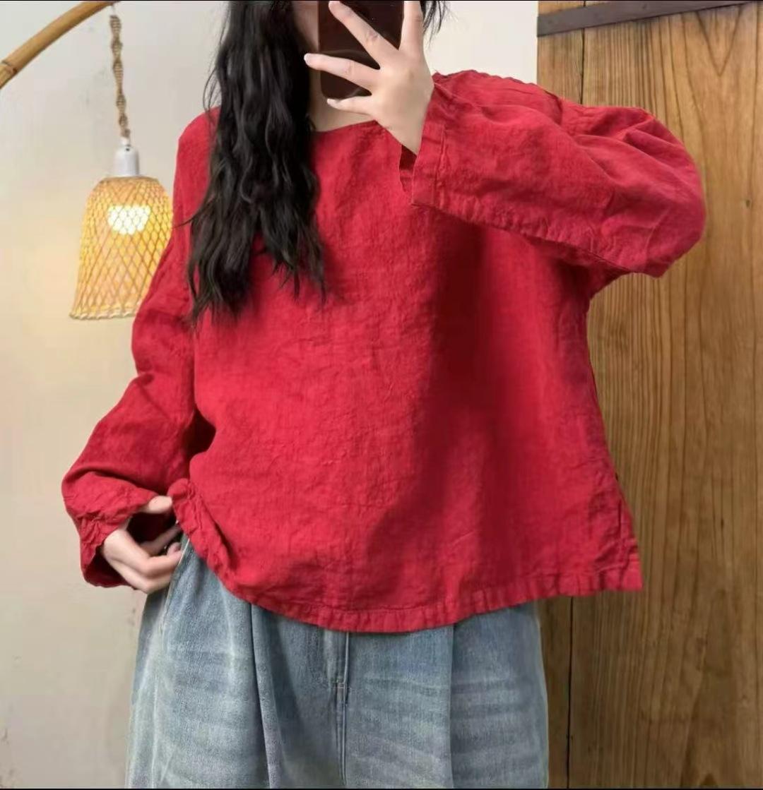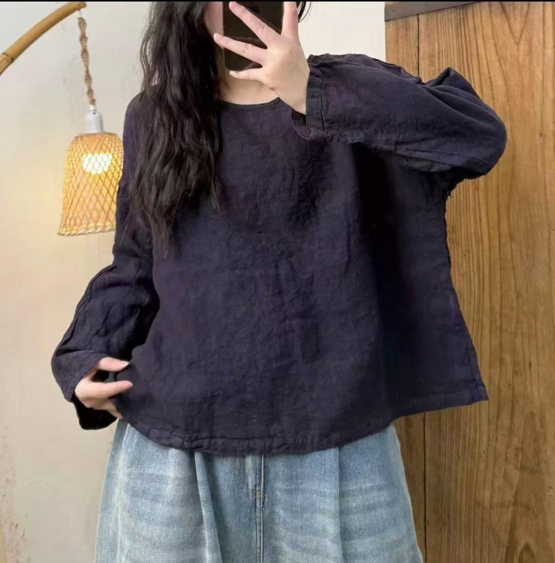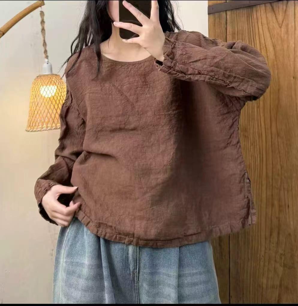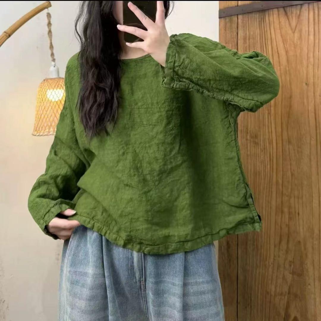 Camisa de lino de alta gama para mujer, cuello redondo, primavera y verano 2025, nueva, suelta, combinable, color sólido, estilo simple, manga larga, top artístico