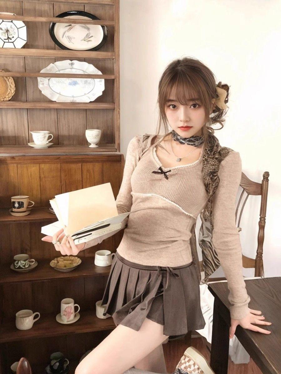 Camiseta de manga larga con cuello cuadrado, estilo americano, con encaje otoñal, para chica sexy y entallada, con cuello cuadrado, estilo Pure Desire, top sexy de nicho.