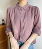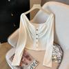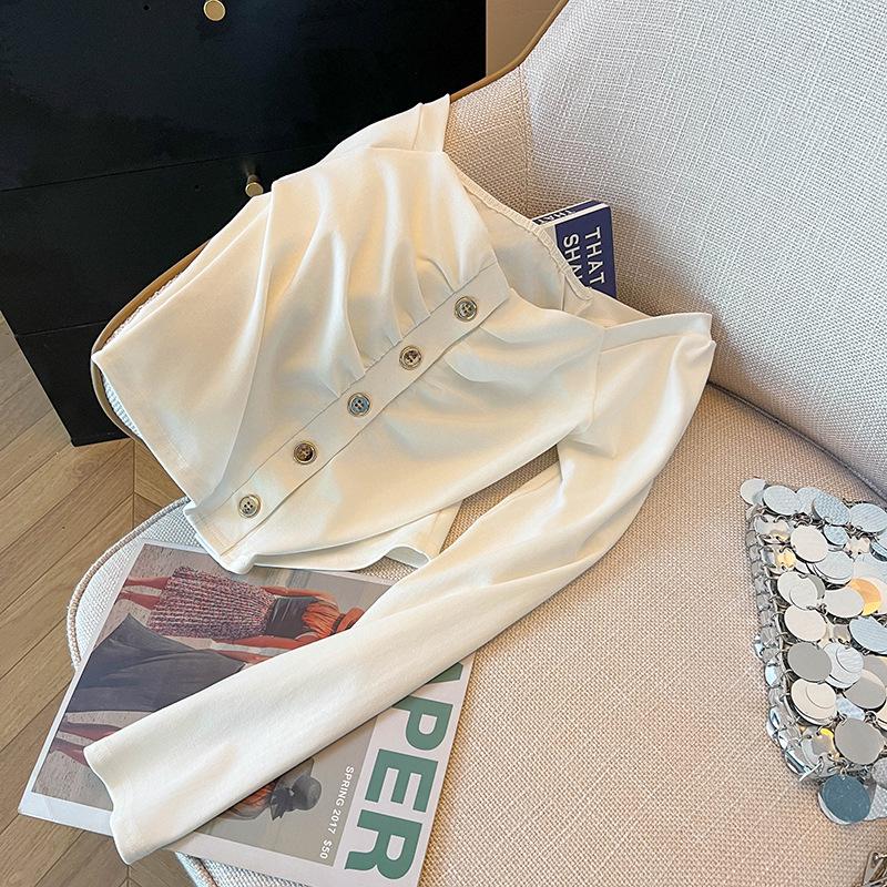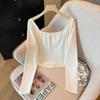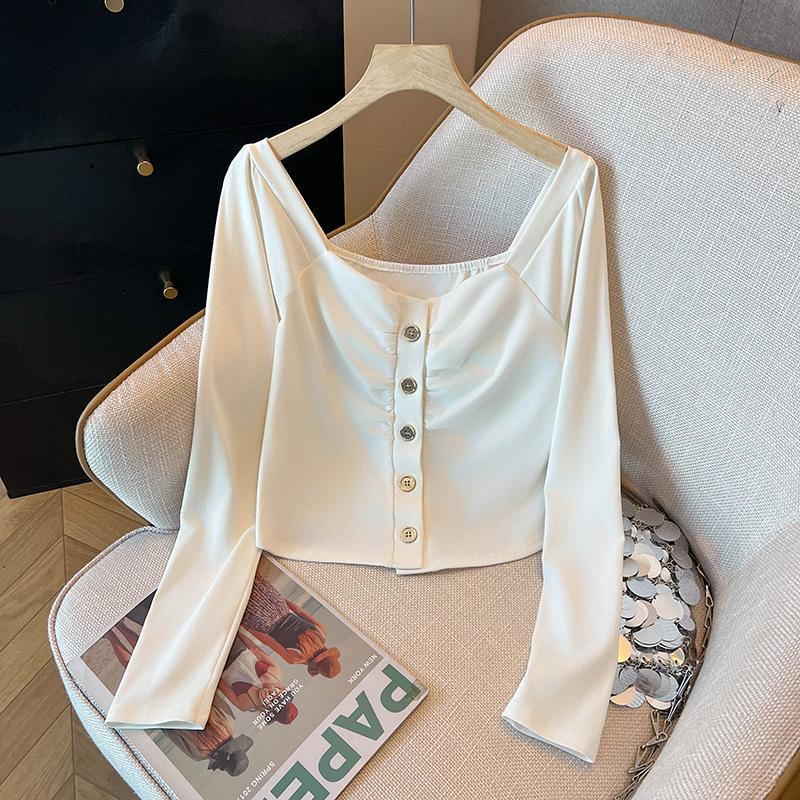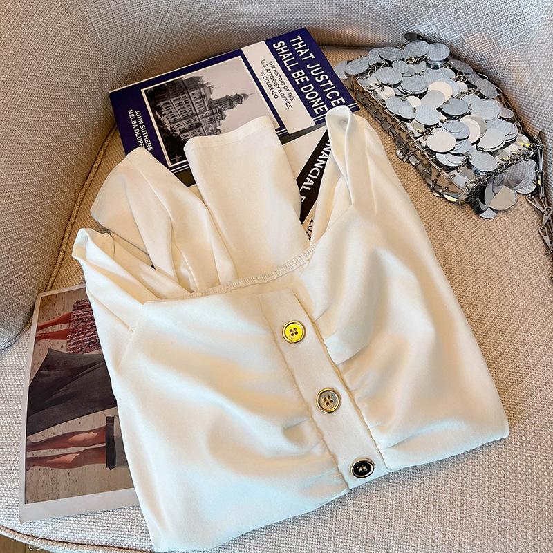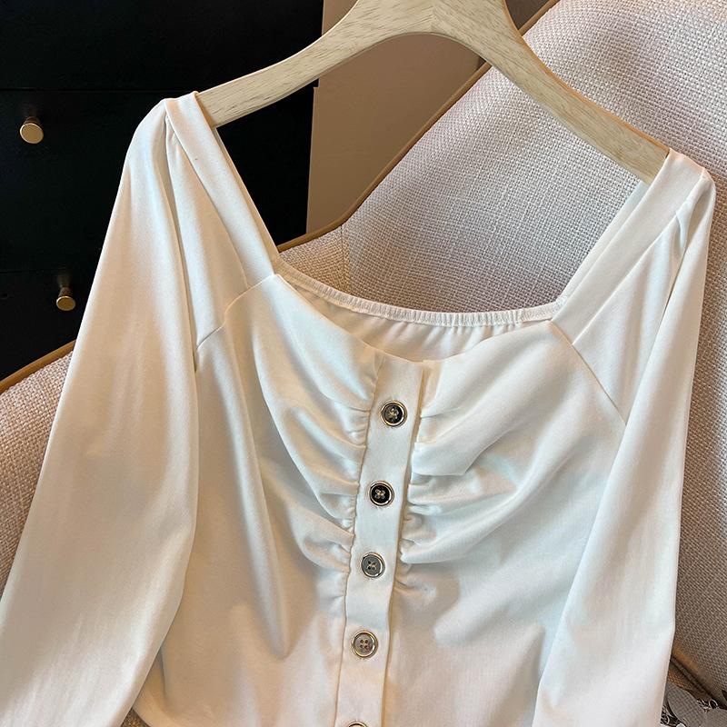 Foto real 4262# camisa blanca de cuello cuadrado abotonada de manga larga para mujer, nueva, deseo puro, ajustada, top corto