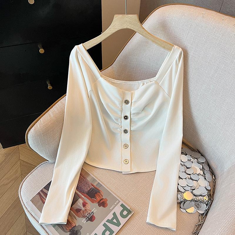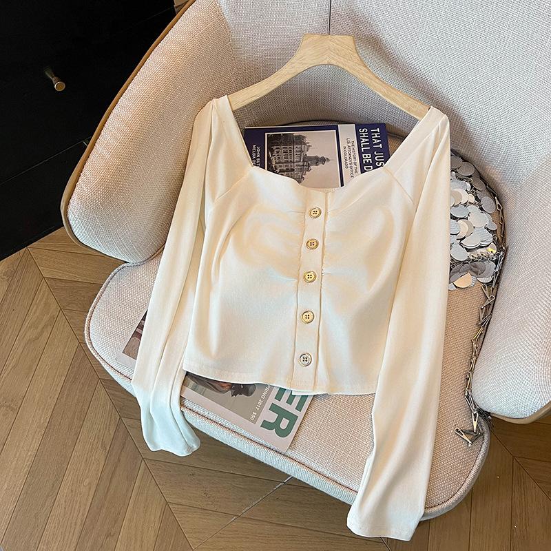 Camisa básica de manga larga con cuello cuadrado blanco y botonadura sencilla para mujer, primavera 2025, nueva blusa corta adelgazante pura