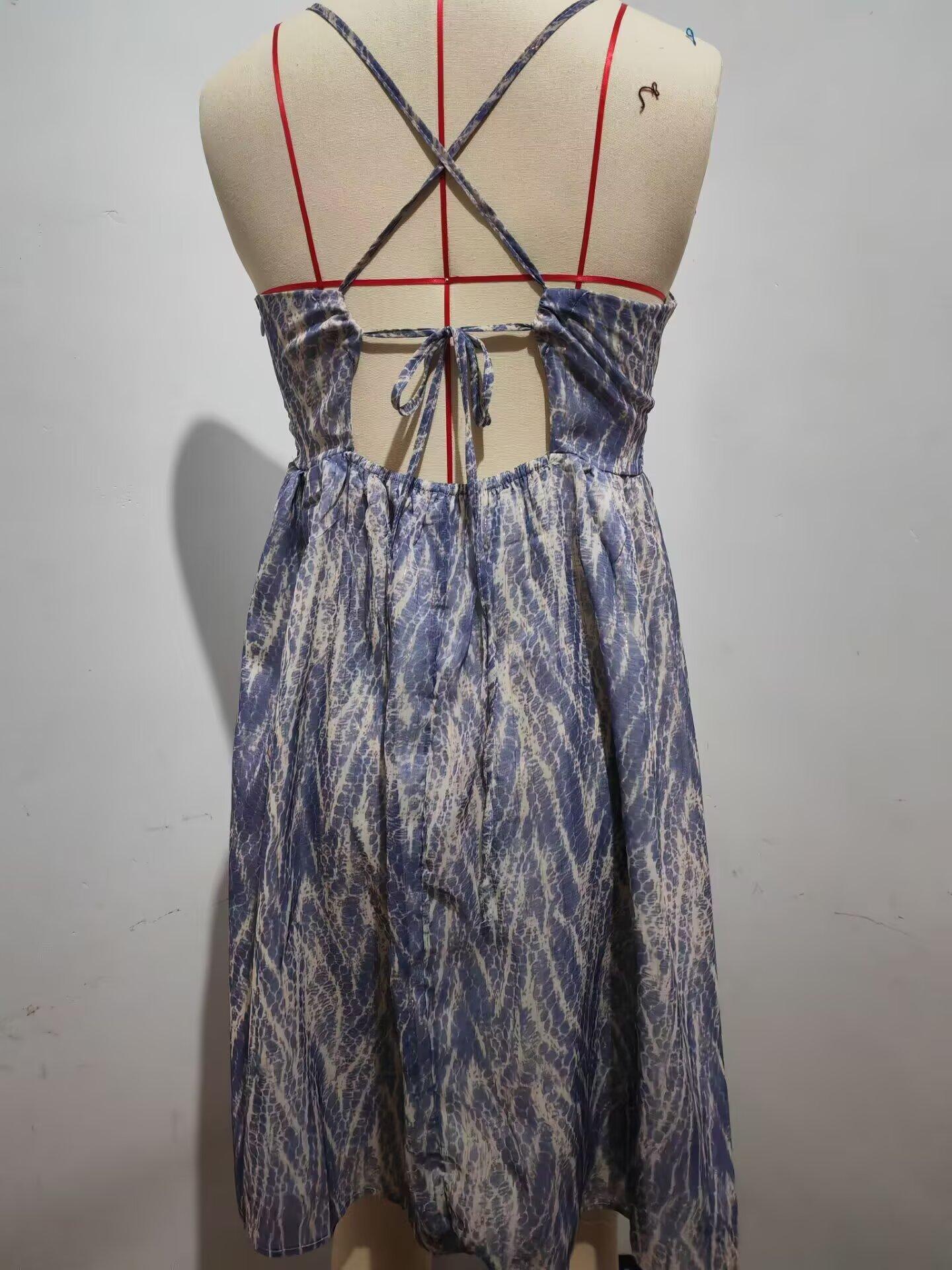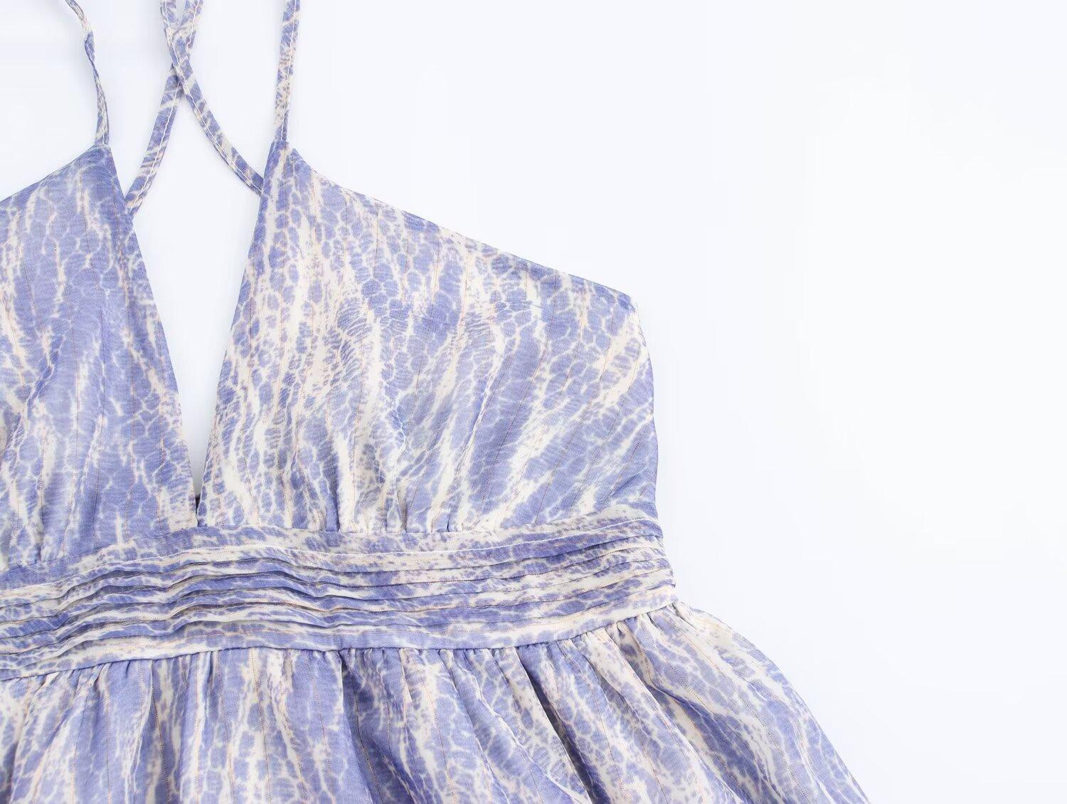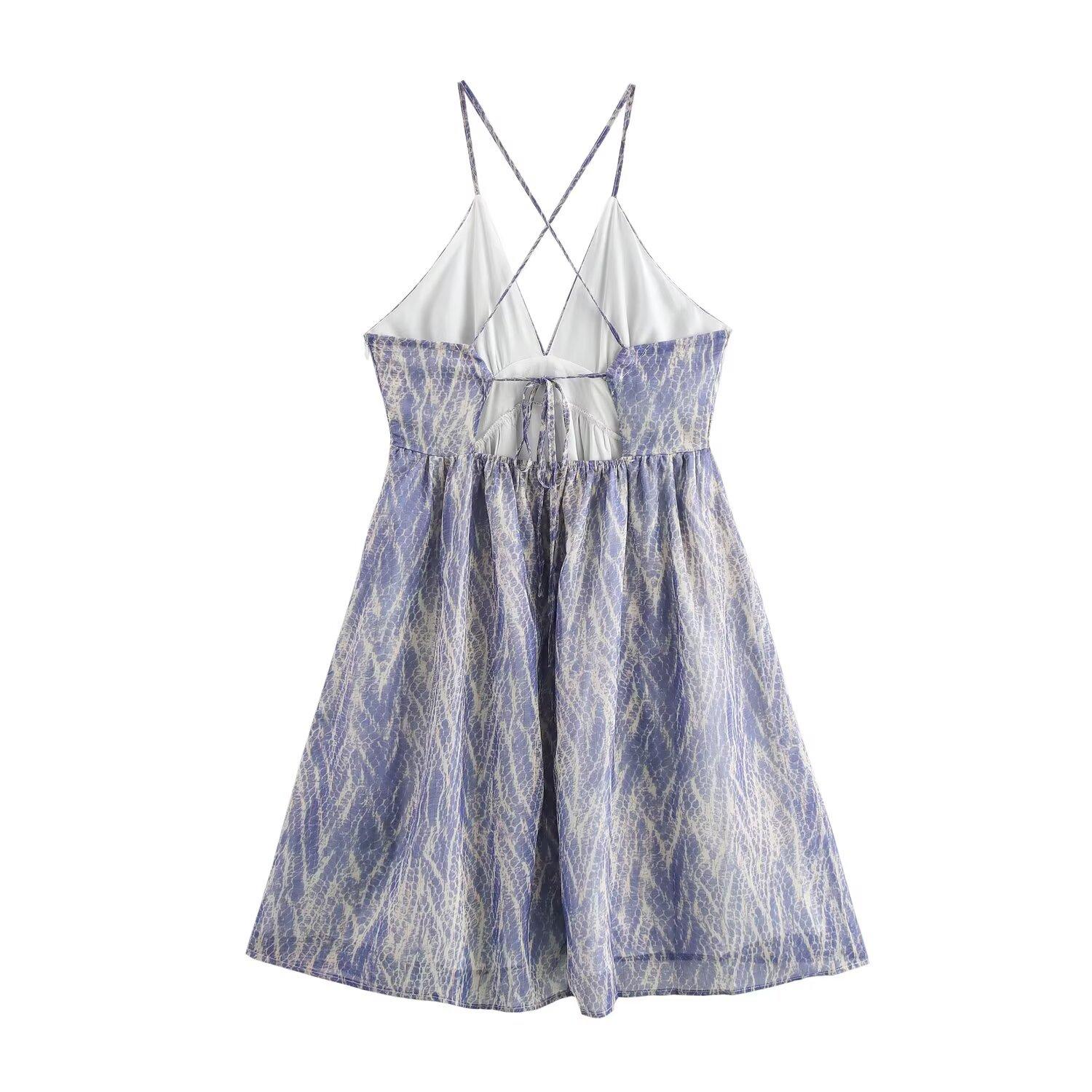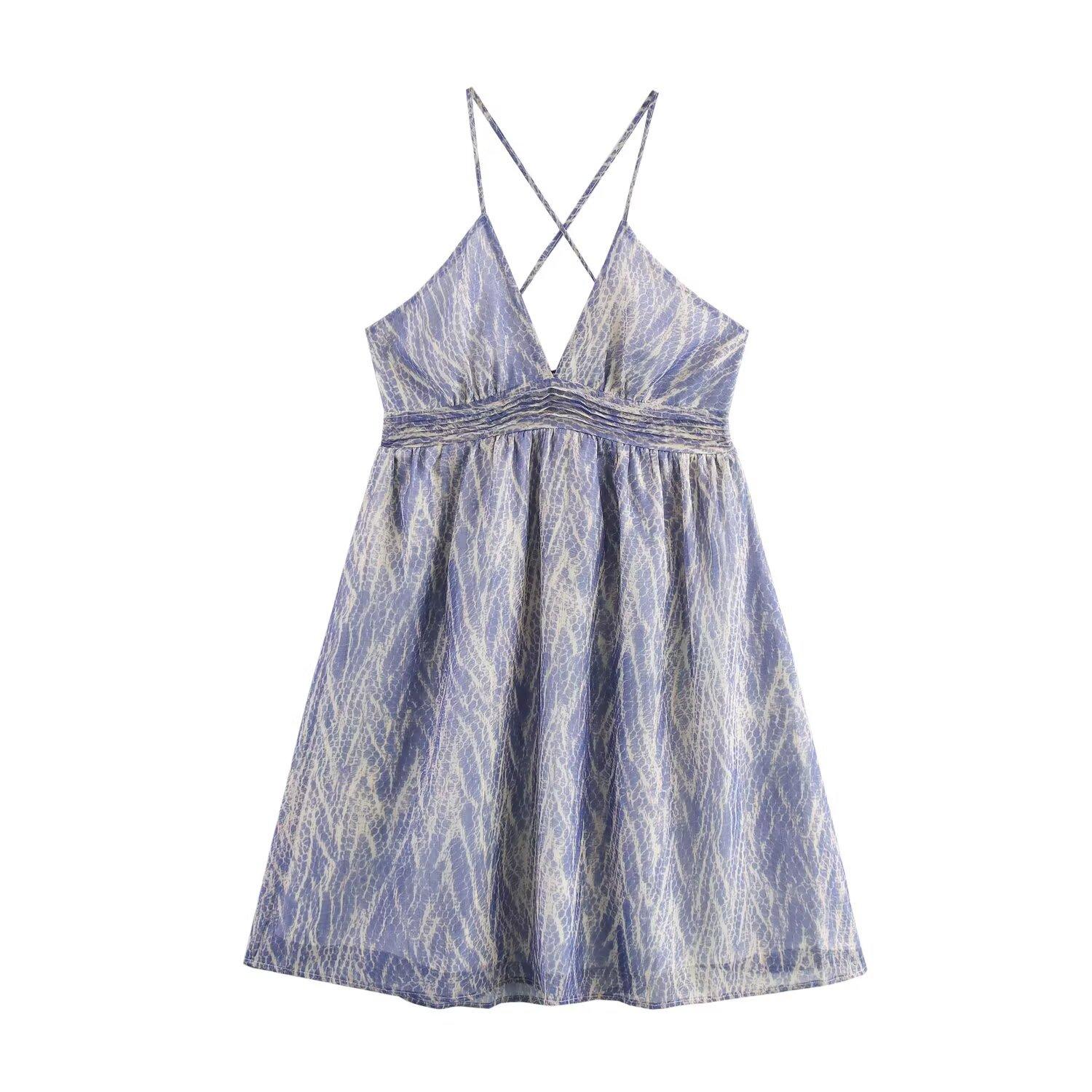 Moda Transfronteriza Europea y Americana 2025 Primavera y Verano Nuevo Vestido Europeo y Americano Sexy con Espalda Descubierta, Cuello en V y Tirantes de Gasa Estampado