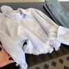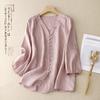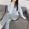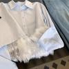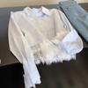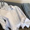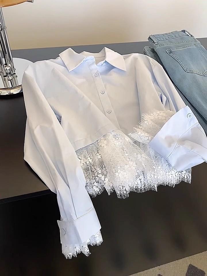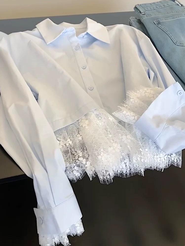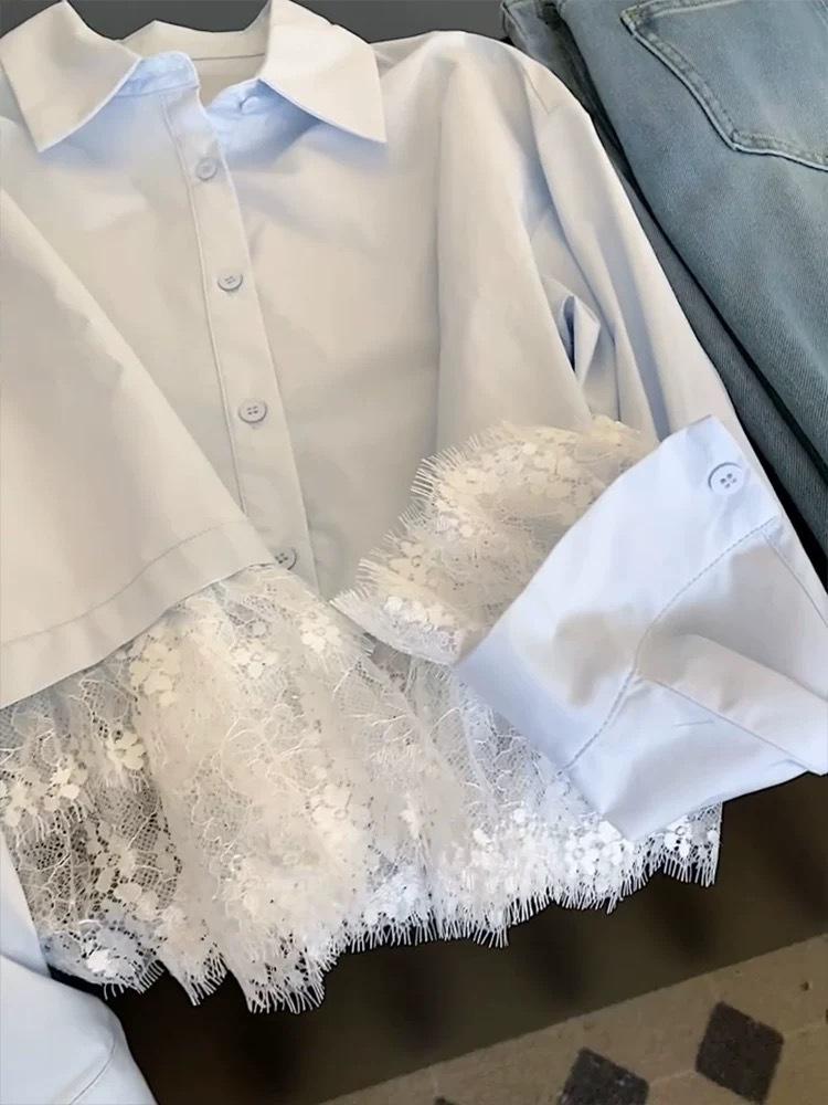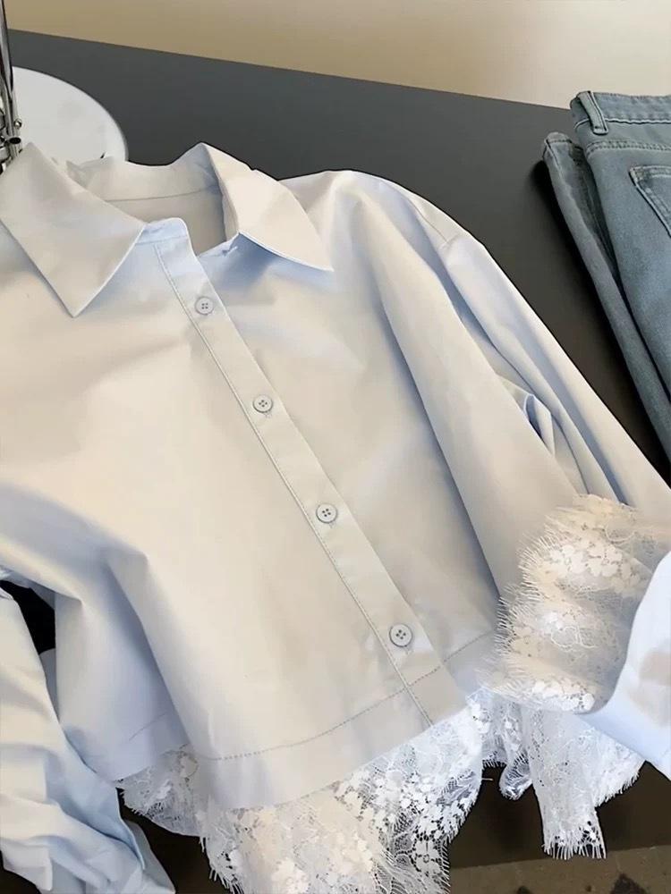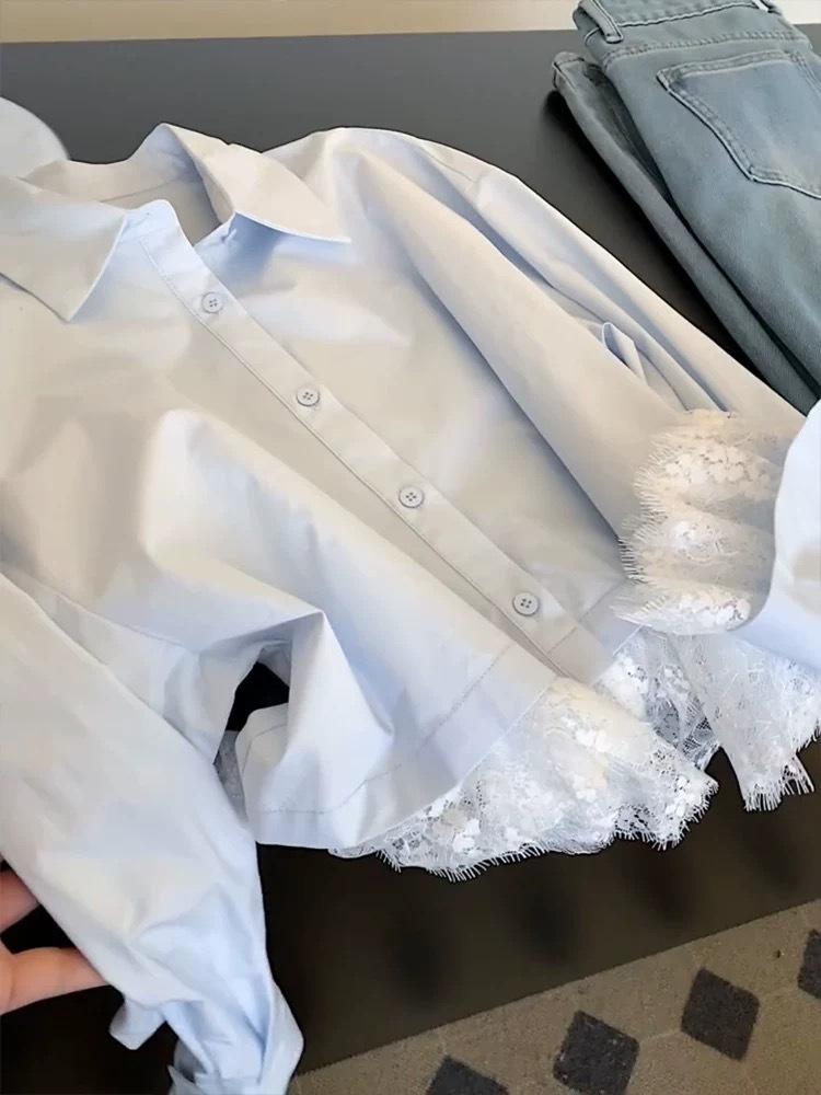 Camisa de encaje azul francés con cuello polo holgado para mujer, diseño de nicho, primavera y otoño 2025