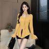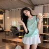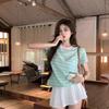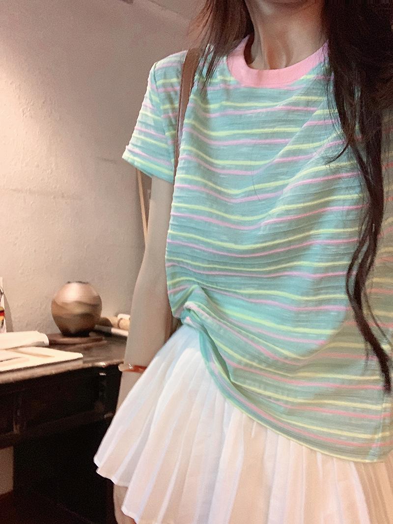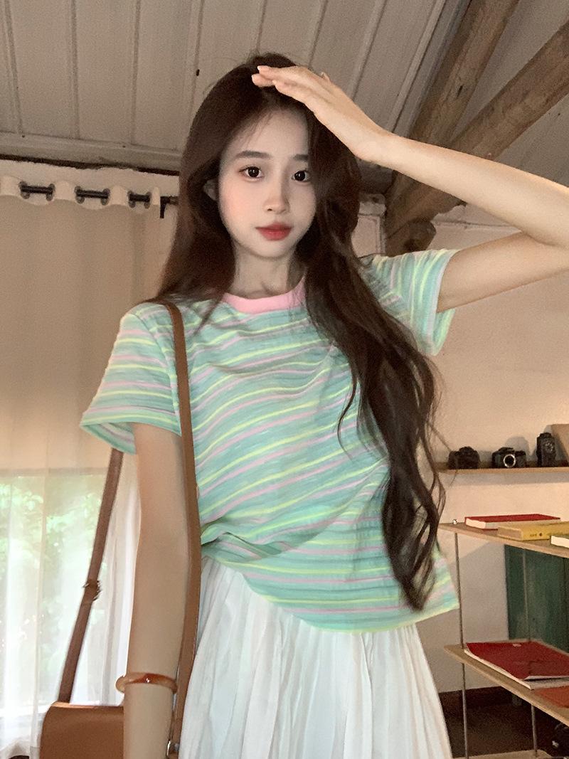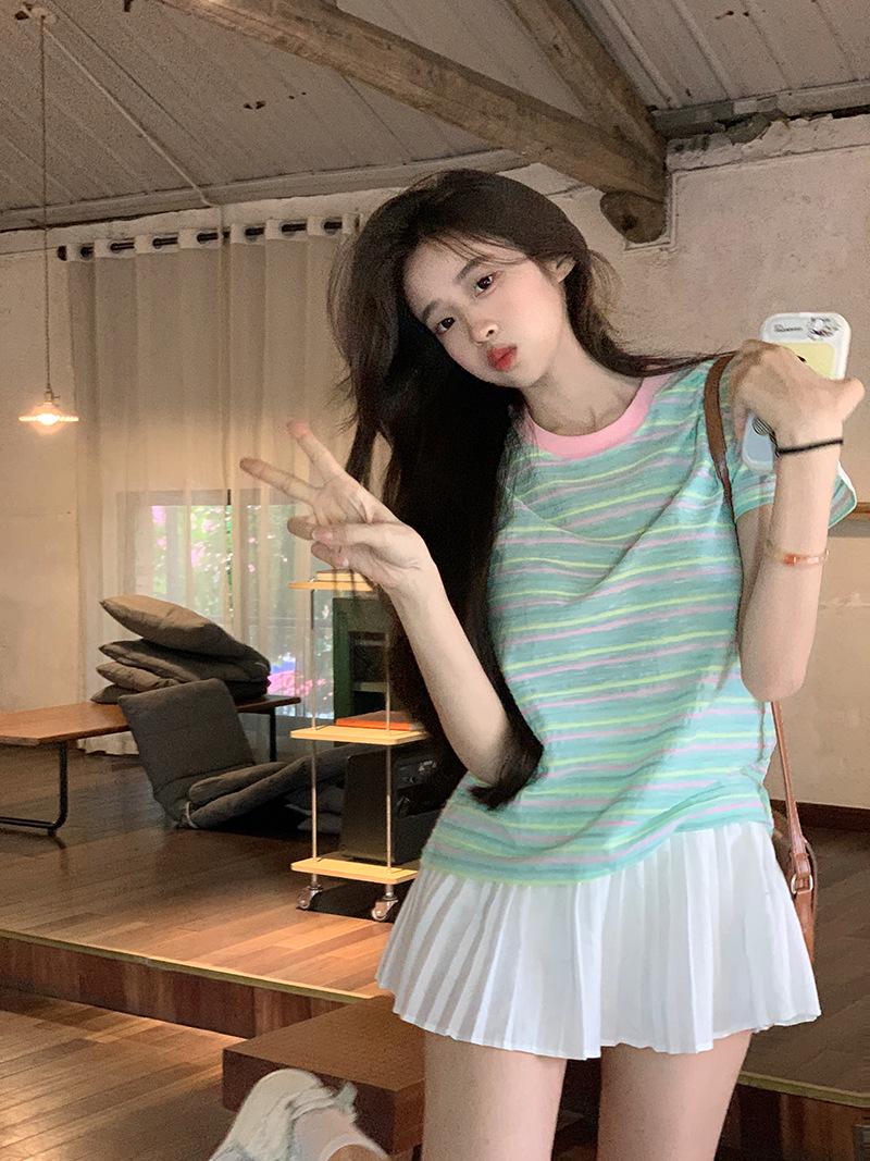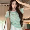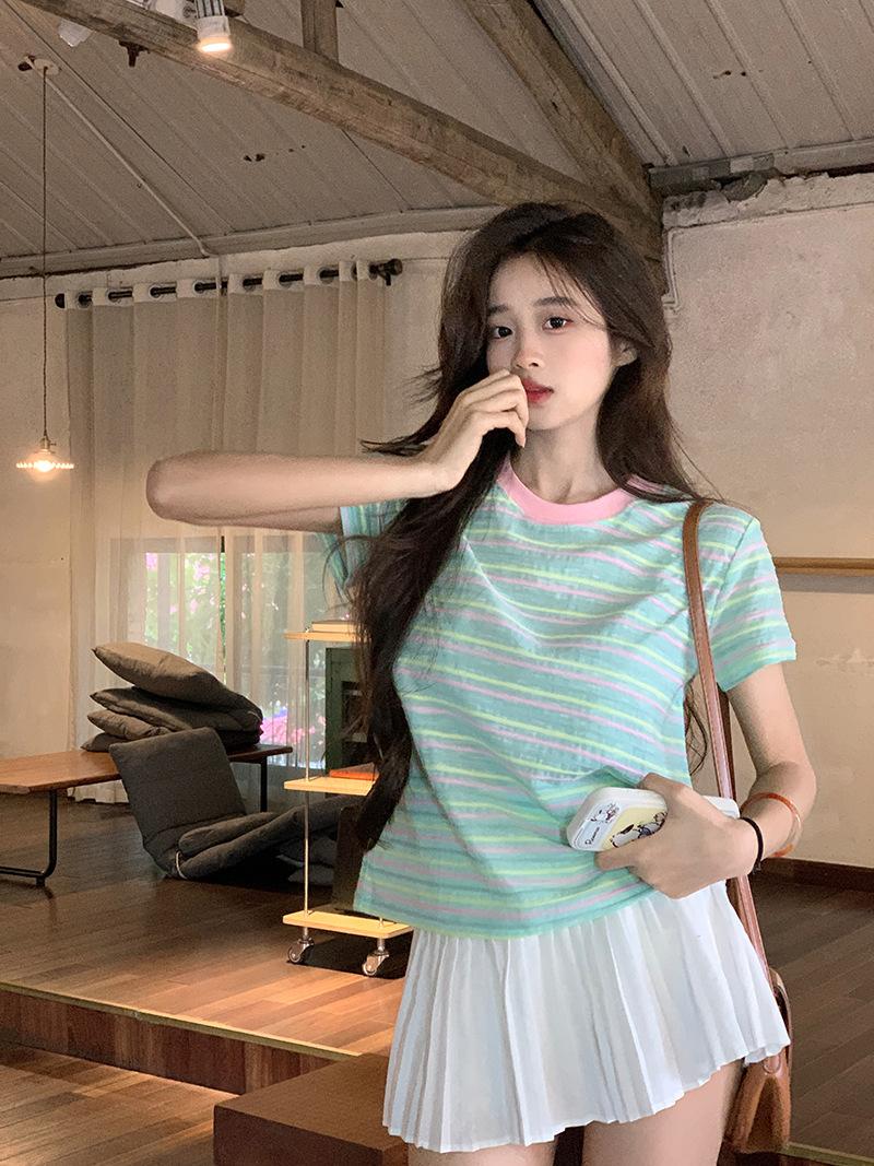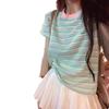 Camiseta de verano estilo americano con rayas en los hombros, corte entallado, cuello redondo en contraste, Pure Desire Hot Girls Sexy Niche Top Ins
