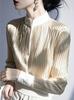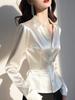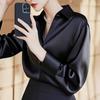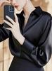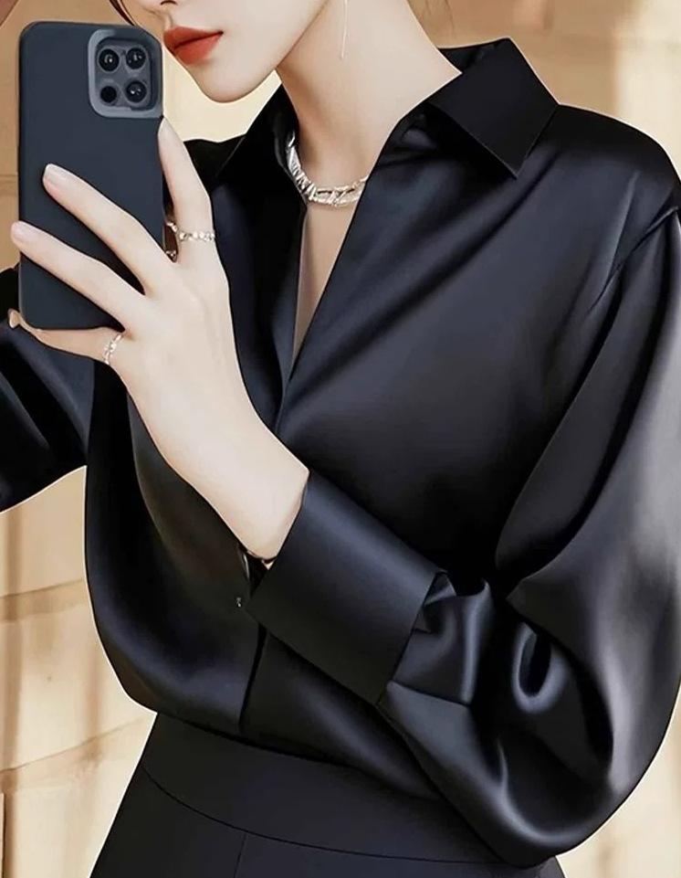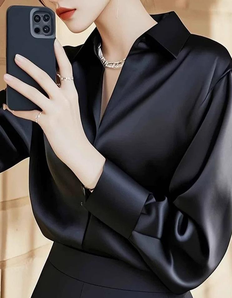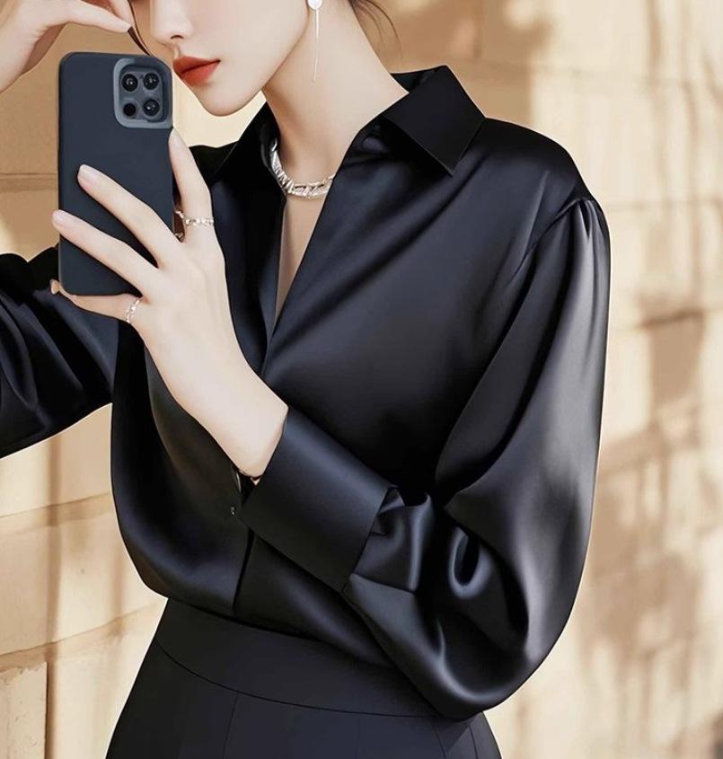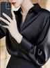 Camisa de Satén Negro de Alta Gama 2025 Primavera Temprana Estilo Francés Reductor de Edad Camisa Estilo Occidental para Ir al Trabajo Top Exquisito y Cómodo para Mujer