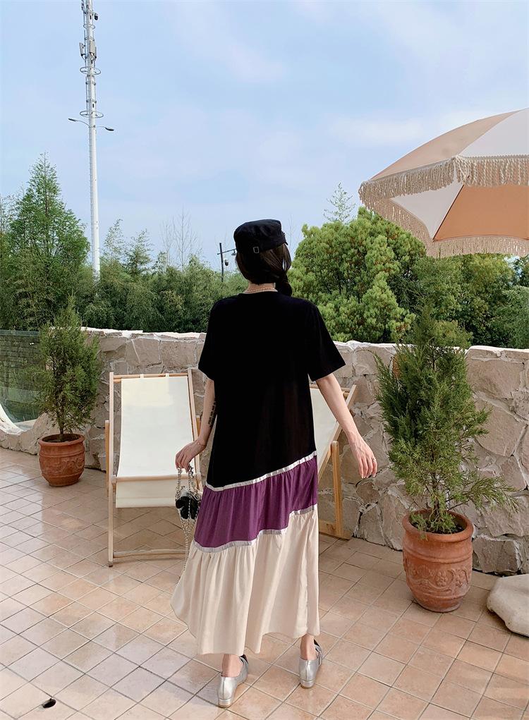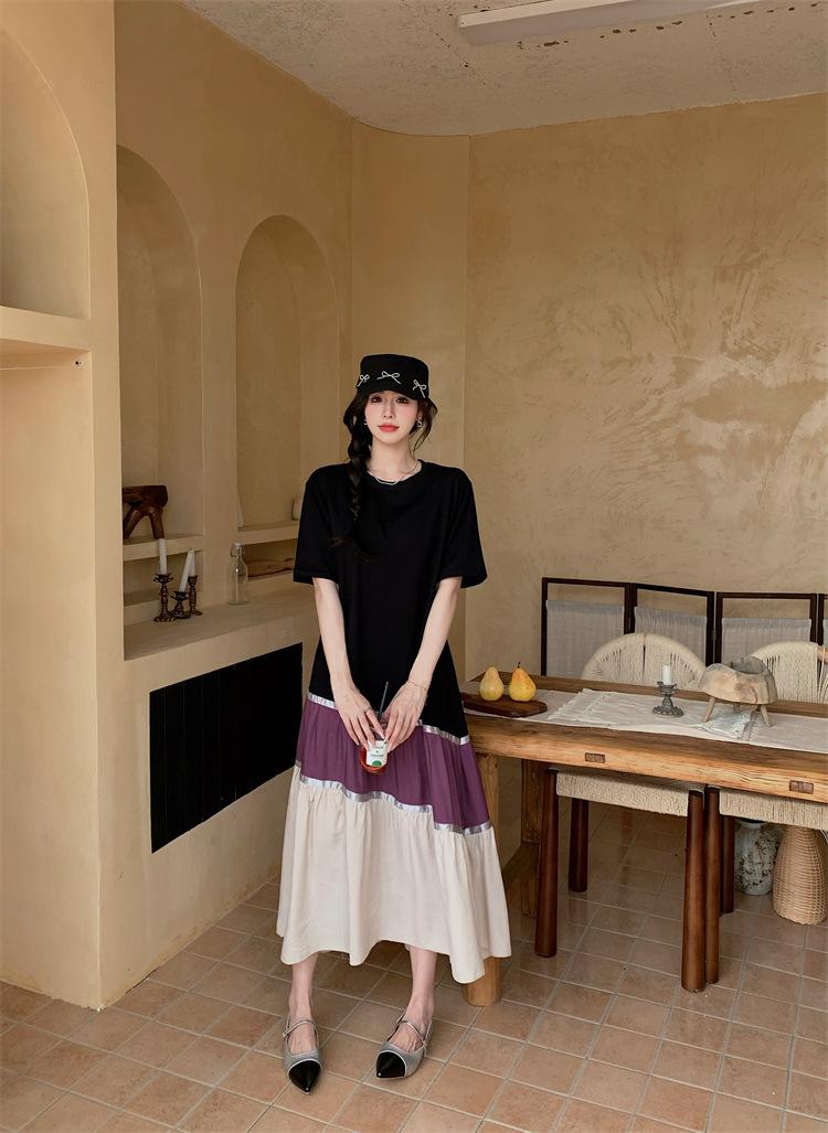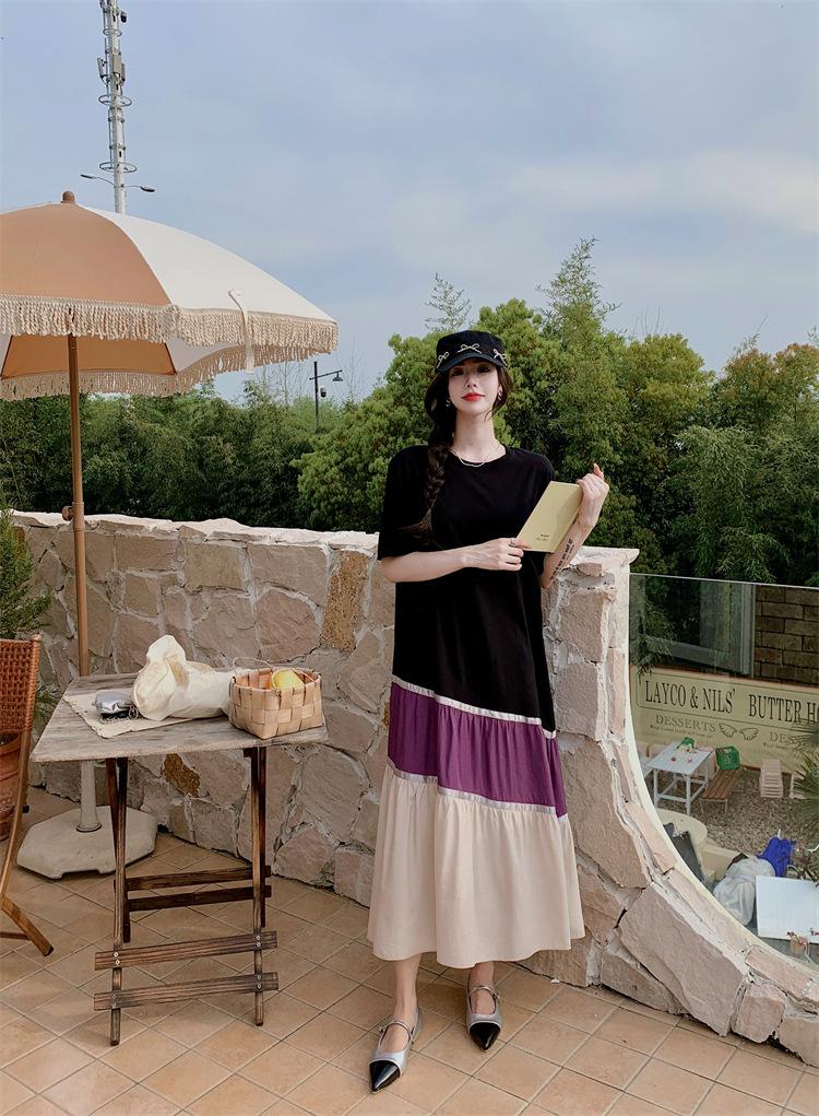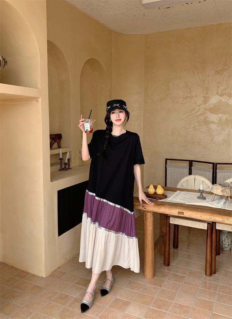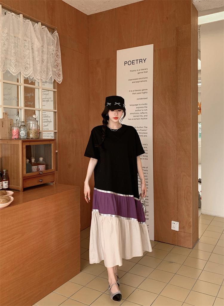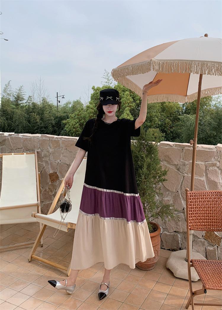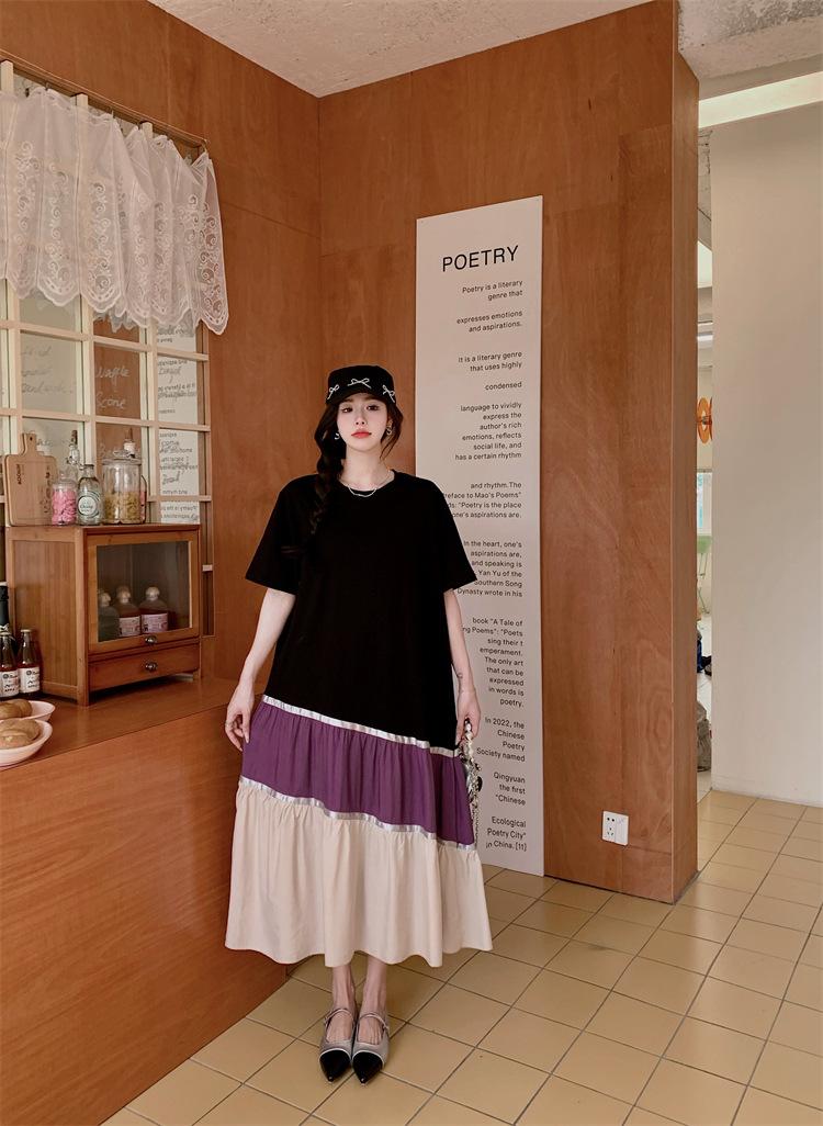 Vestido asimétrico de manga corta con cinta a juego y costuras de color, talla grande, nuevo, verano 2025, disponible en stock.