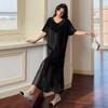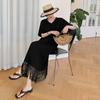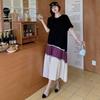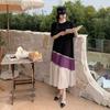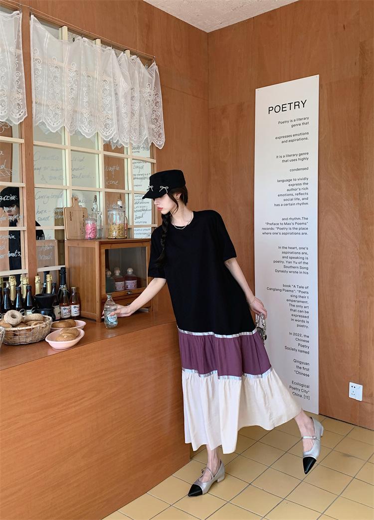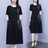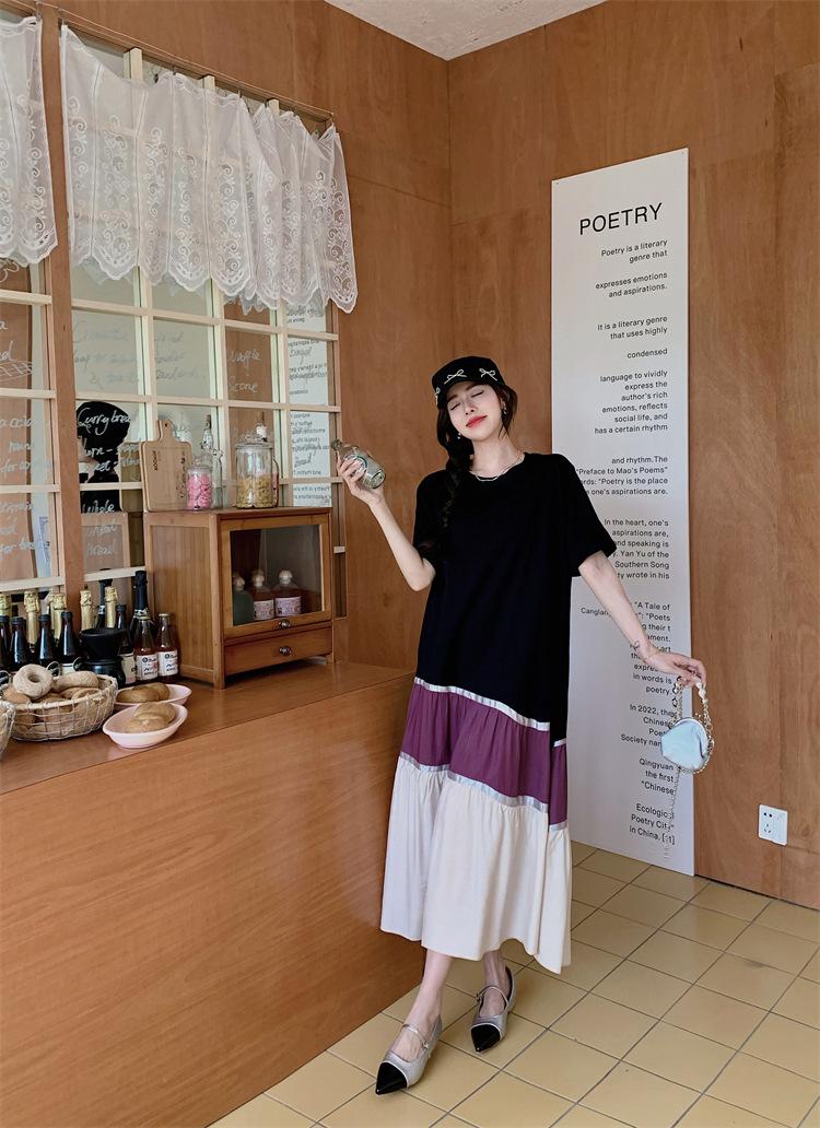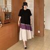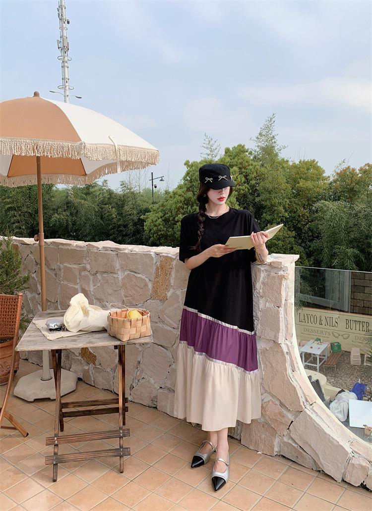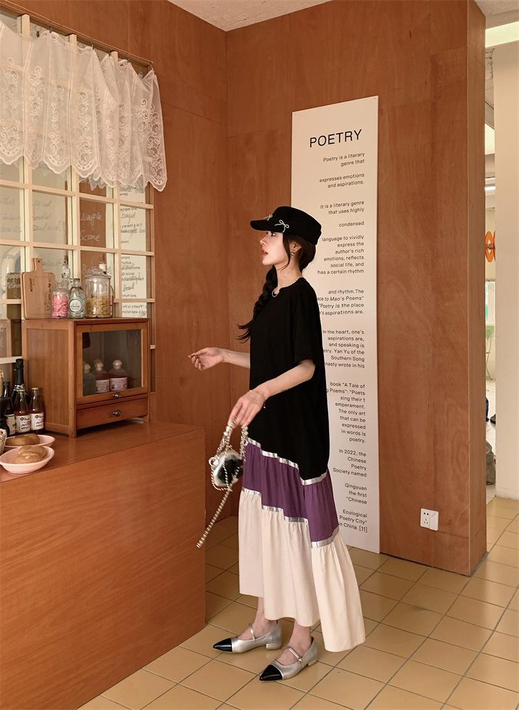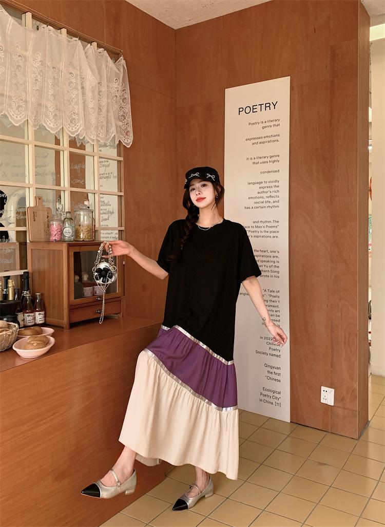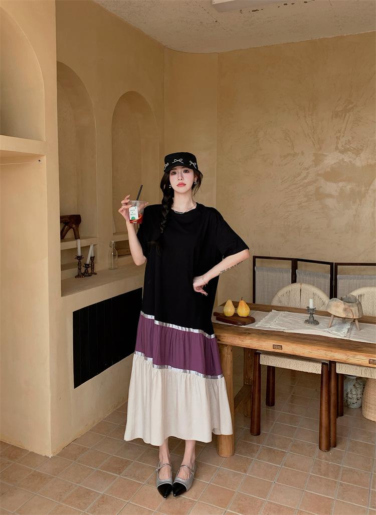 Vestido asimétrico de manga corta con cinta a juego y costuras de color, talla grande, nuevo, verano 2025, disponible en stock.