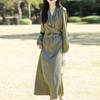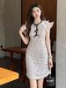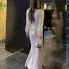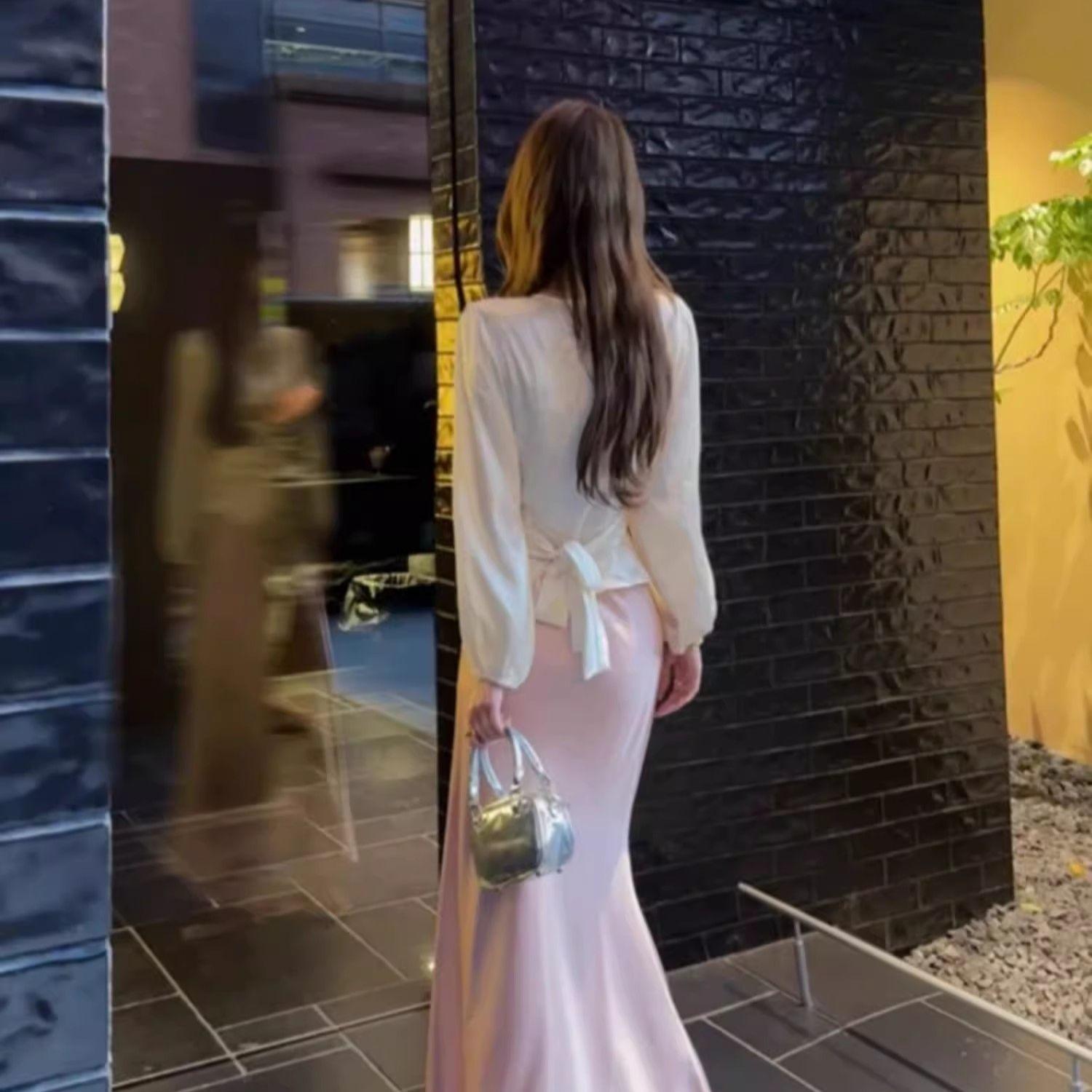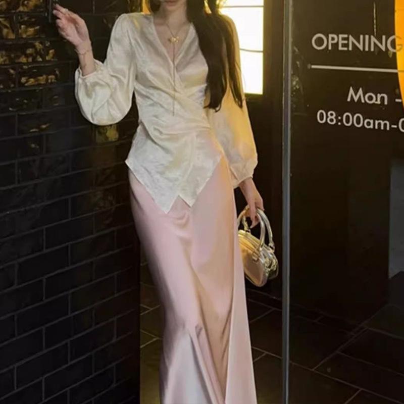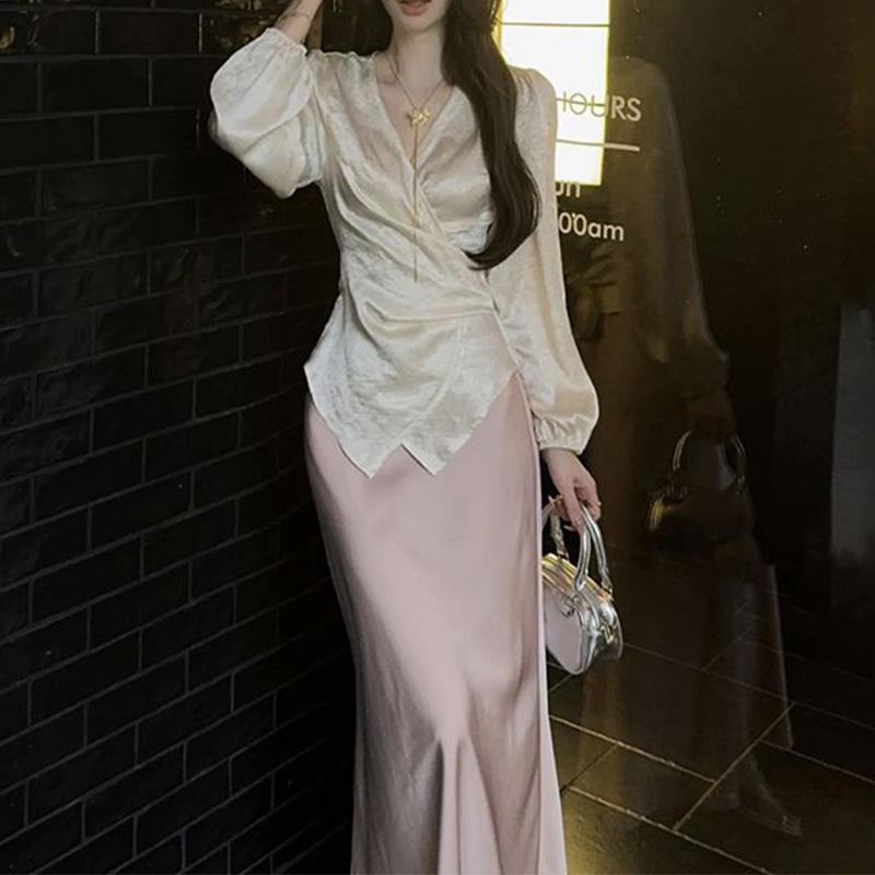2025 Nuevo traje chino con cuello en V elegante e irregular para mujer, moda de primavera y verano, falda de cola de pez envolvente de satén a la cadera