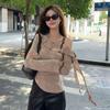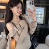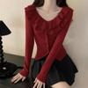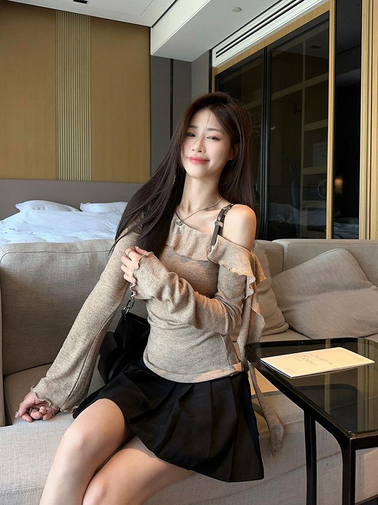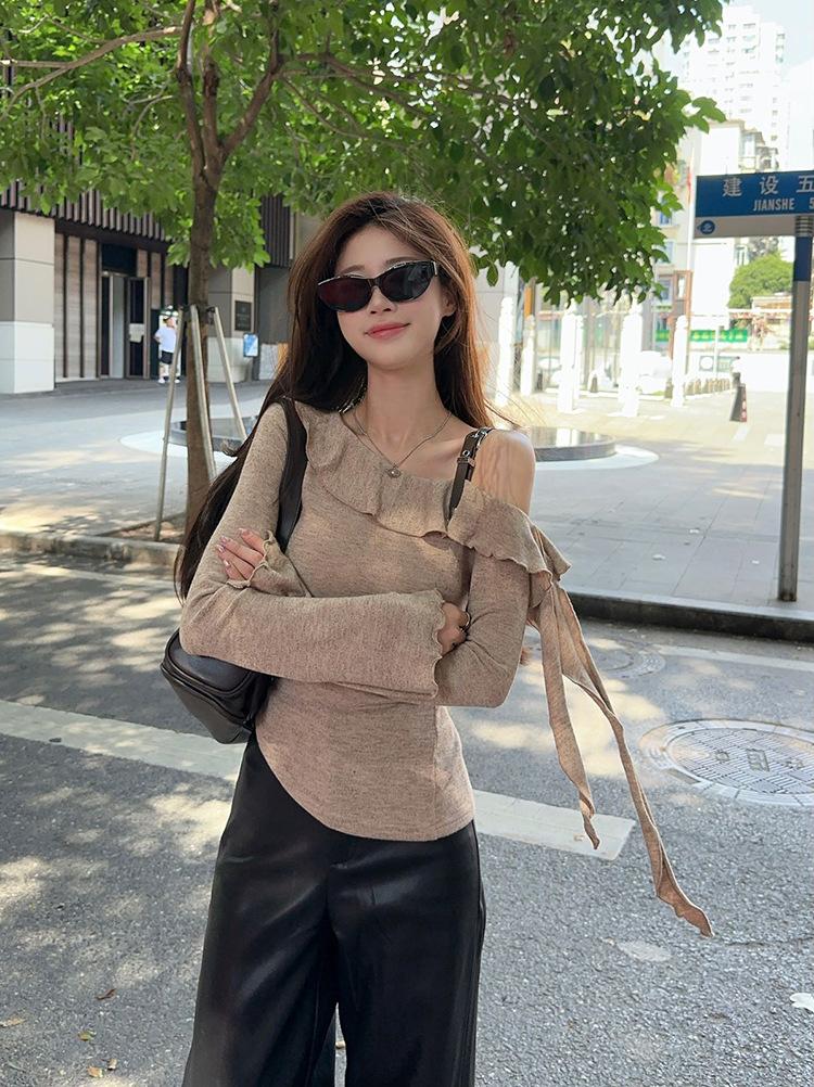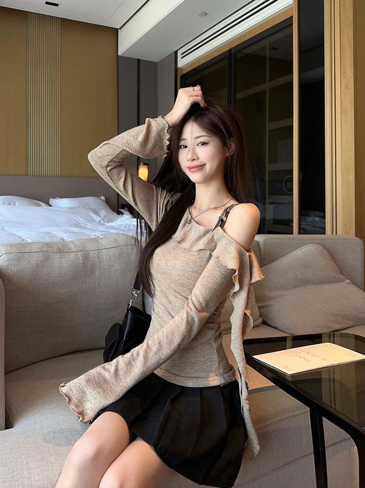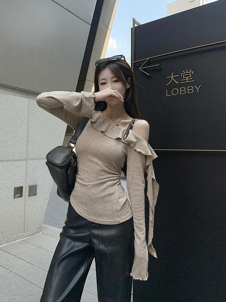 Playera Sexy con Volantes de Manga Larga Pura Otoño Temprano Nuevo Sentido del Diseño Moda Adelgazante Nicho Hombro Top Chica Picante