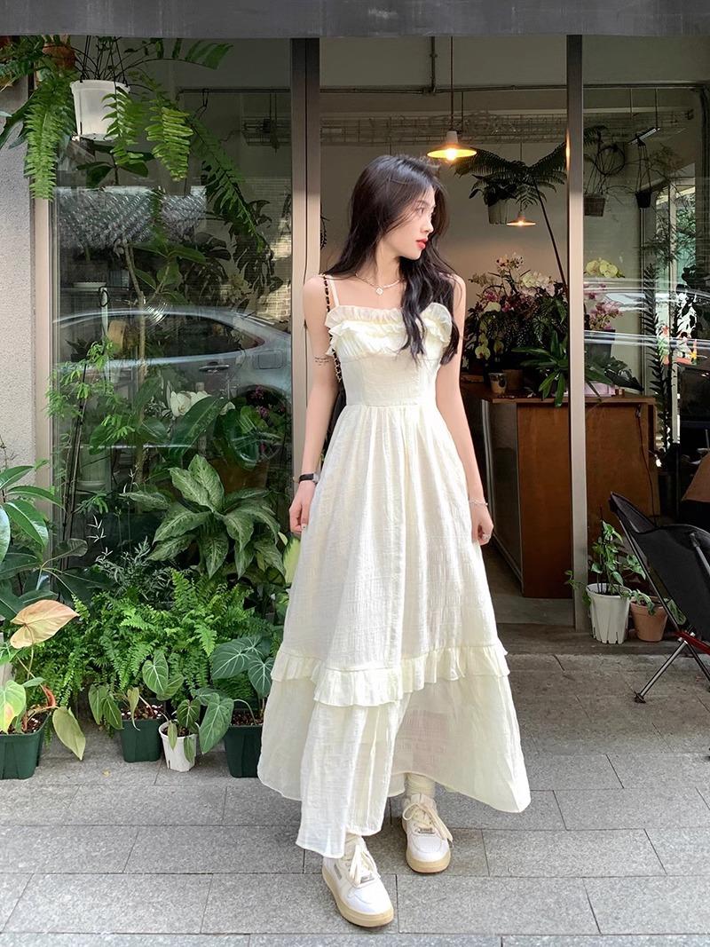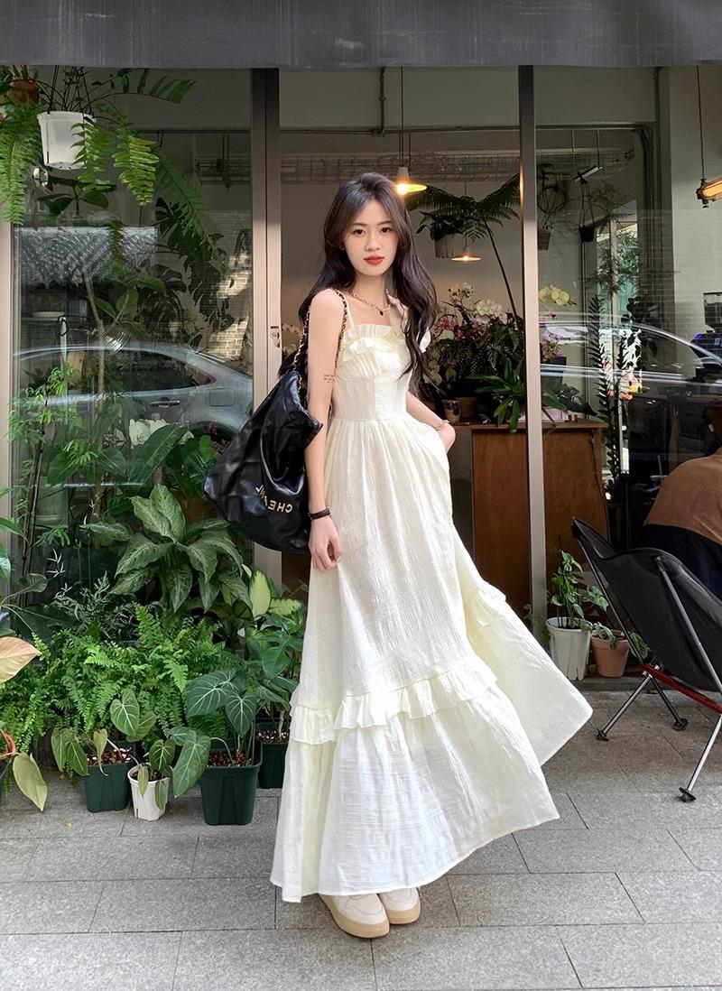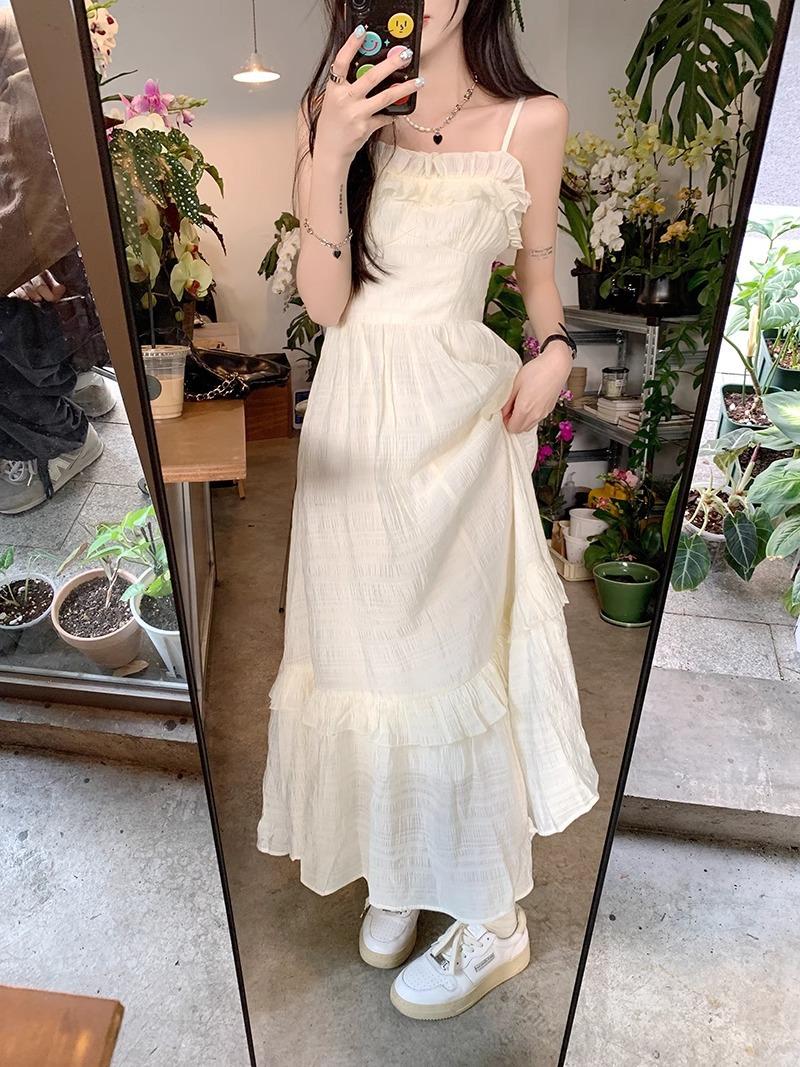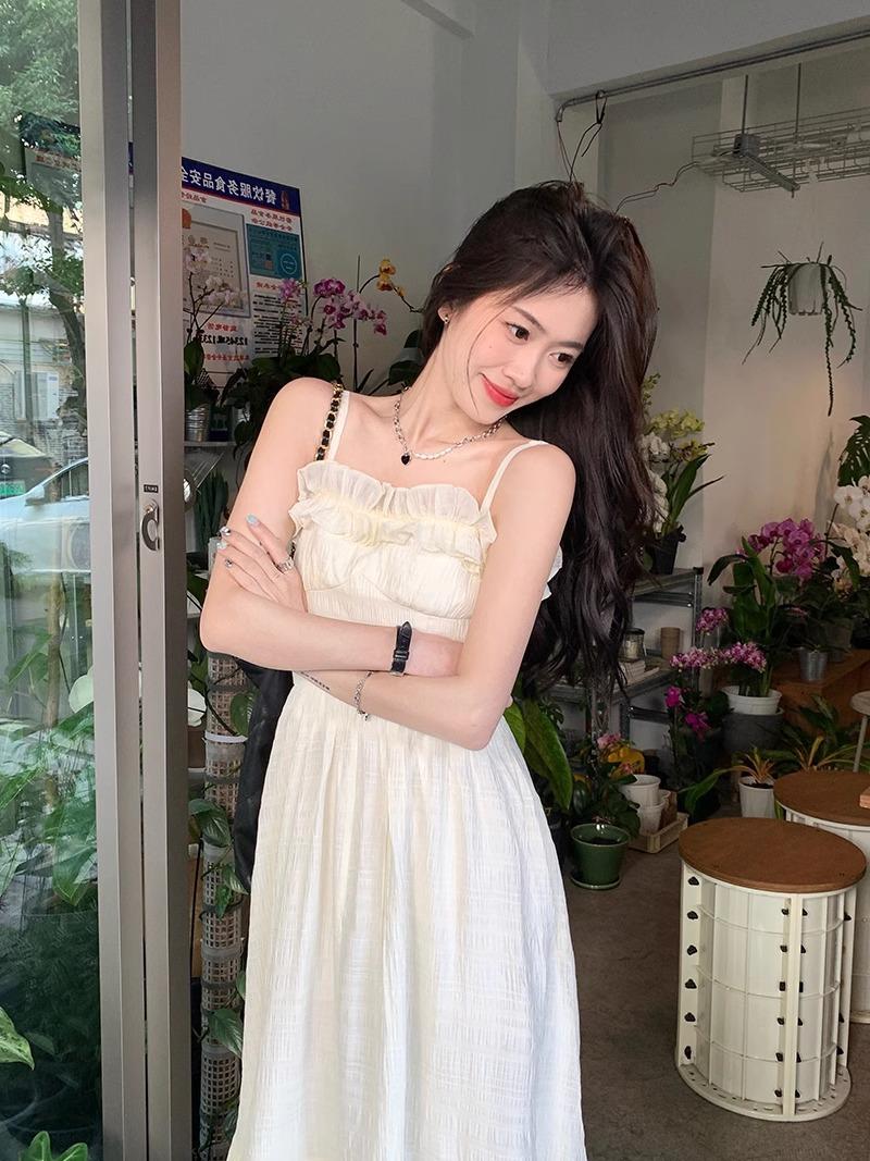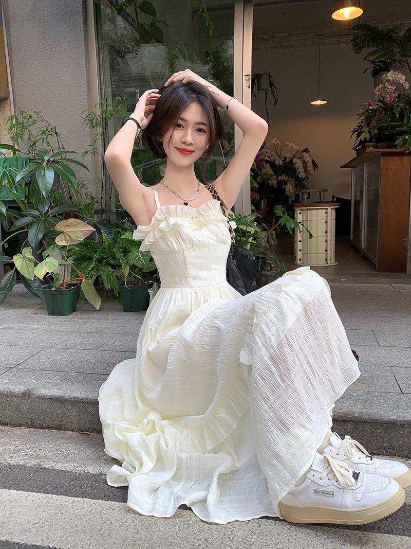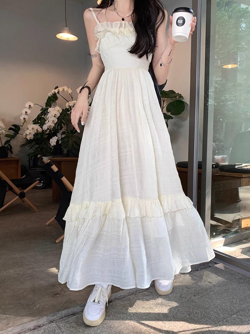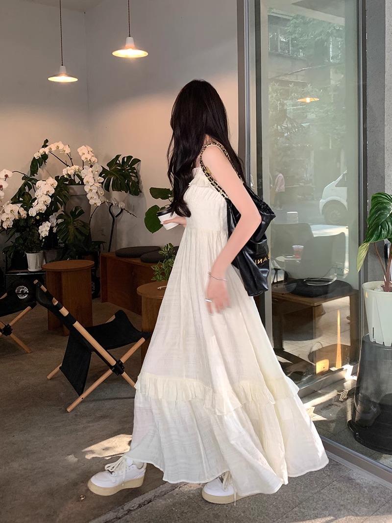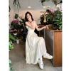 Vestido Blanco Sling Delgado Elegante Jacquard Vestido Delgado de Verano Color Sólido Vestido Puro Largo A2986
