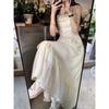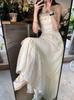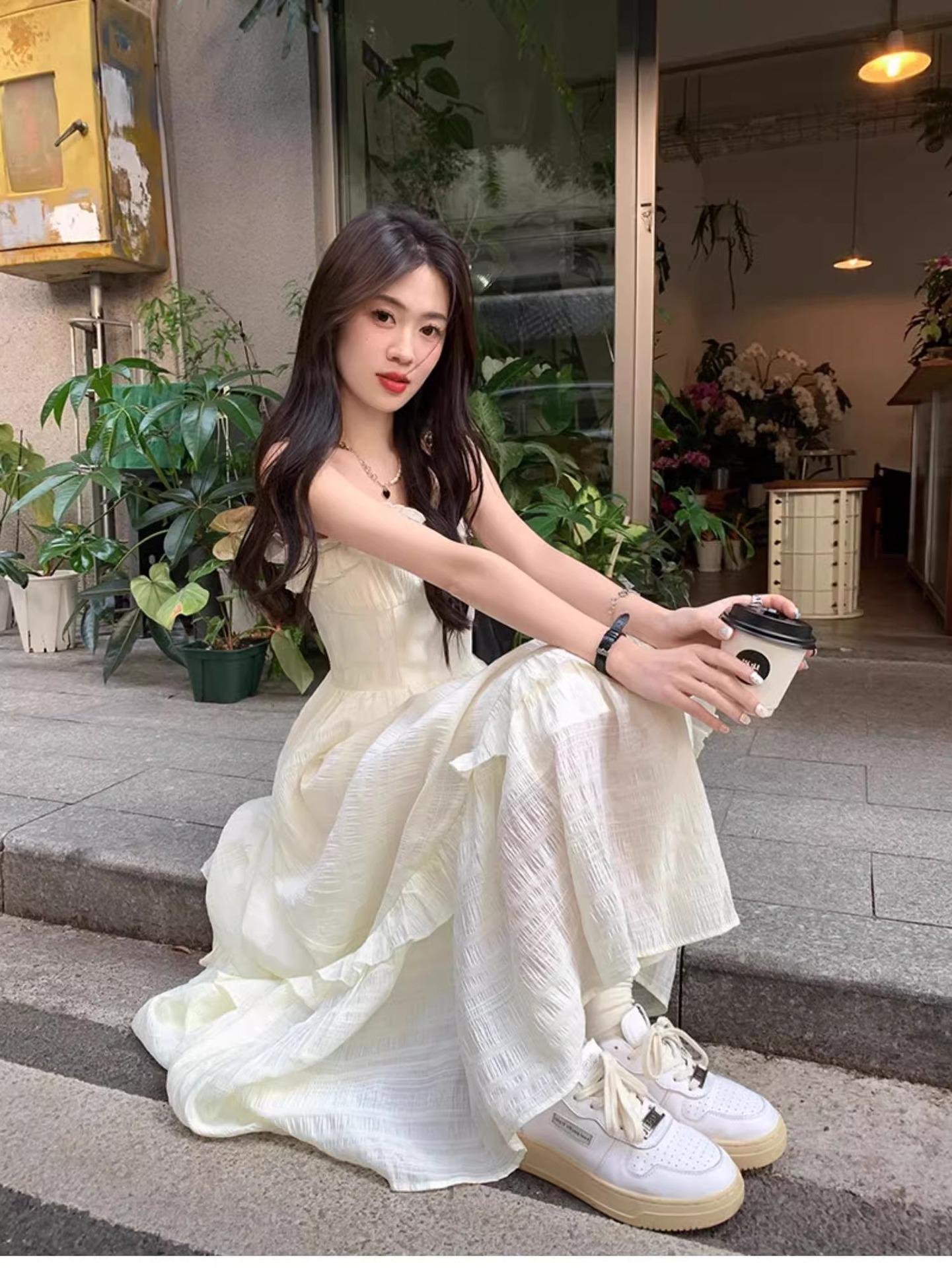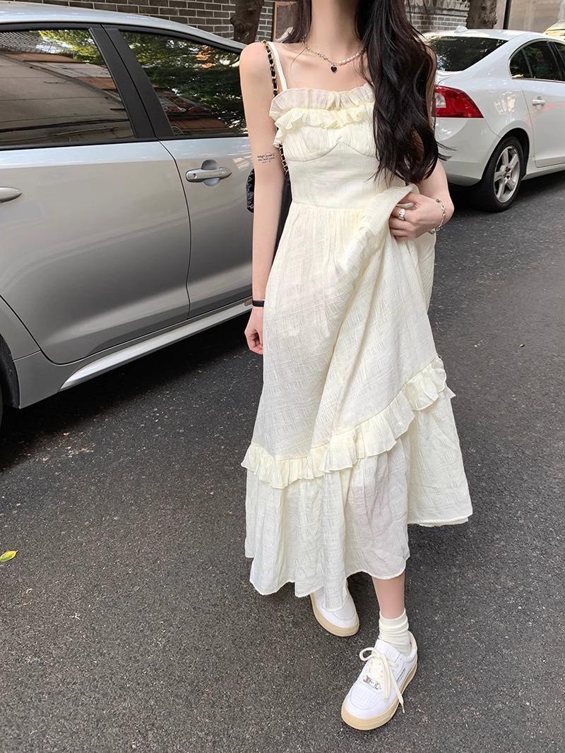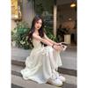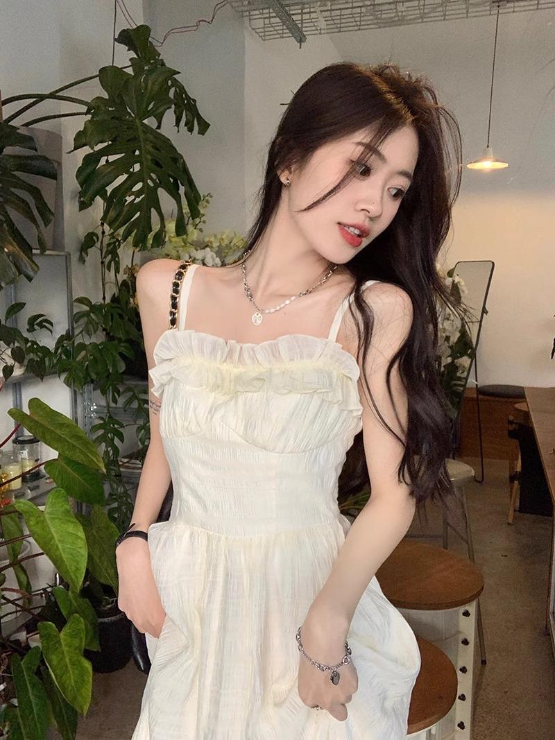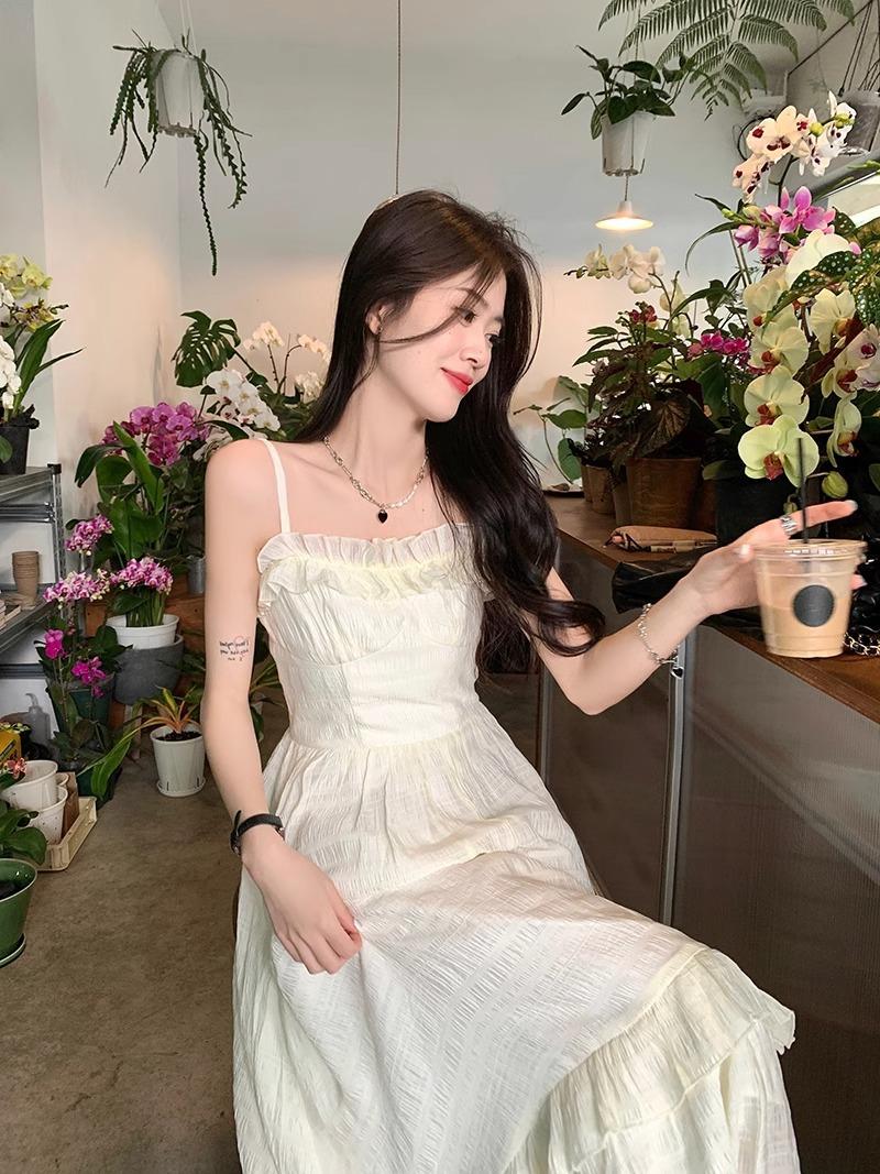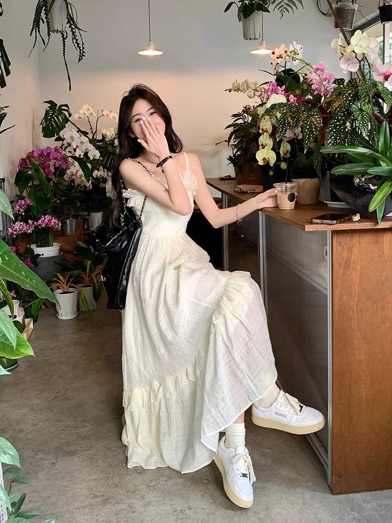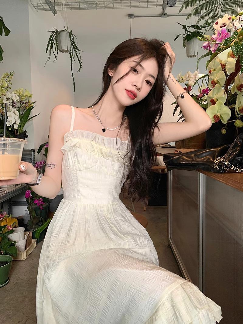 Vestido Blanco Sling Delgado Elegante Jacquard Vestido Delgado de Verano Color Sólido Vestido Puro Largo A2986