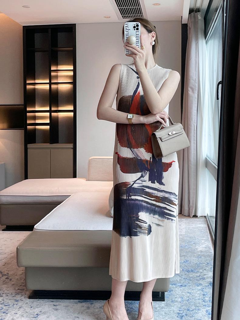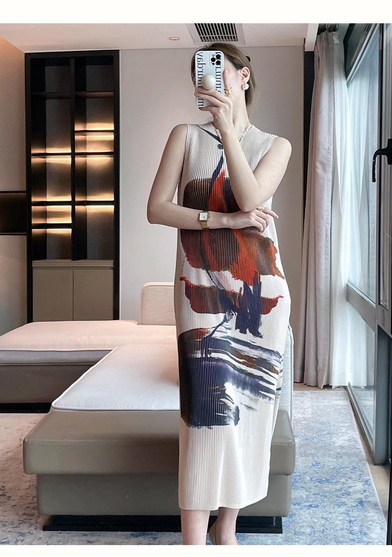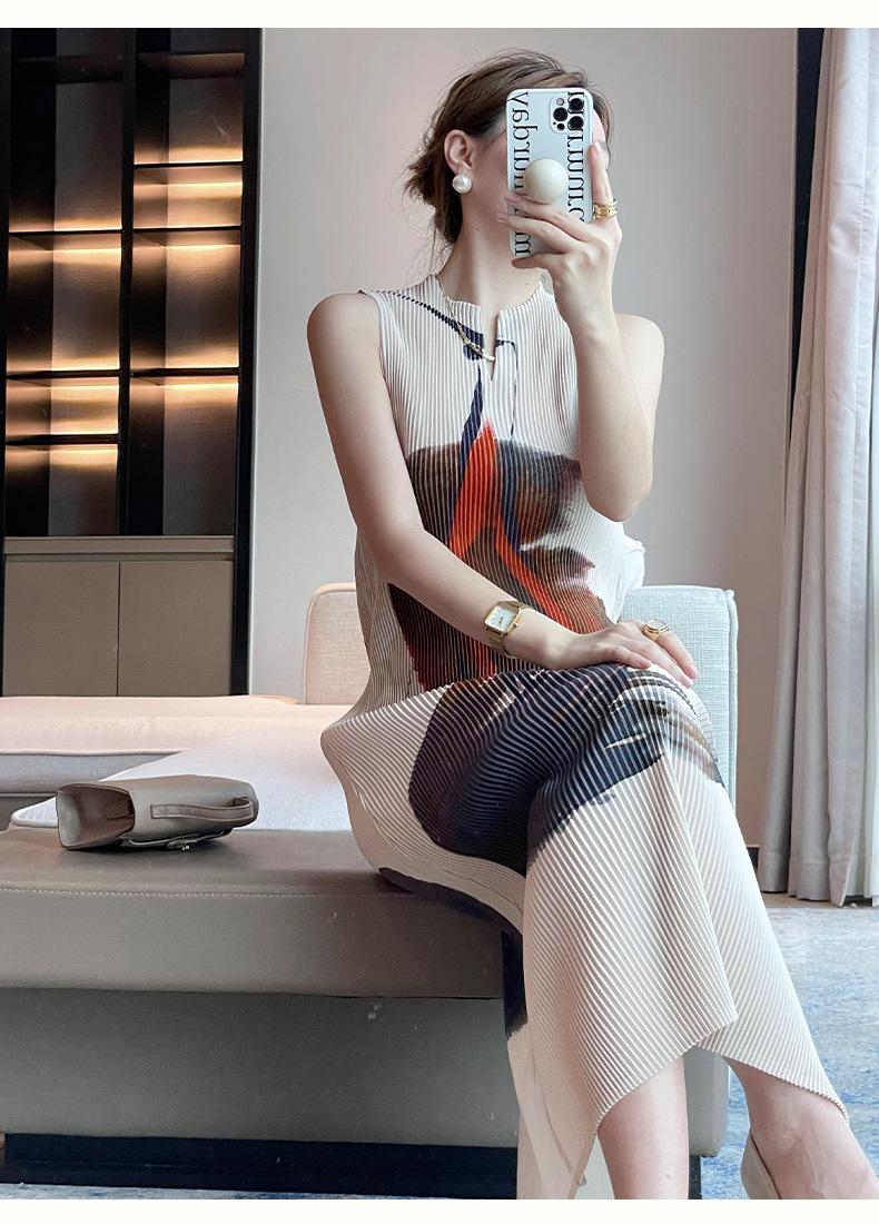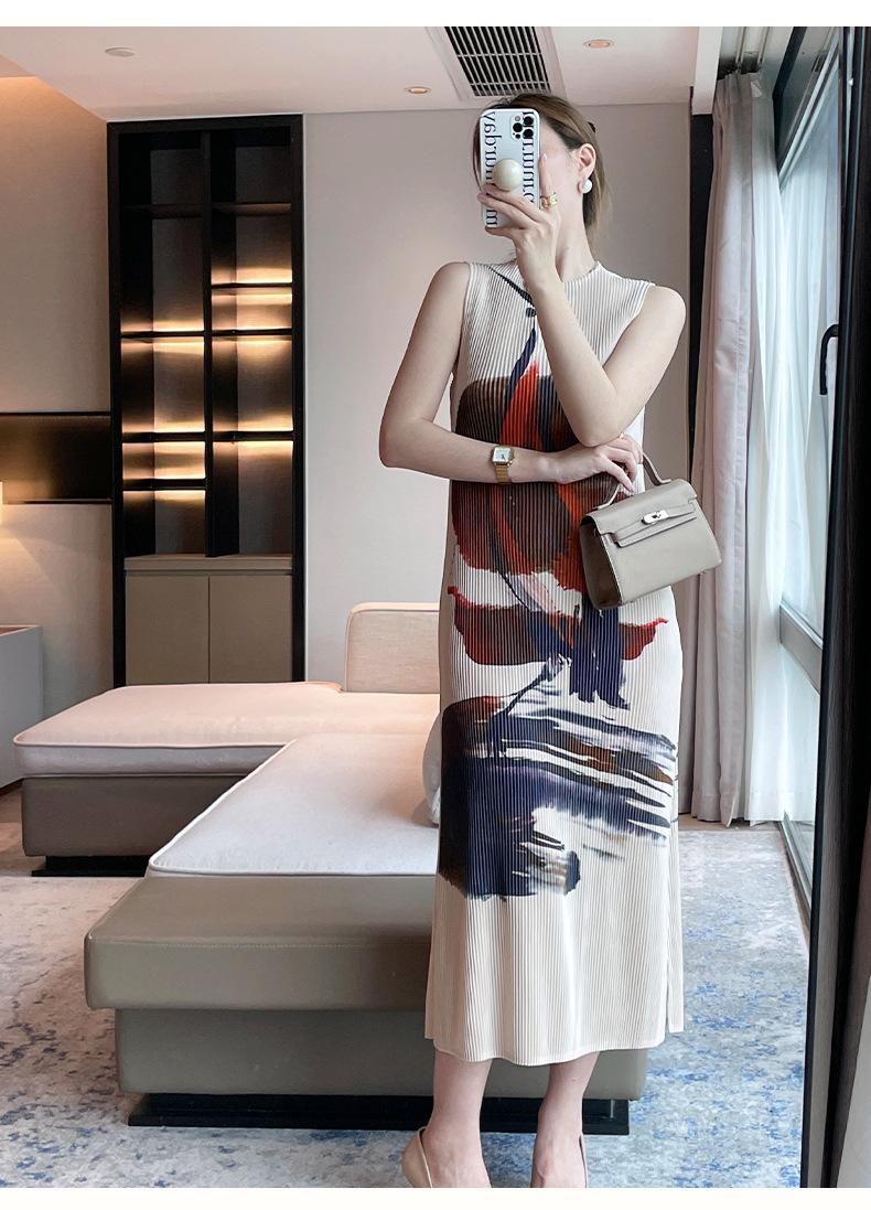 Vestido Miyake plisado sin mangas con estampado de alta gama pintado a mano nuevo de verano 2025, elegante vestido ajustado