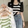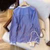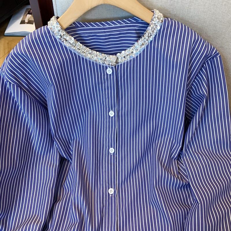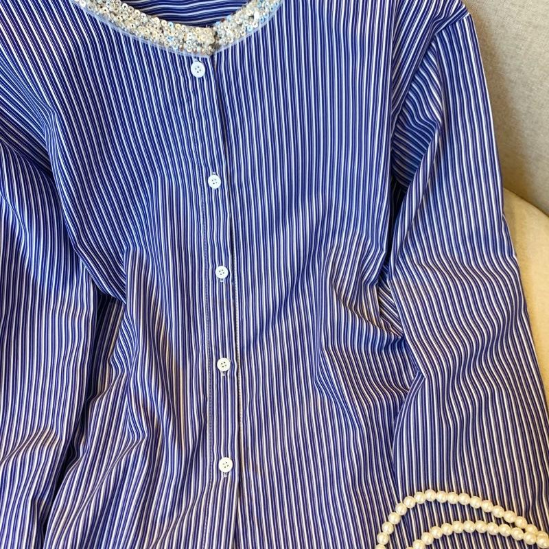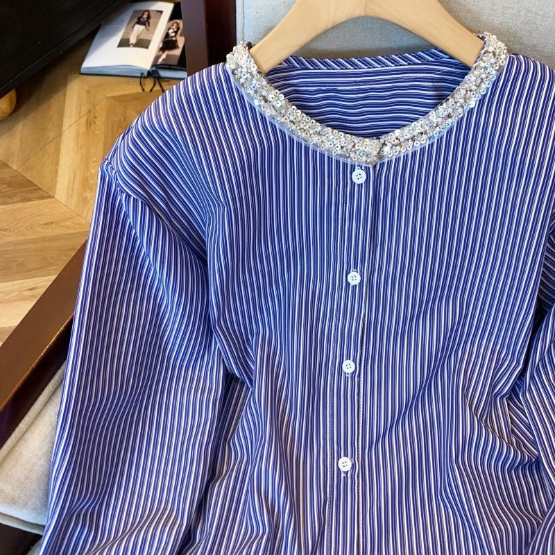 Camisa de alta gama con cuello de perla dulce, diseño de nicho, hecha en Europa, camisa a rayas combinable para mujer de principios de primavera.