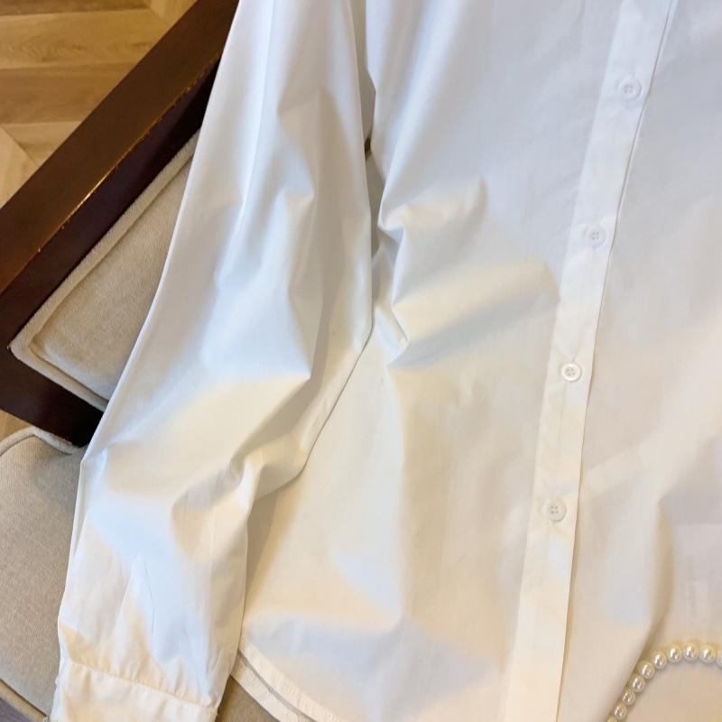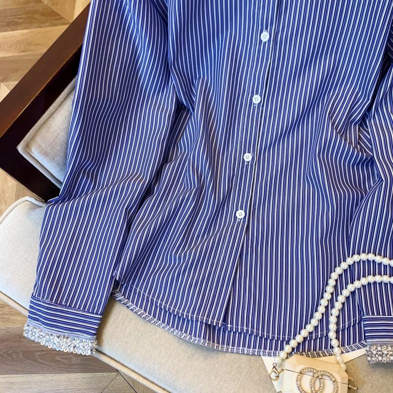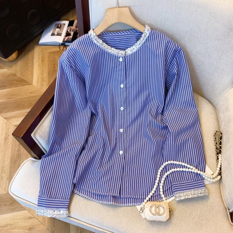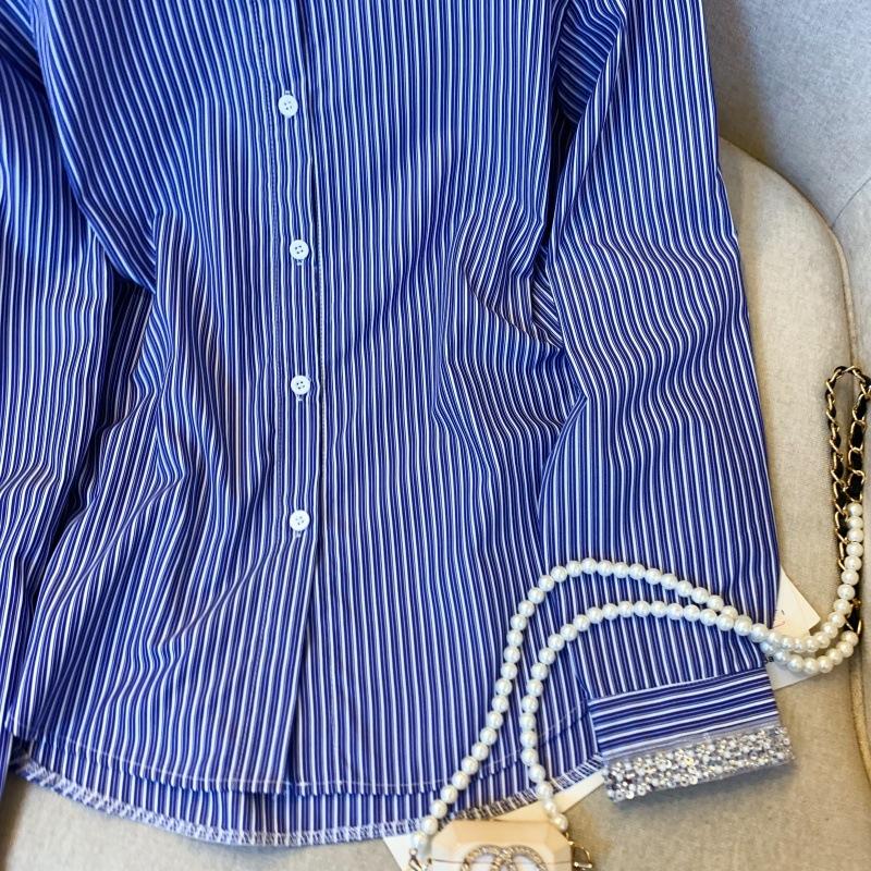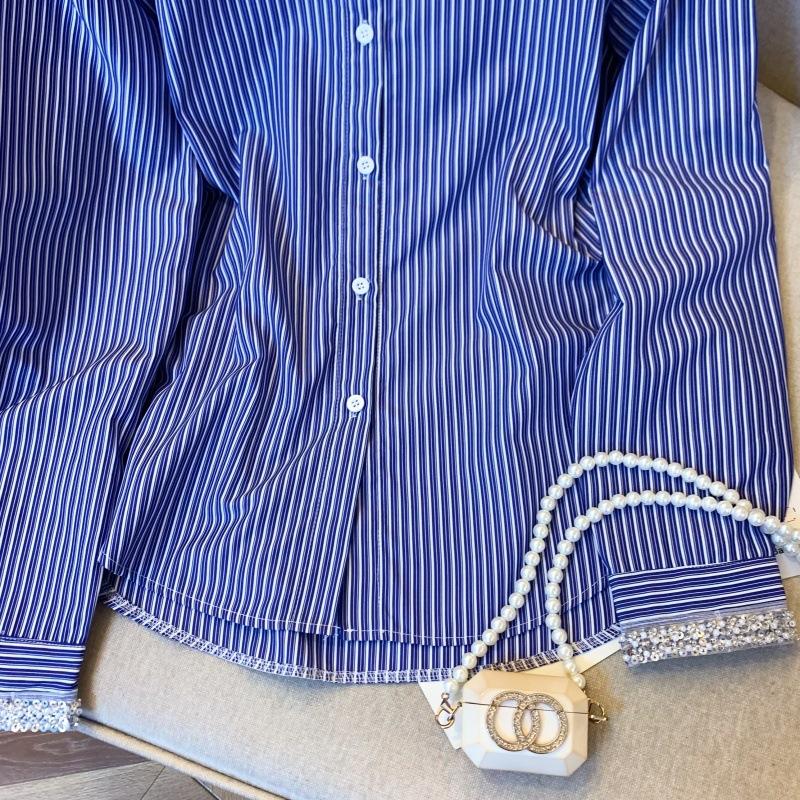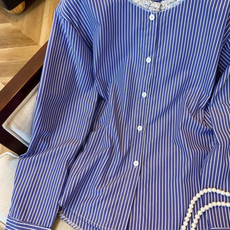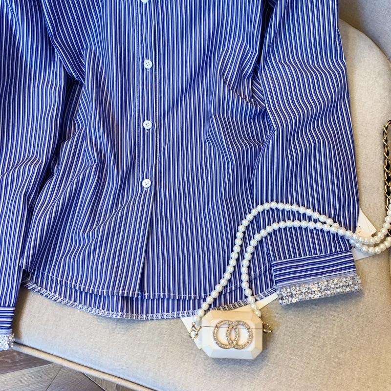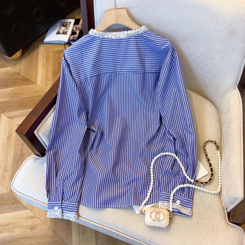 Foto real de diseño nicho dulce collar de perlas camisa de alta gama artículos europeos principios de primavera slim combinable camisa a rayas para mujer
