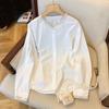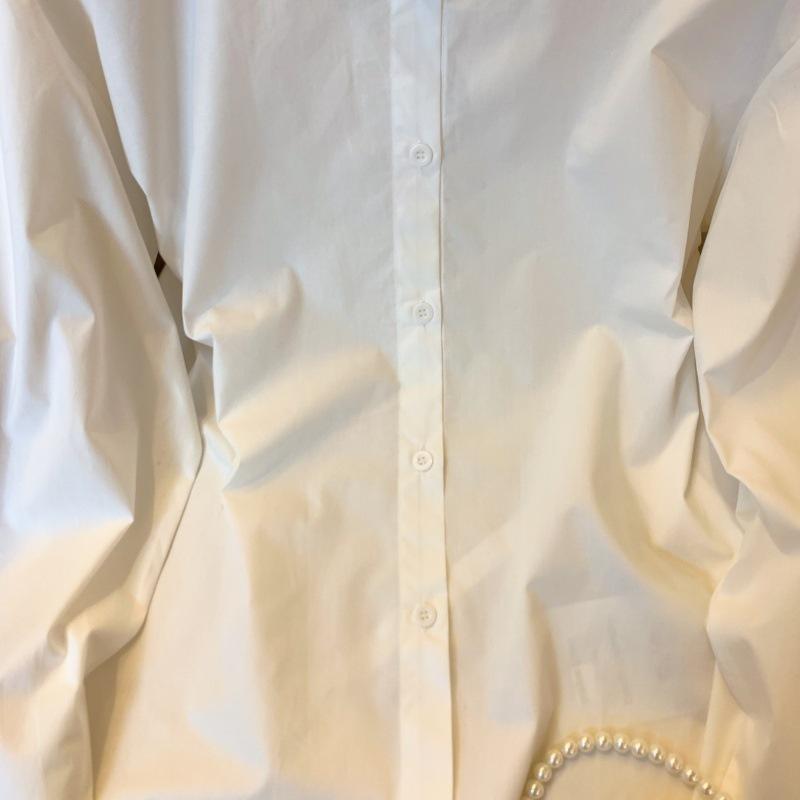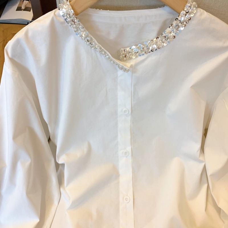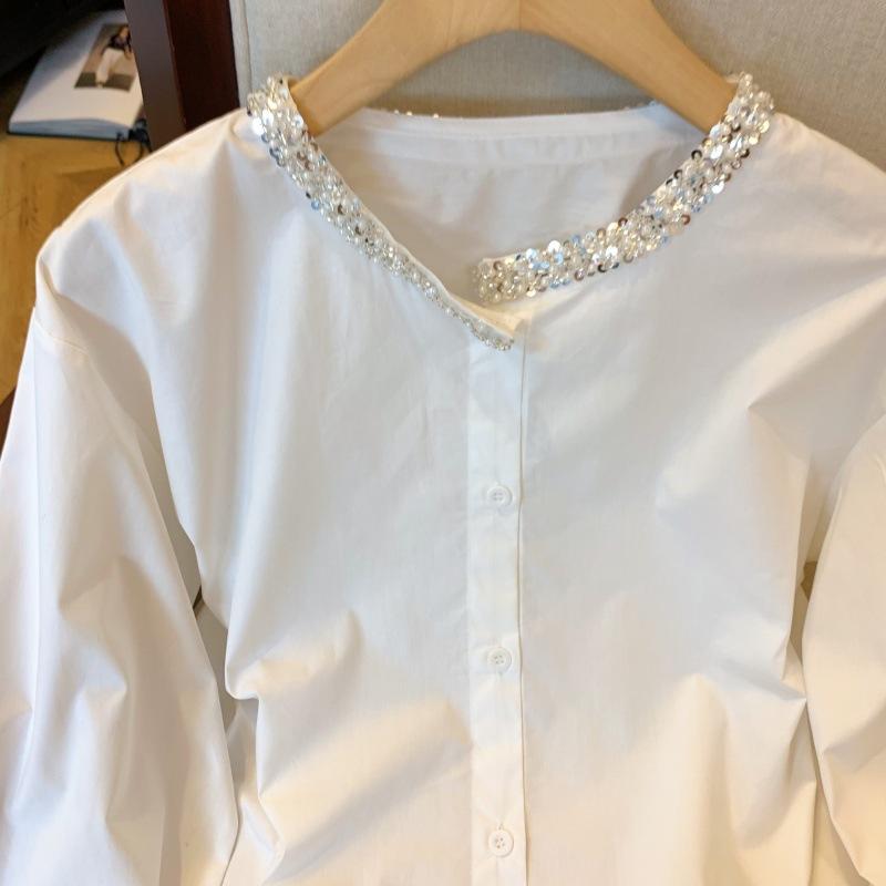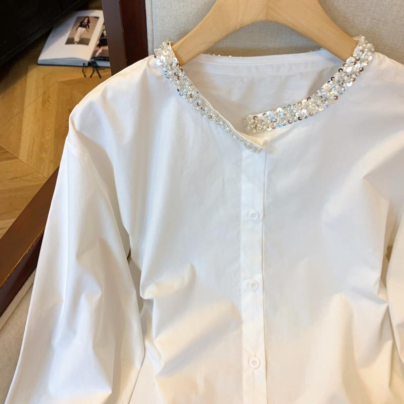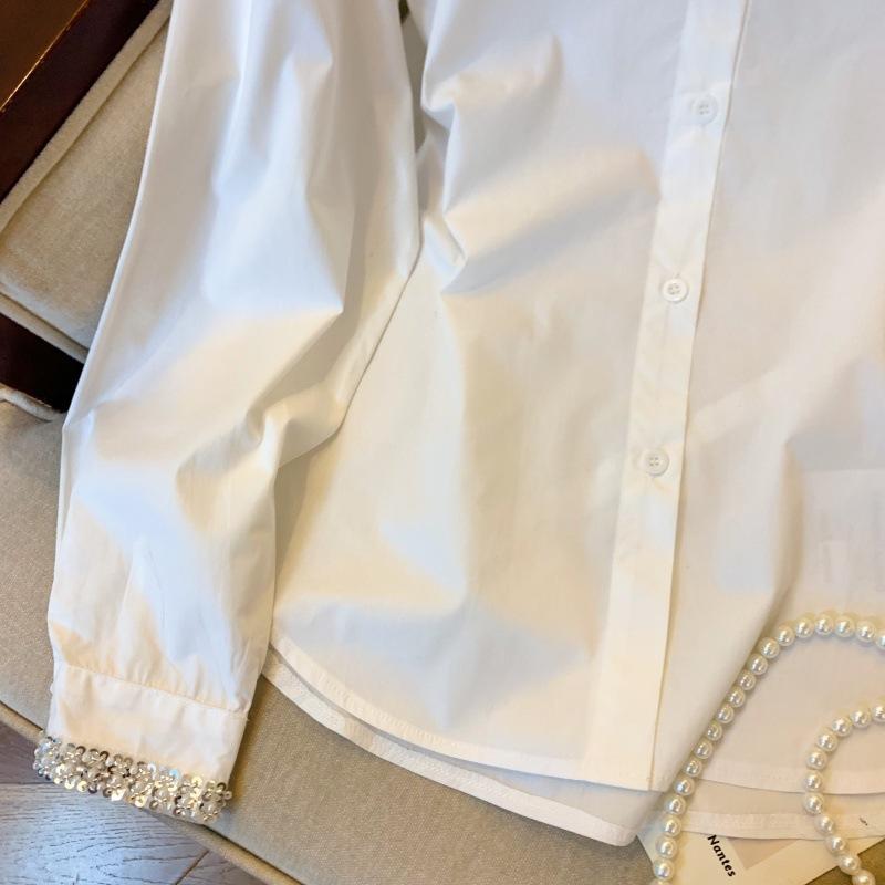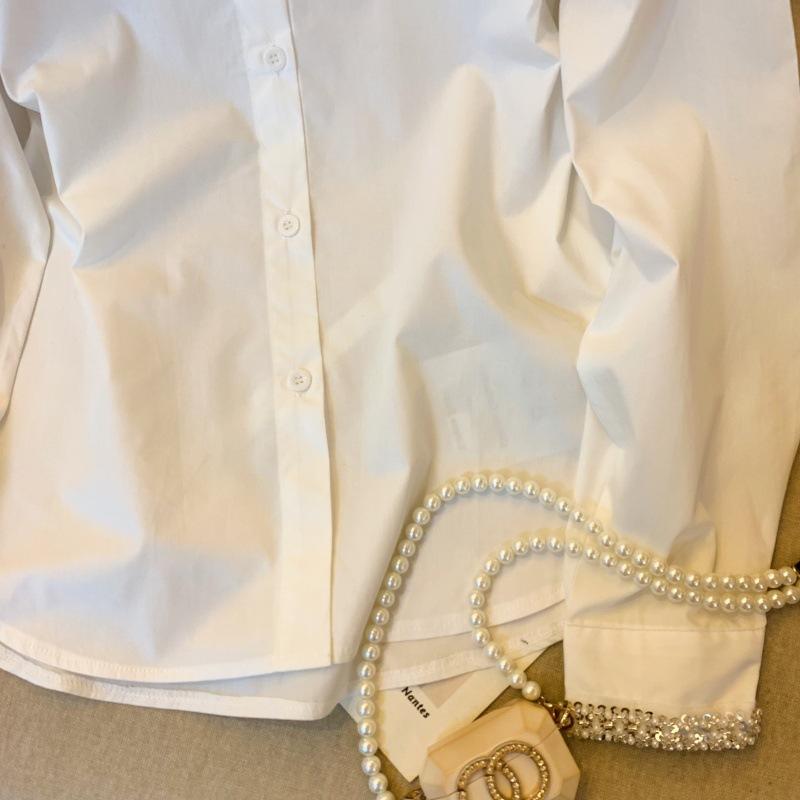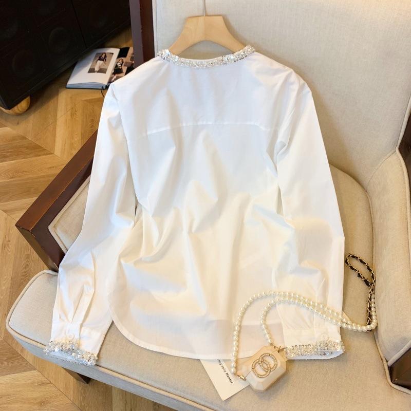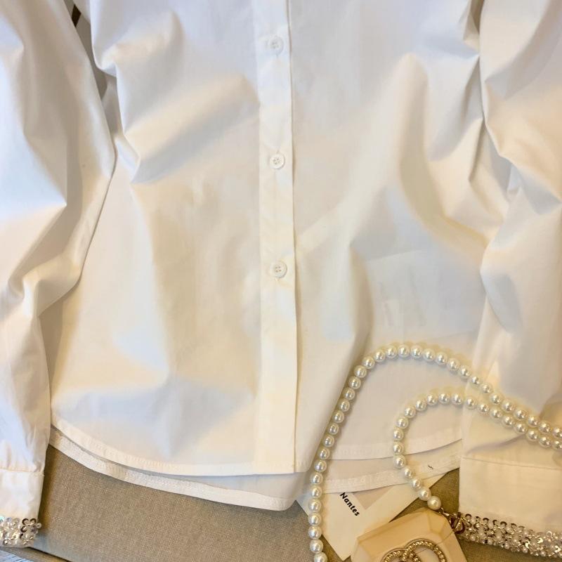Foto real de diseño nicho dulce collar de perlas camisa de alta gama artículos europeos principios de primavera slim combinable camisa a rayas para mujer