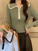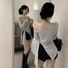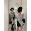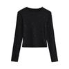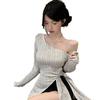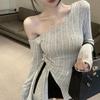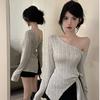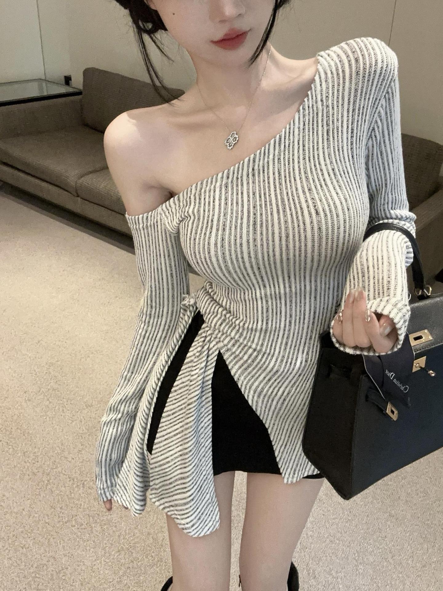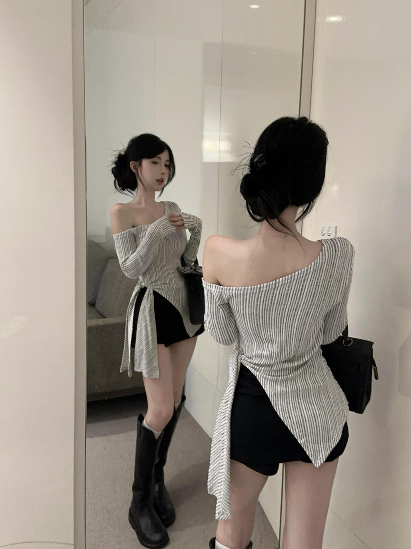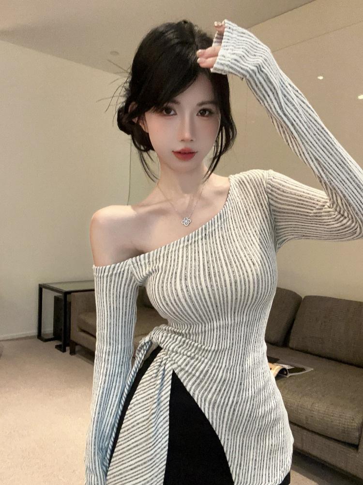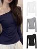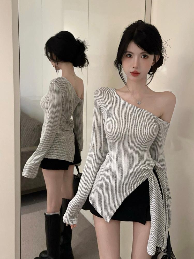 Chicas Calientes Moda Sexy Estilo Chanel Cuello Inclinado Diseño de Hombro Camiseta Manga Larga Otoño Nuevo Top Adelgazante Ajustado