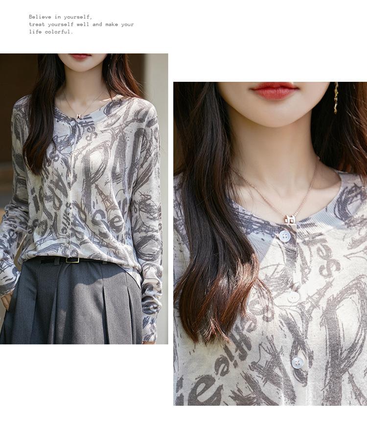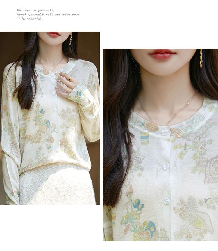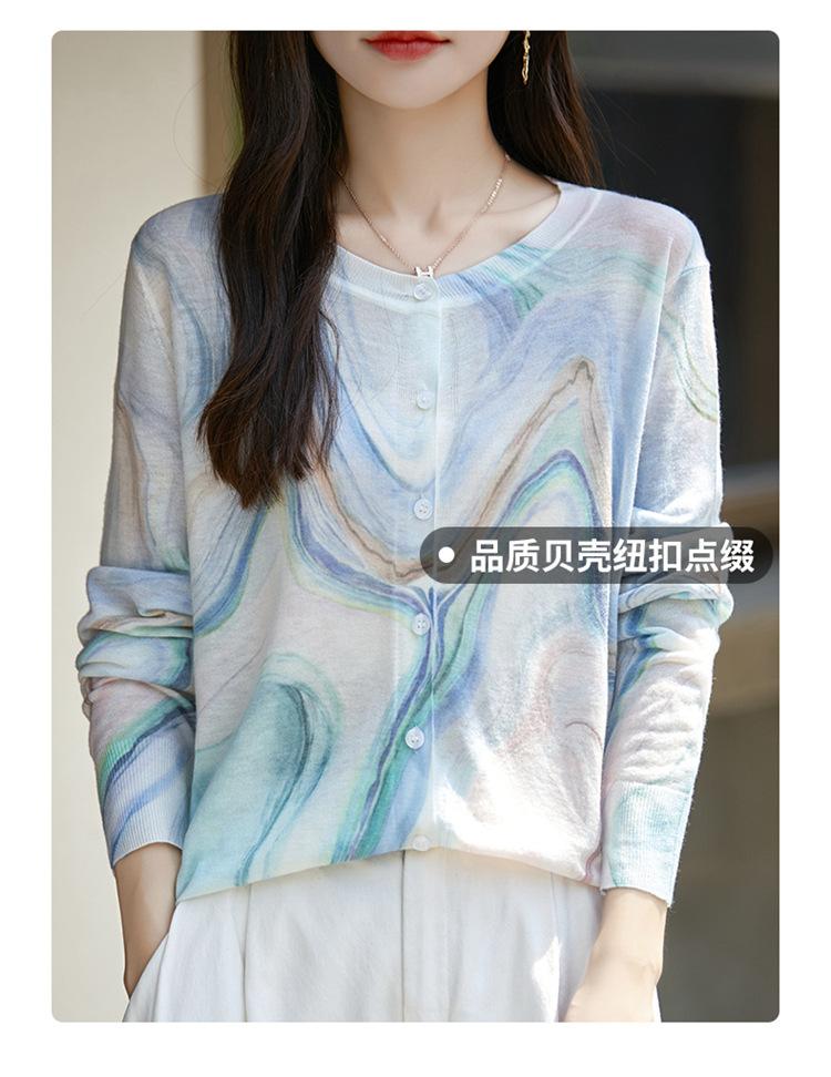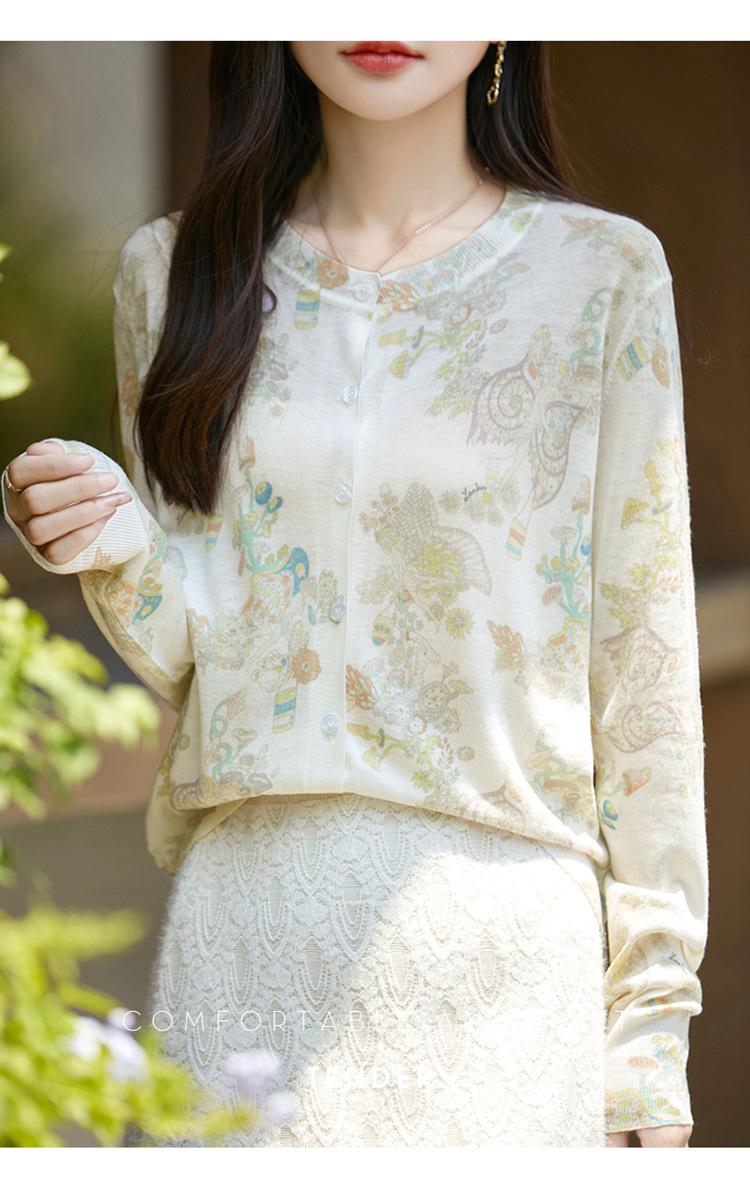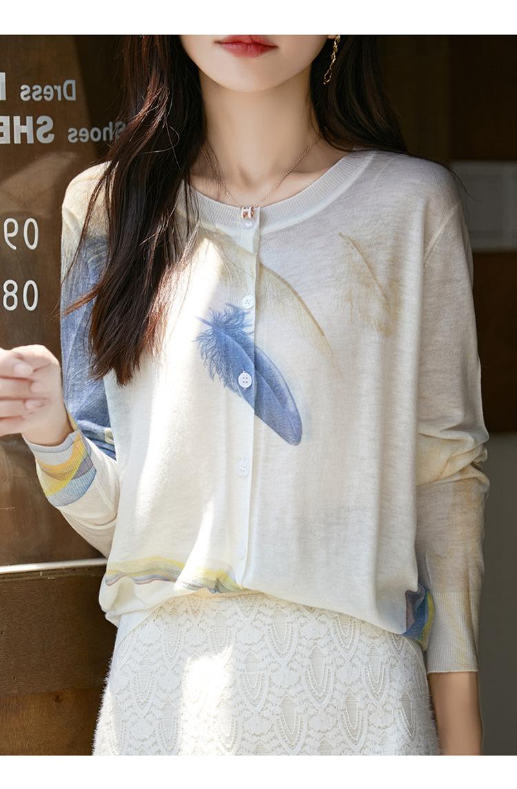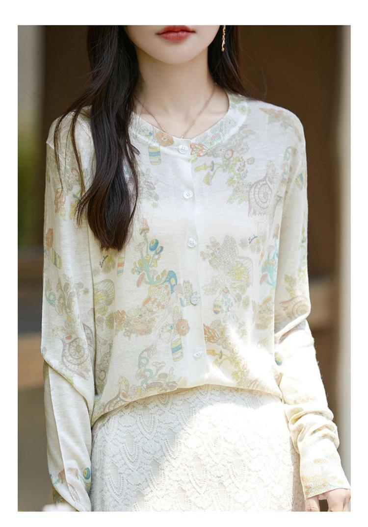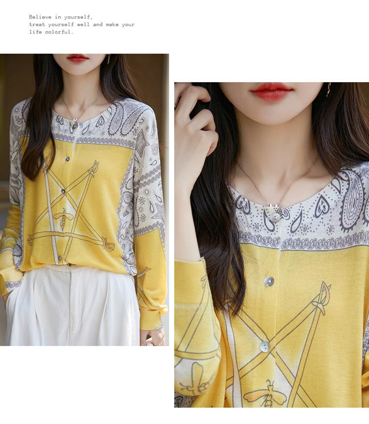 Cárdigan de punto con cuello redondo de lana peinada informal de primavera y verano, elegante top holgado con estampado que combina con todo para mujer