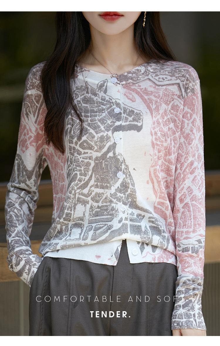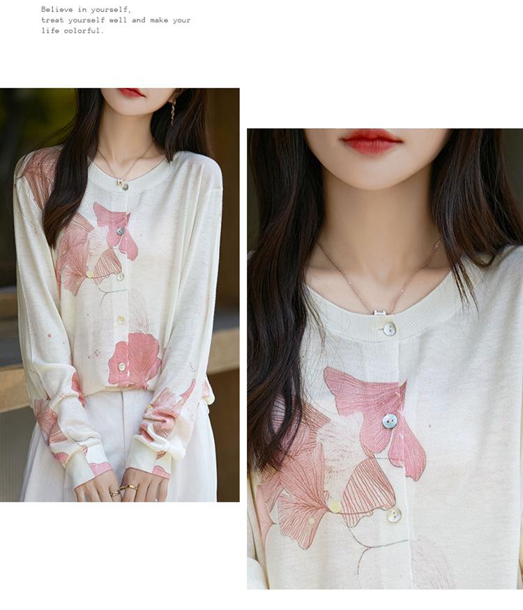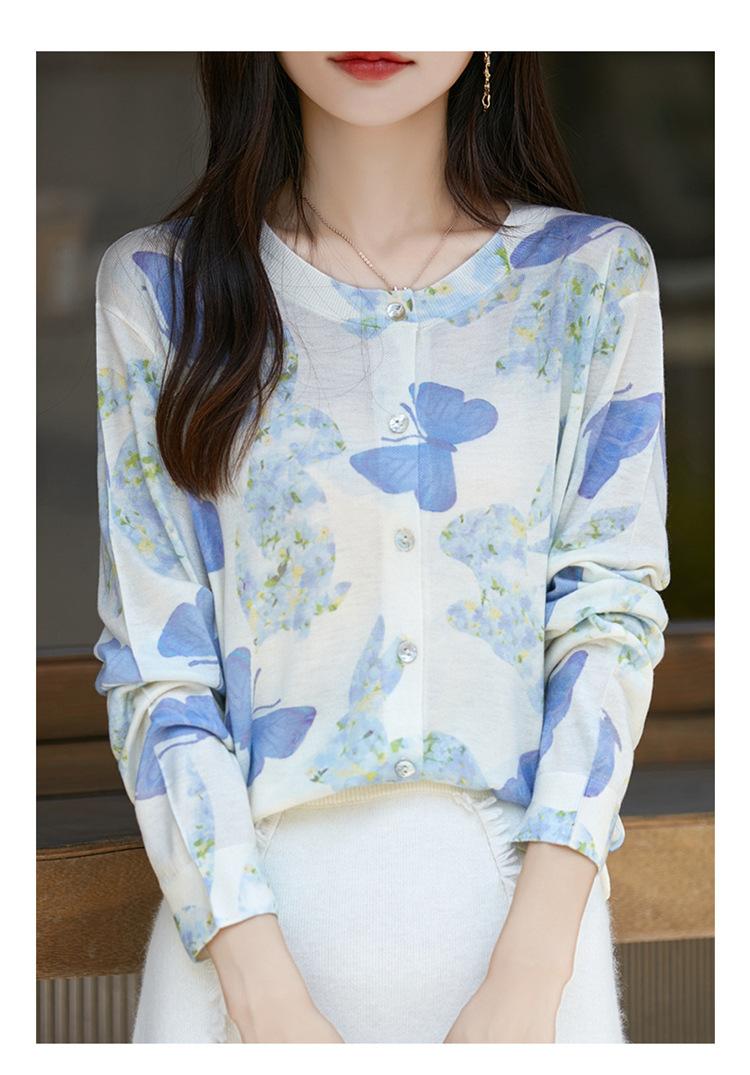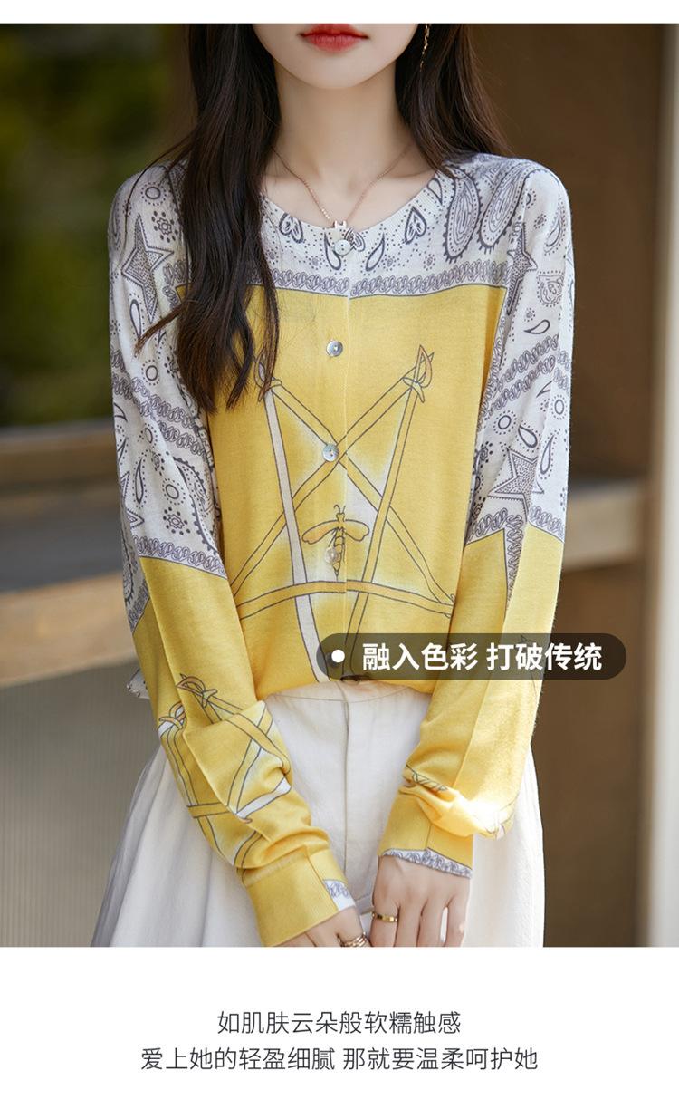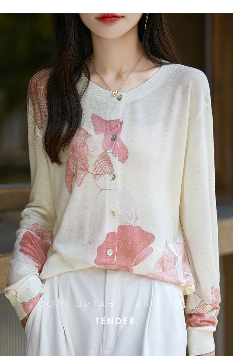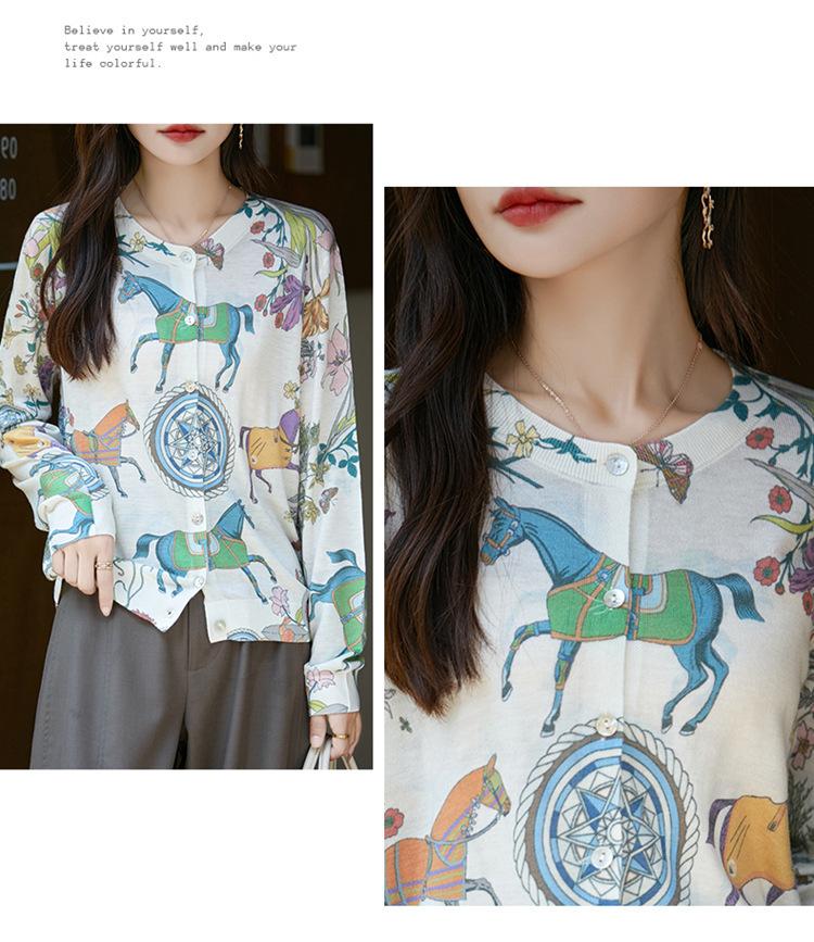 Cárdigan de punto con cuello redondo de lana peinada informal de primavera y verano, elegante top holgado con estampado que combina con todo para mujer