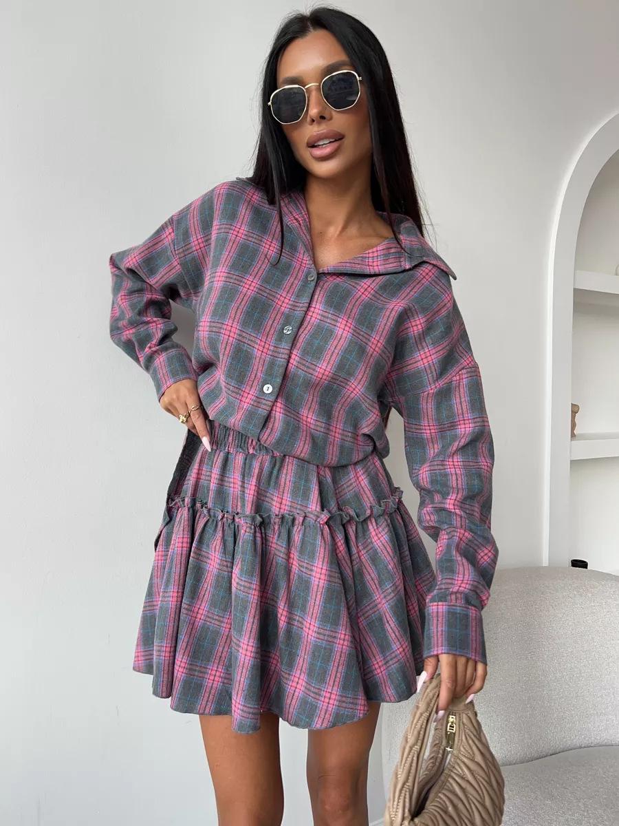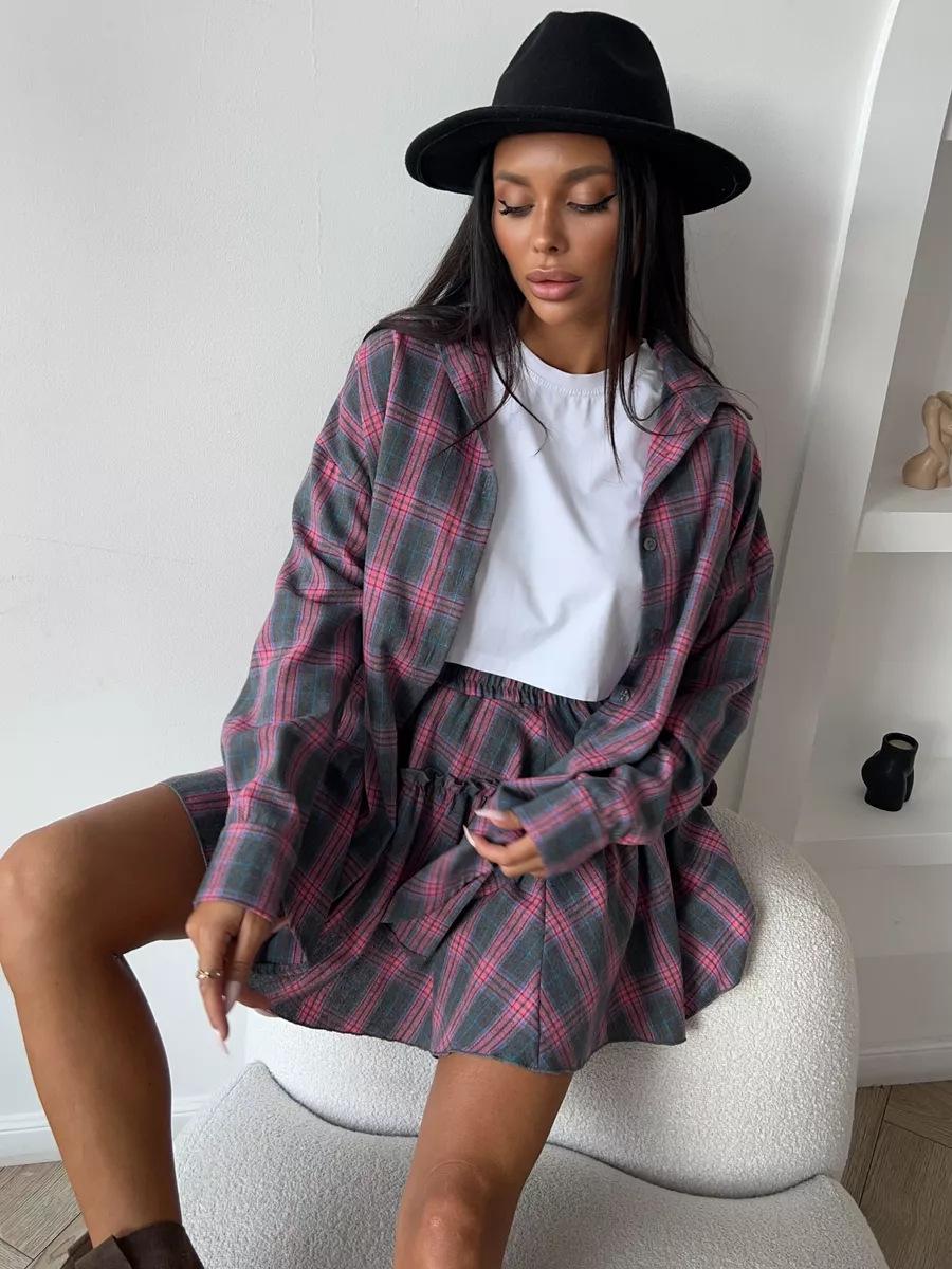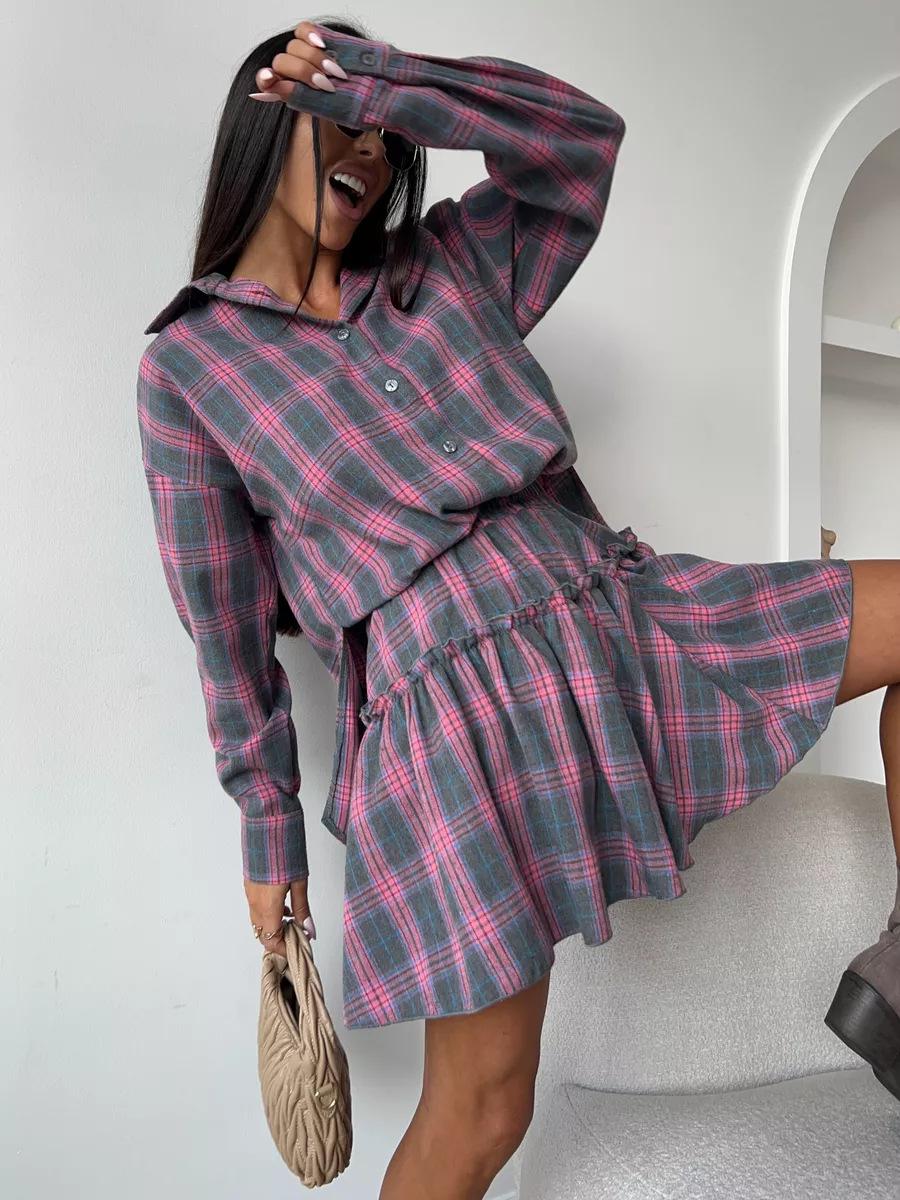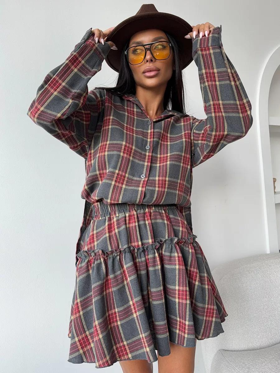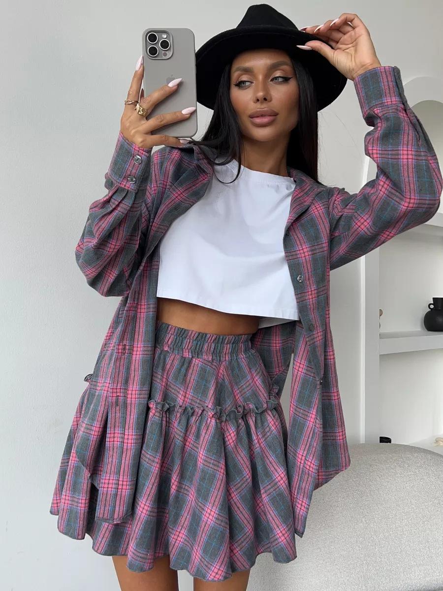 Conjunto de dos piezas formado por falda y pantalón a cuadros, para mujer, estilo informal, con solapa, camisa holgada y tirantes, cintura ajustada, 2025