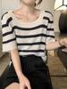 Suéter de punto de seda helada a rayas con cuello cuadrado retro de estilo francés para mujer, diseño de manga corta, top holgado de punto pequeño y elegante.