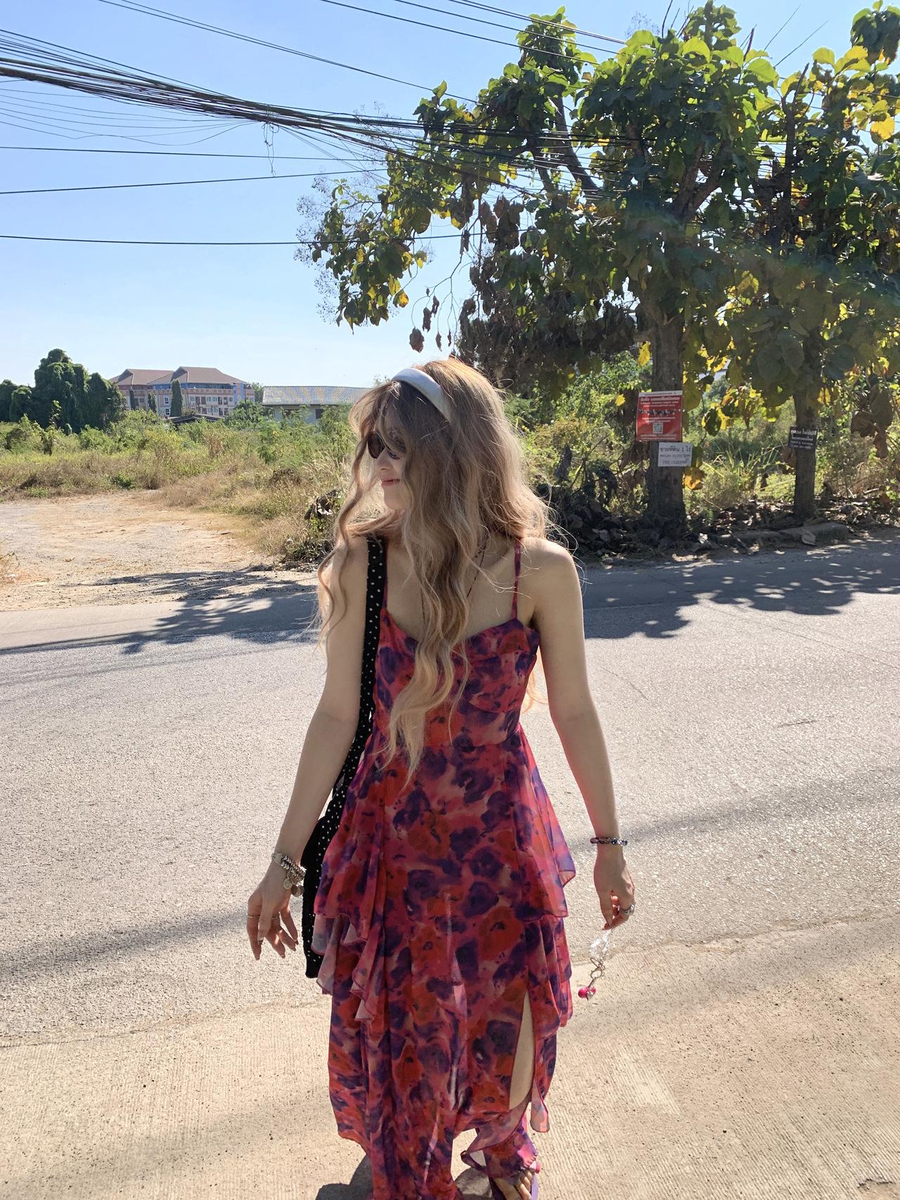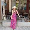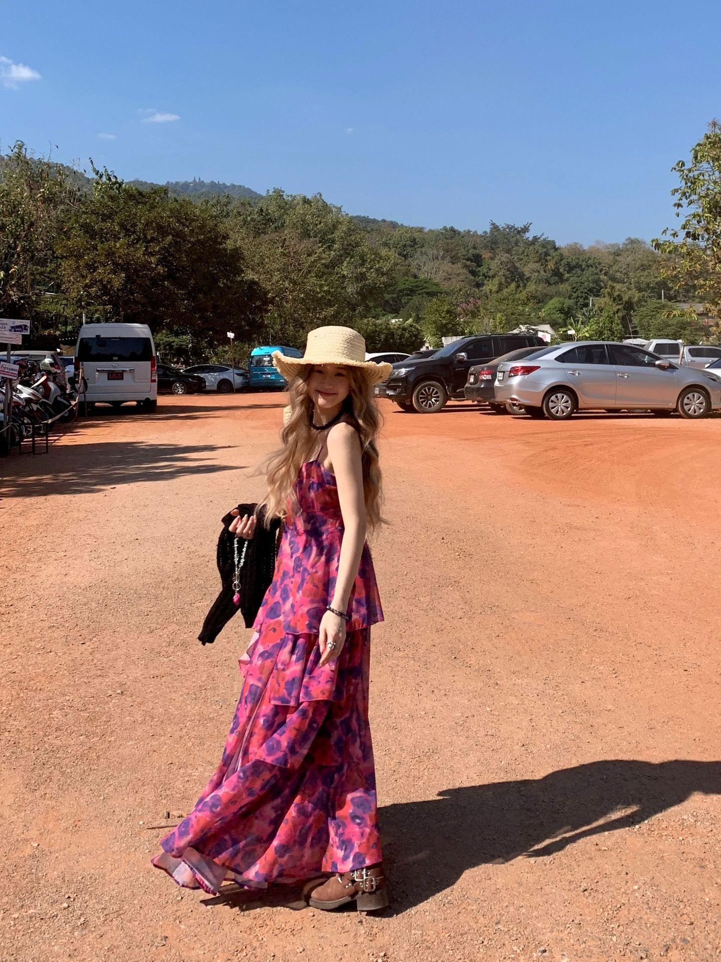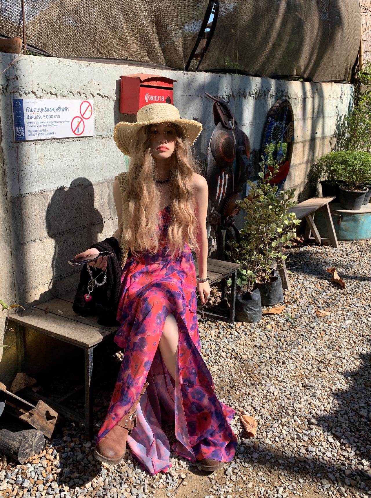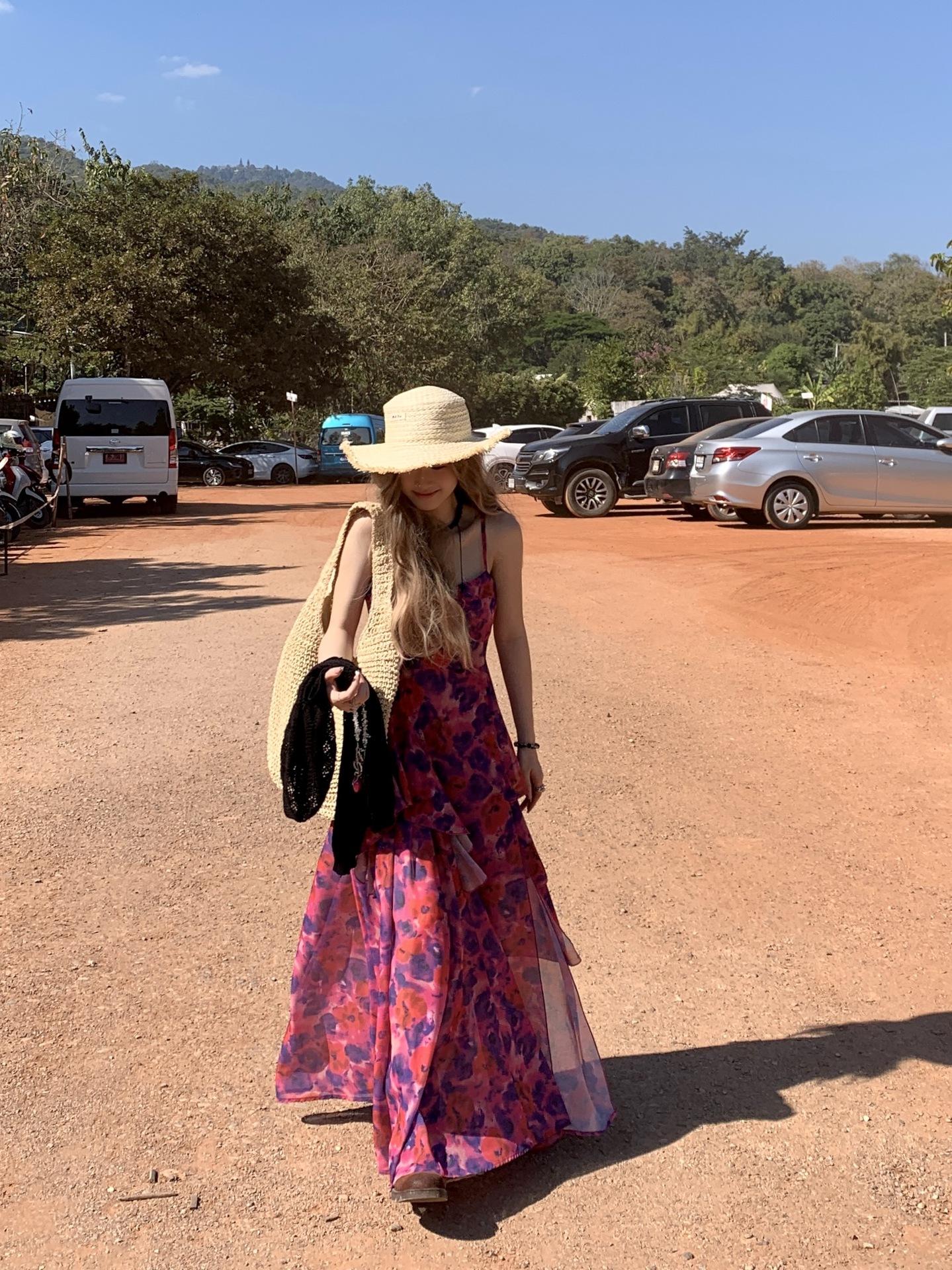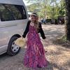Vestido Talla Grande Flor Cintura Volantes Abertura Ajustado Tirantes Atmósfera Verano Aspecto Adelgazante Dama Gentil Vestido Largo