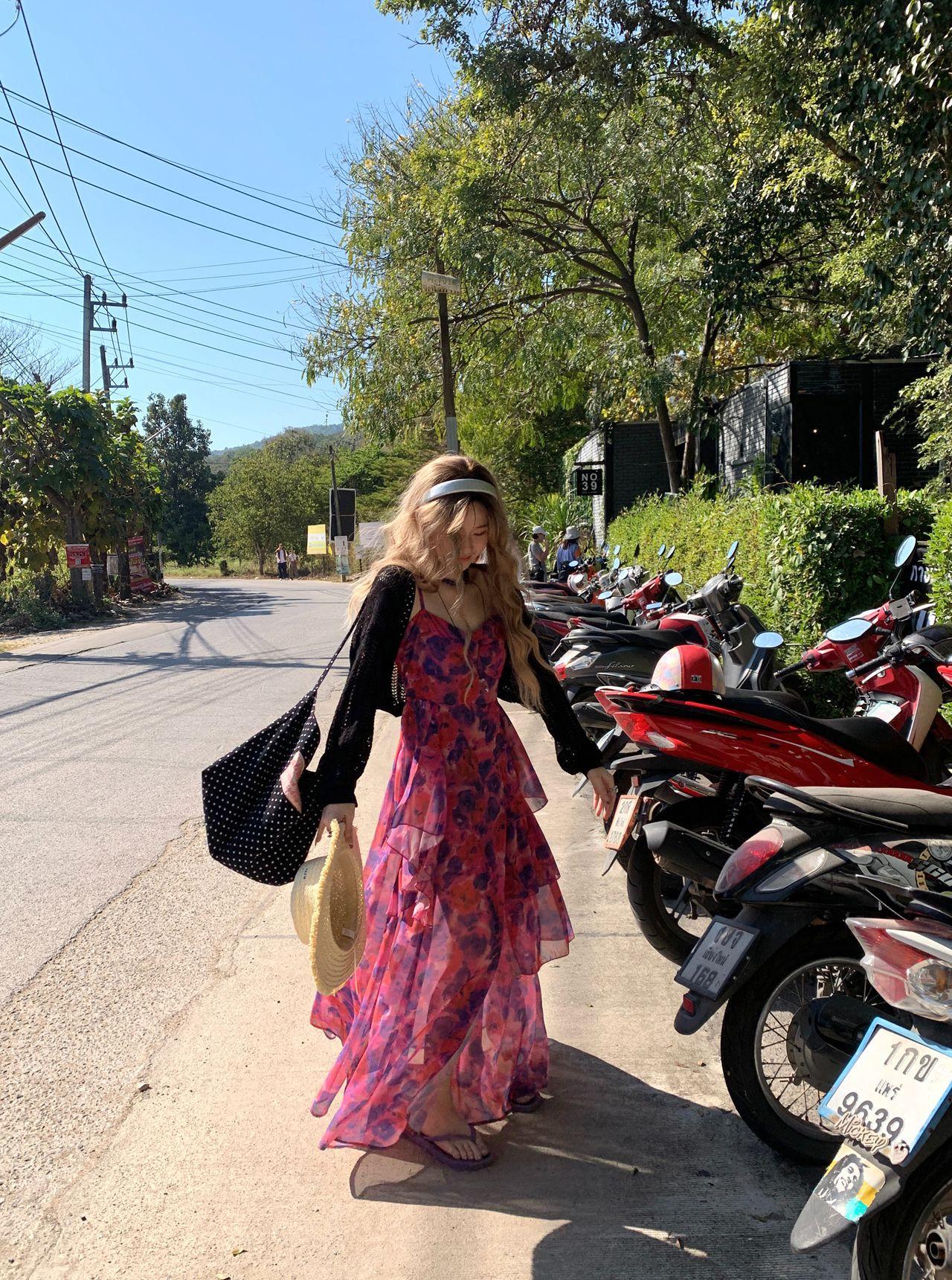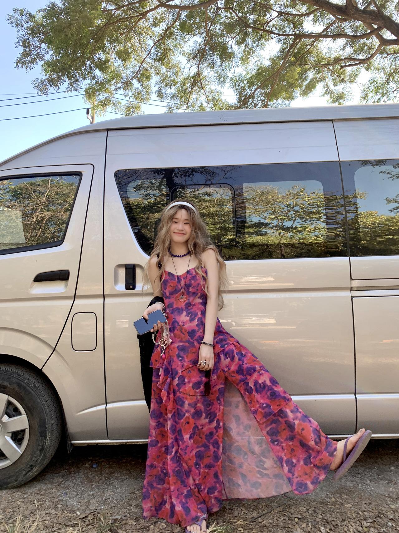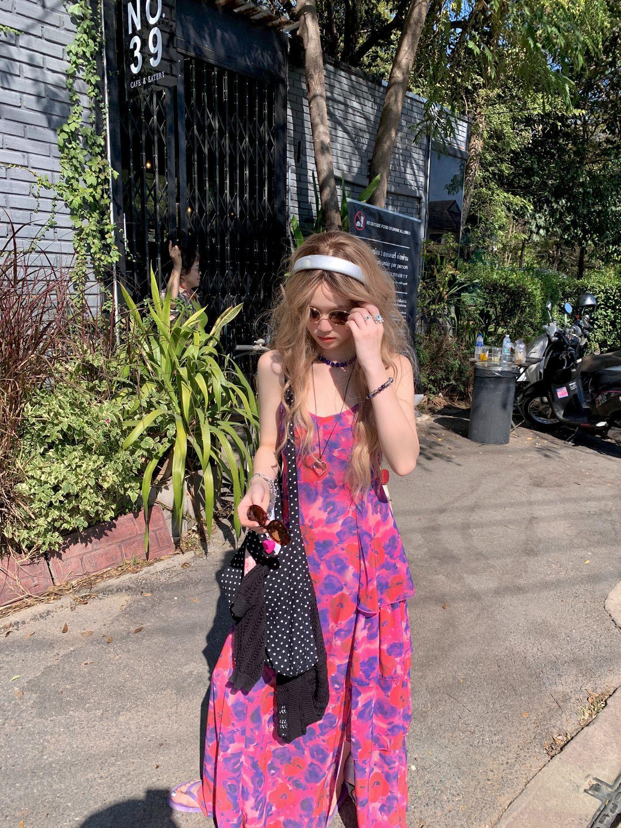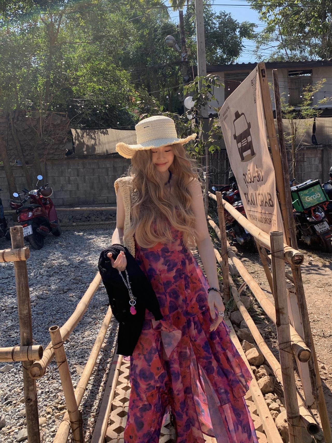 Vestido Talla Grande Flor Cintura Volantes Abertura Ajustado Tirantes Atmósfera Verano Aspecto Adelgazante Dama Gentil Vestido Largo
