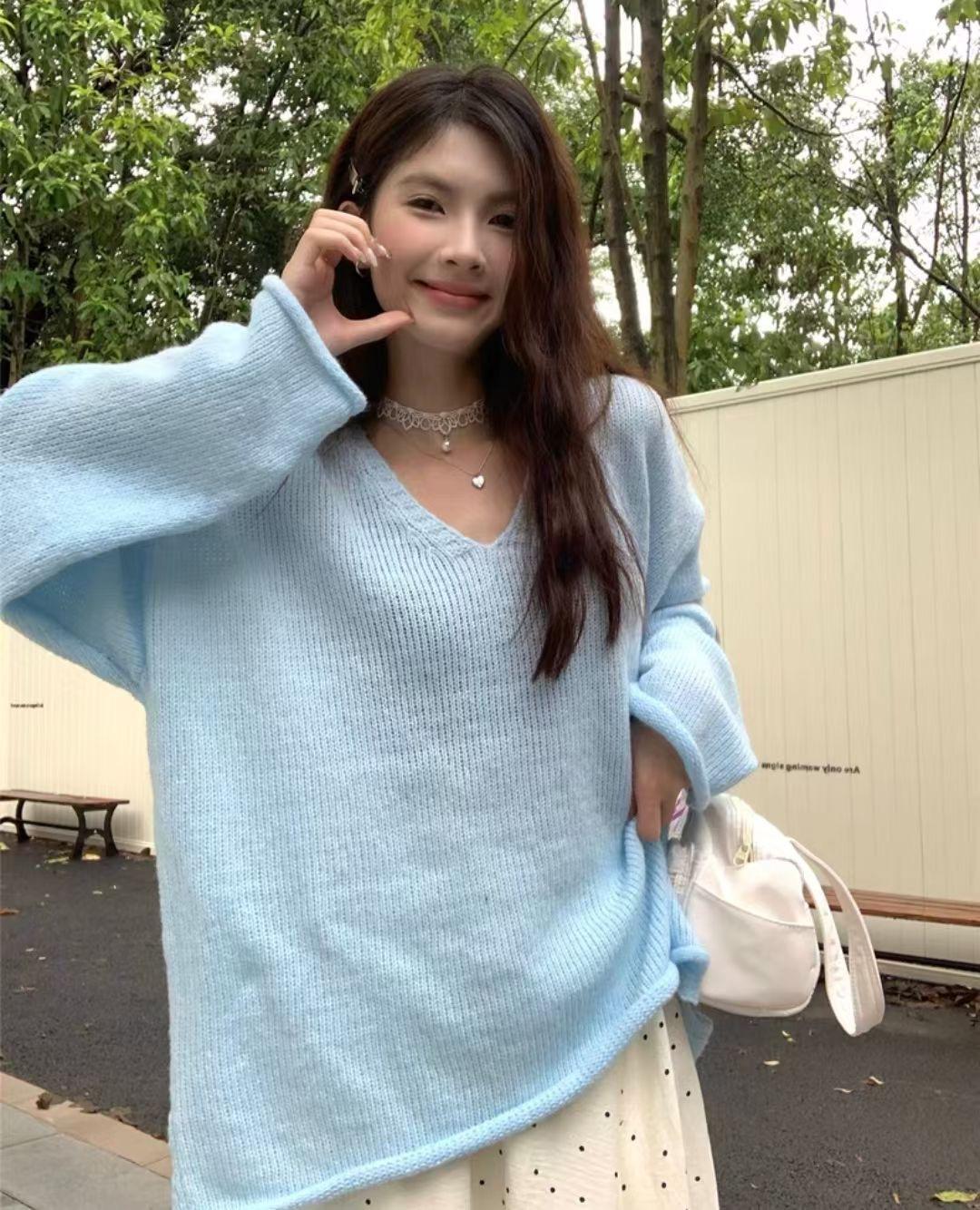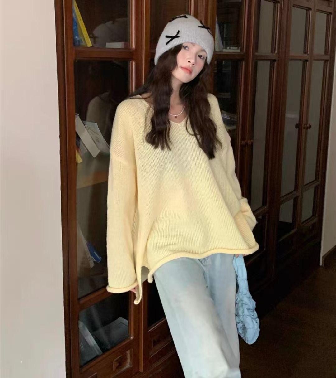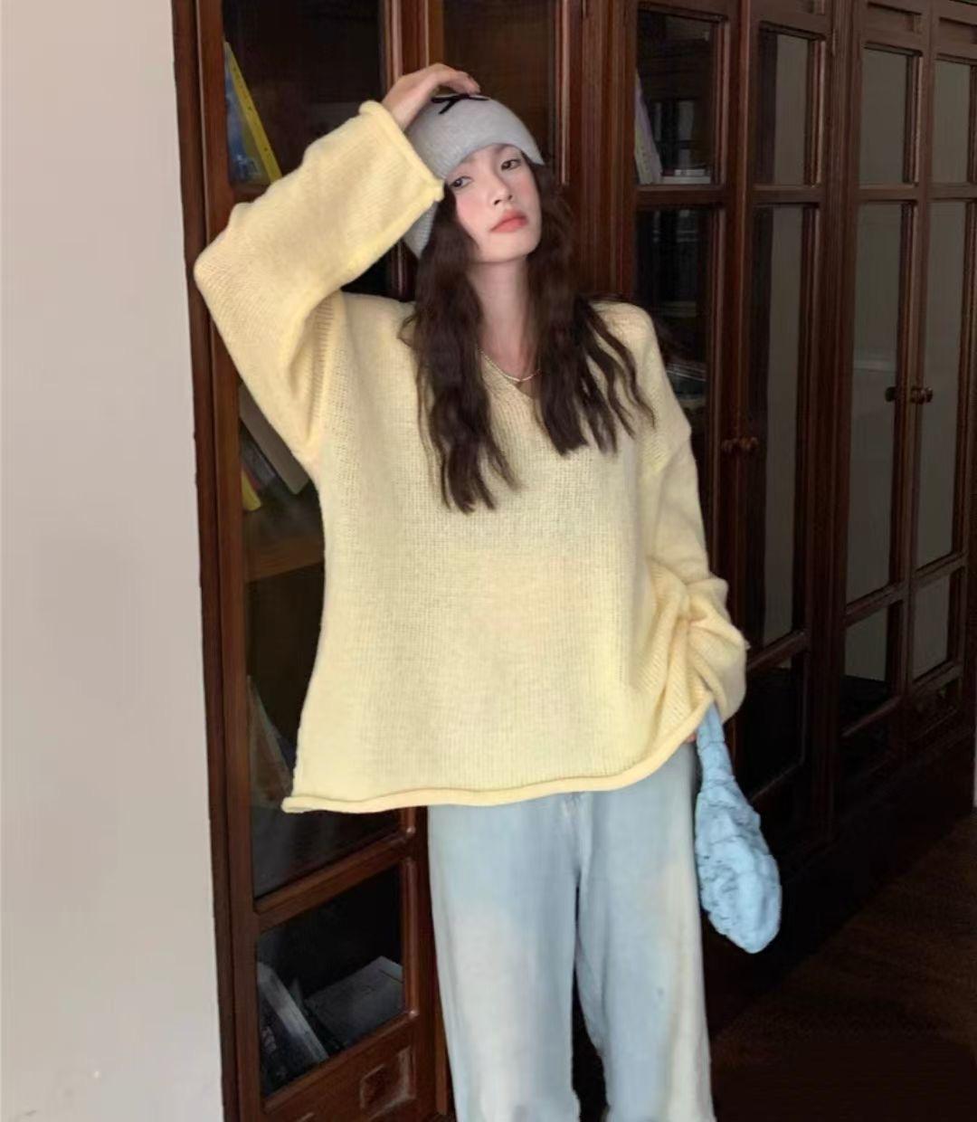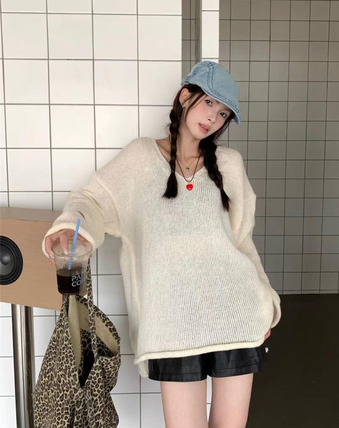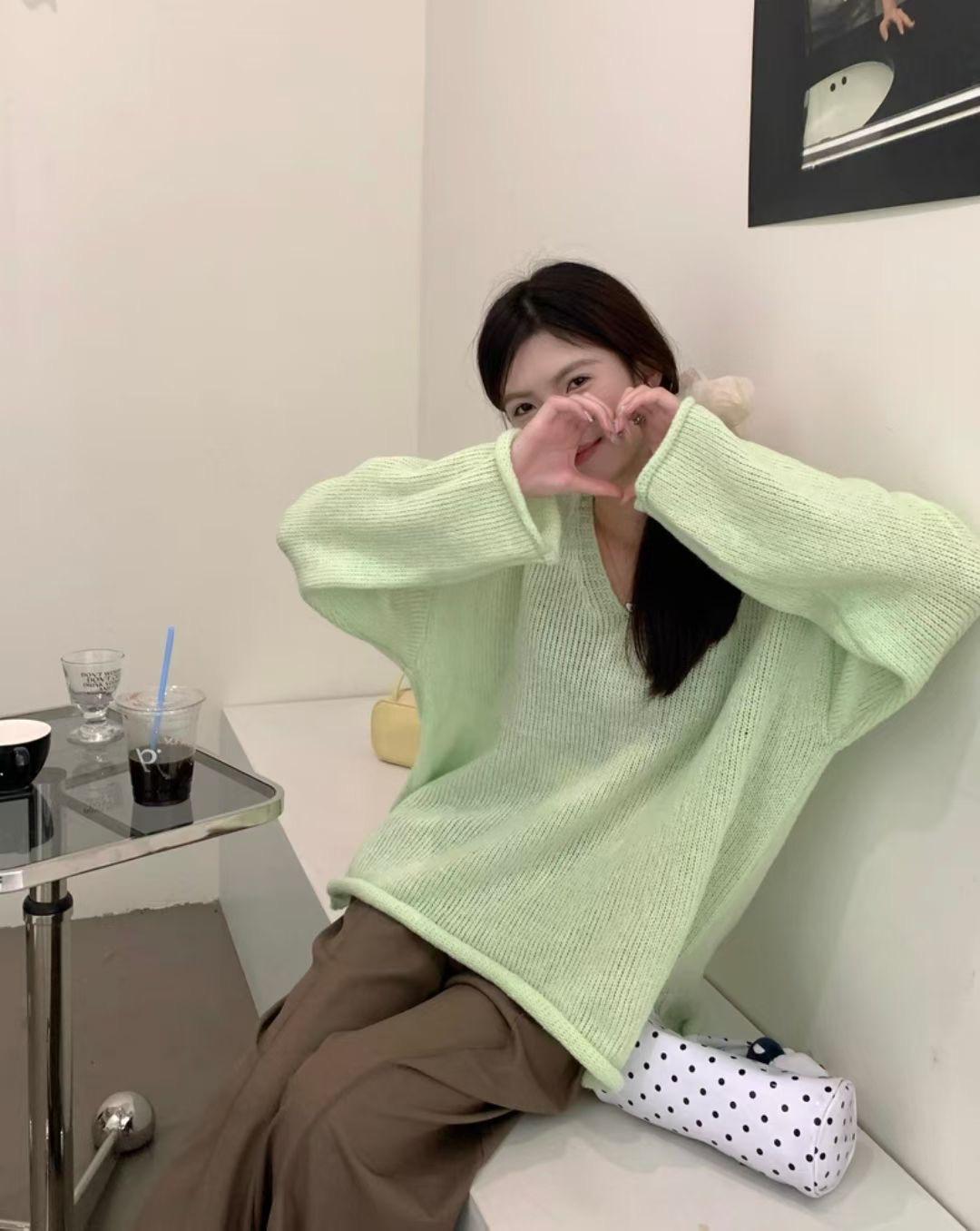 Suéter coreano de cuello en V, estilo holgado, fino, liso, 2025, combina con todo, tendencia 949