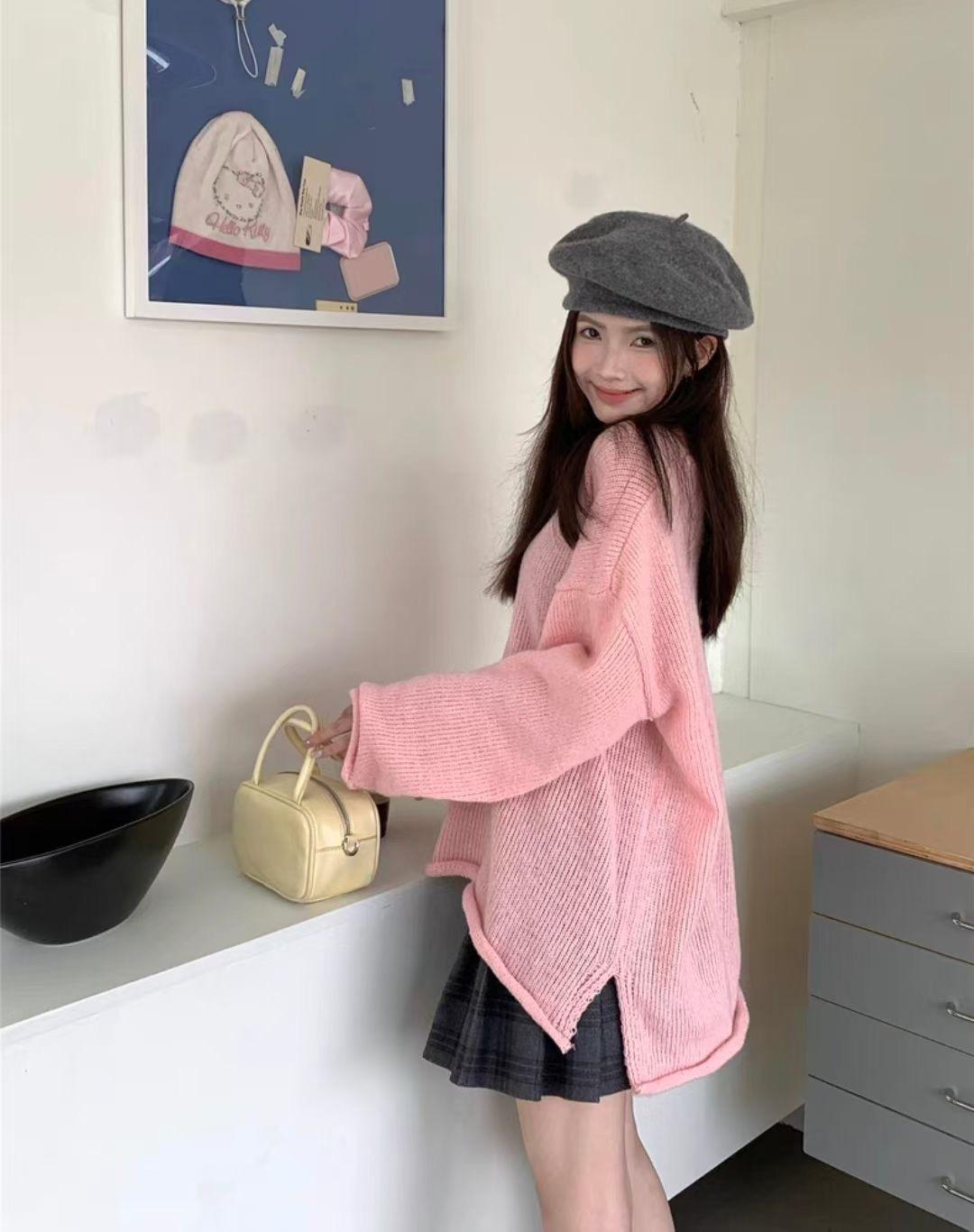 Pink rolled v-neck thin sweater