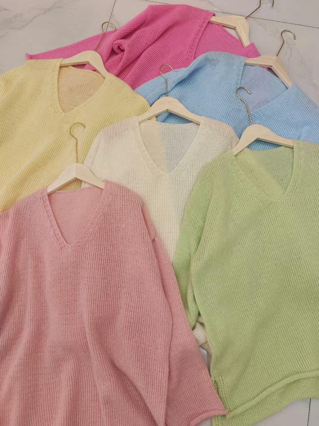 Off-white rolled v-neck thin sweater, Pink rolled v-neck thin sweater, Blue rolled v-neck thin sweater, Green ...