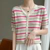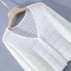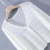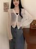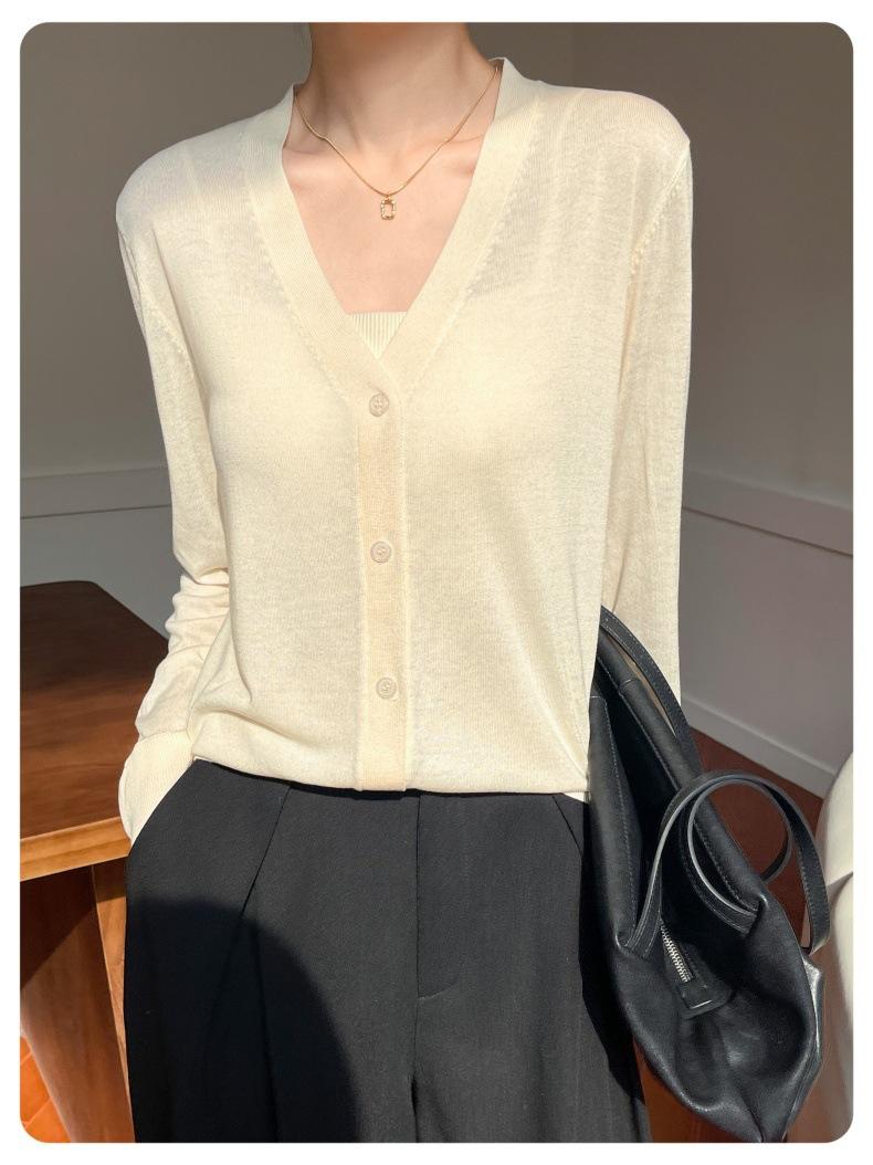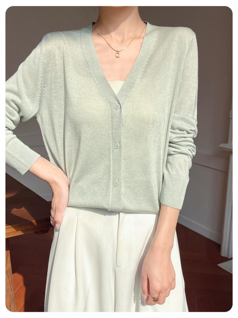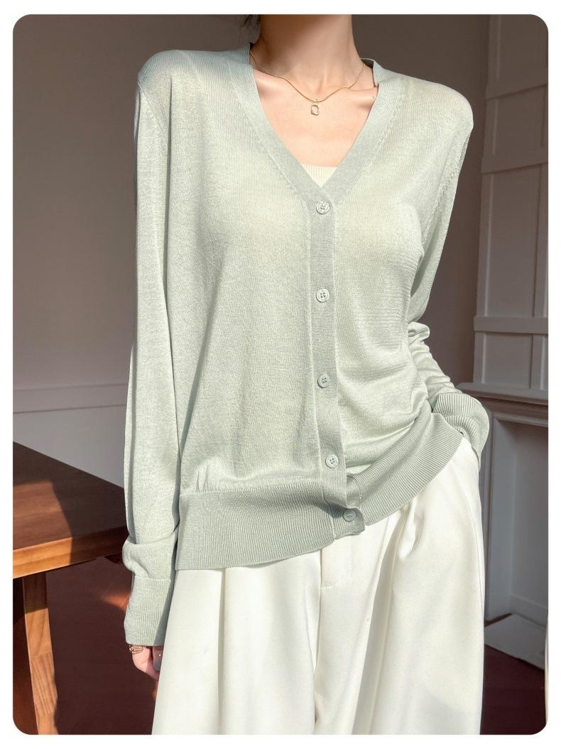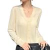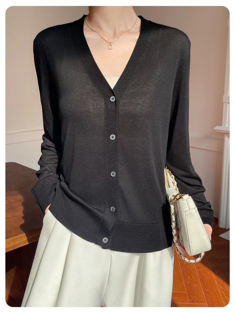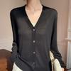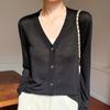 Camisa de verano de manga larga con cuello en V y seda helada, fina y a la moda, con protección solar, estilo coreano, pequeña, de punto, color negro, para mujer