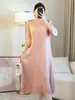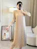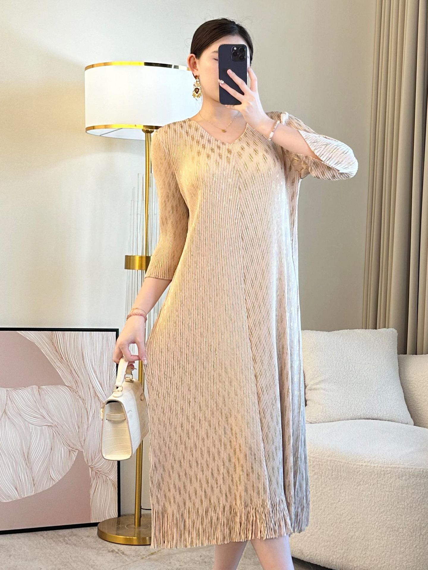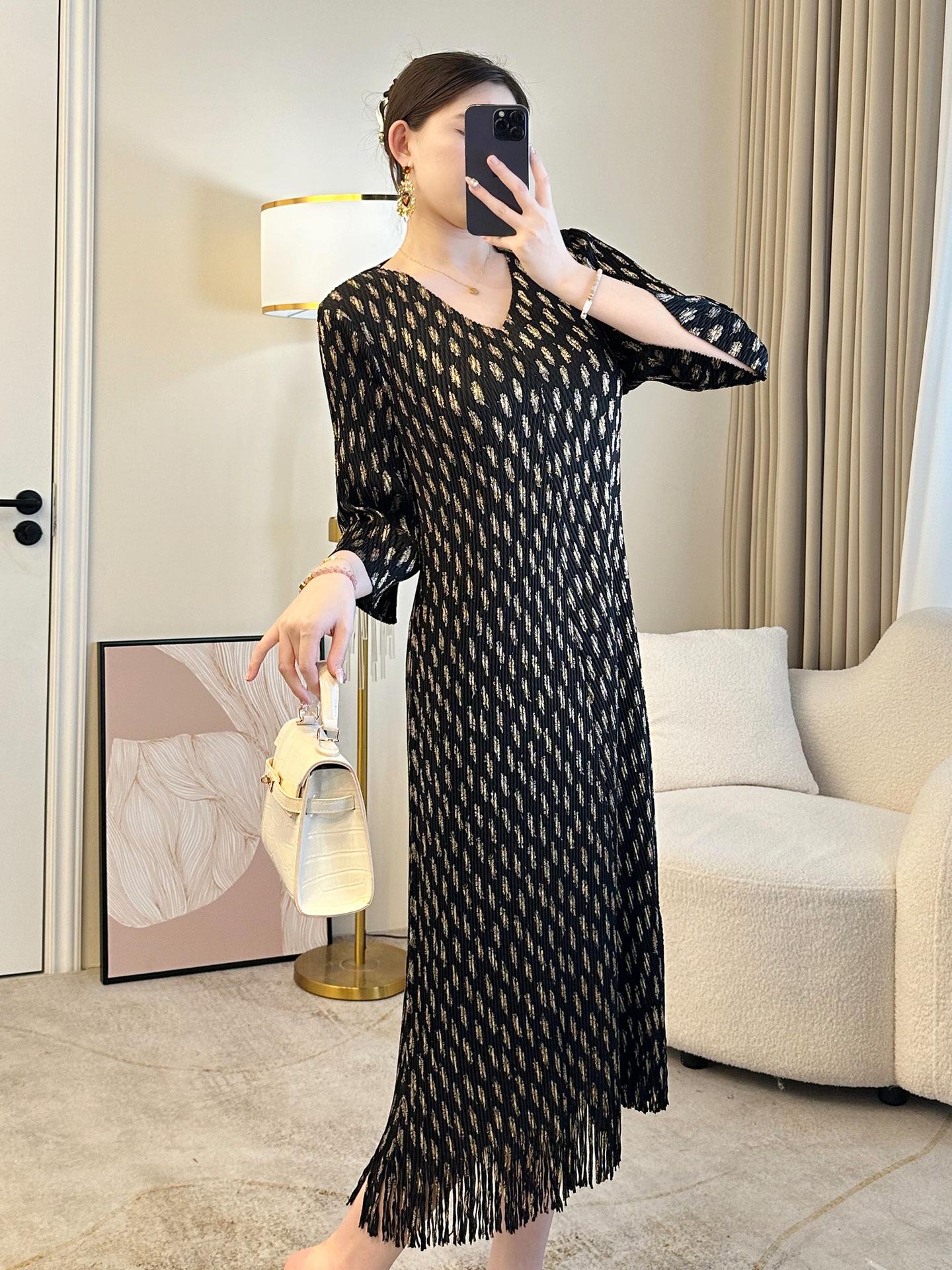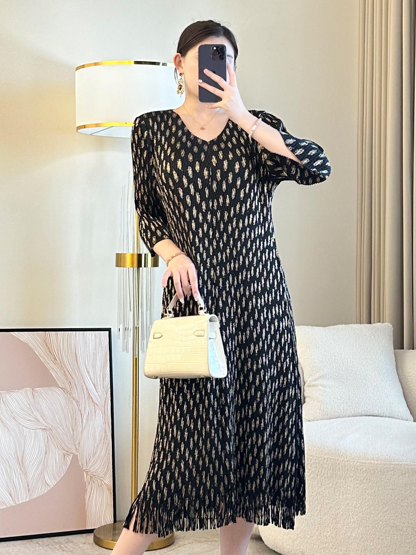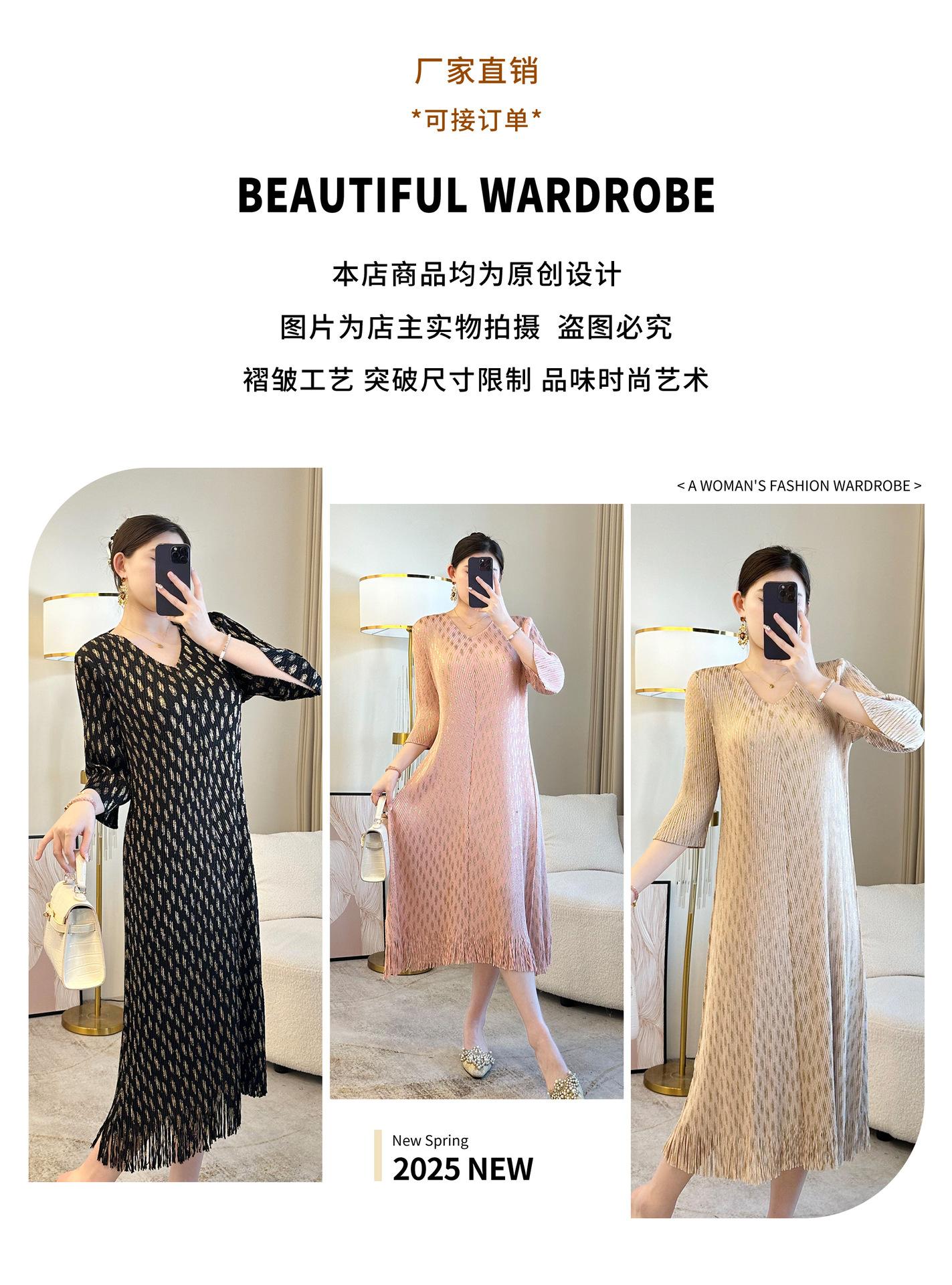 2025 verano nueva falda suelta Miyake plisada cuello en V elegante moda temperamento borla vestido una generación de cabello