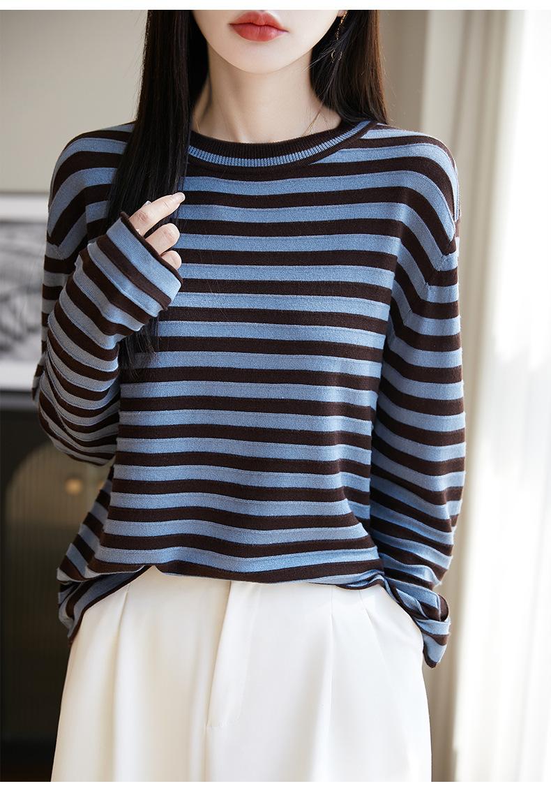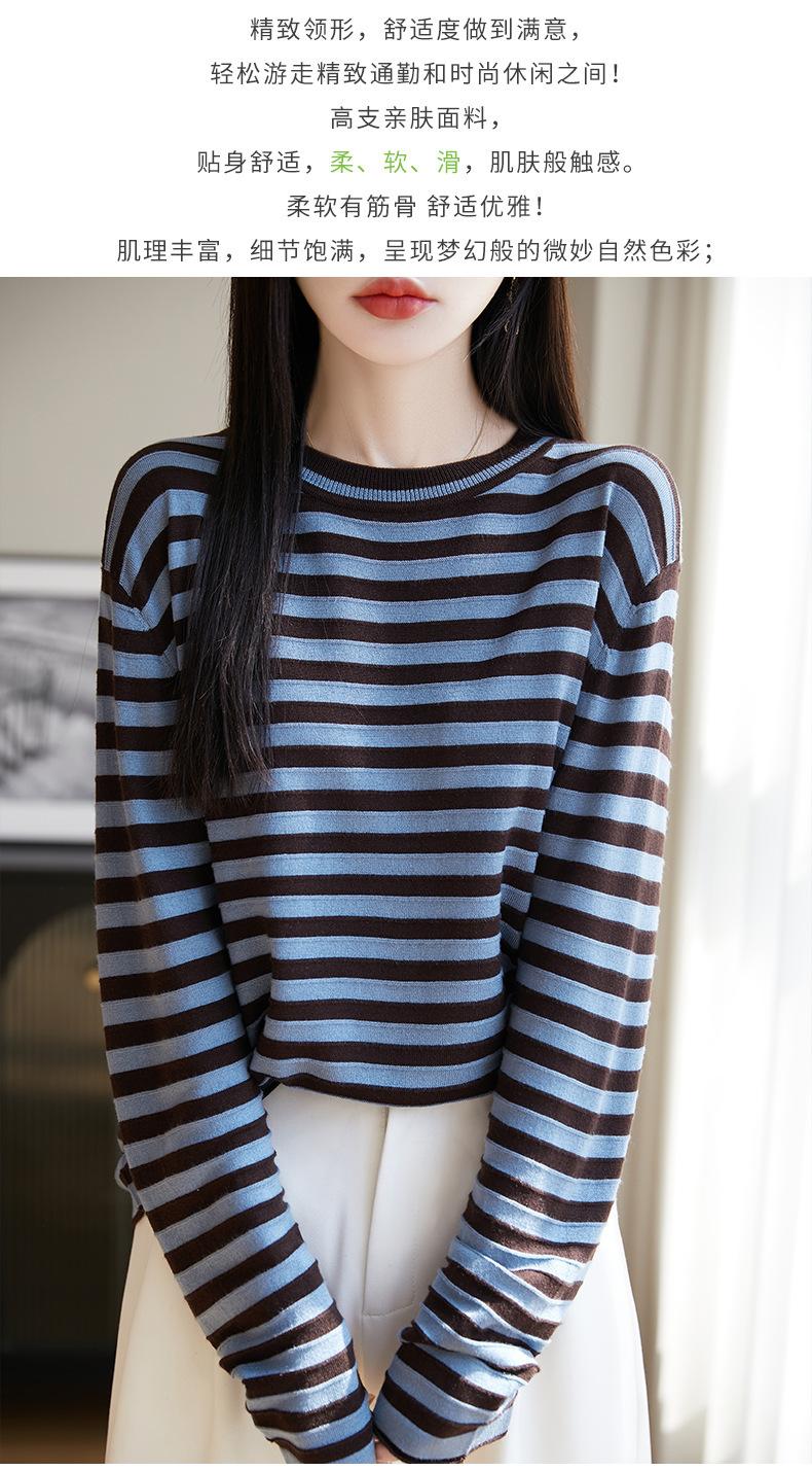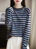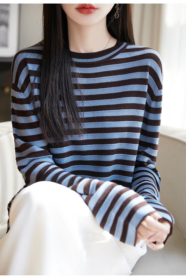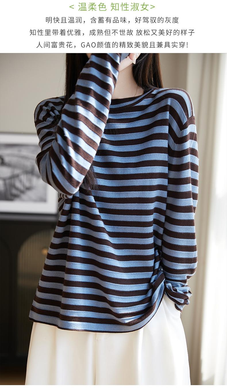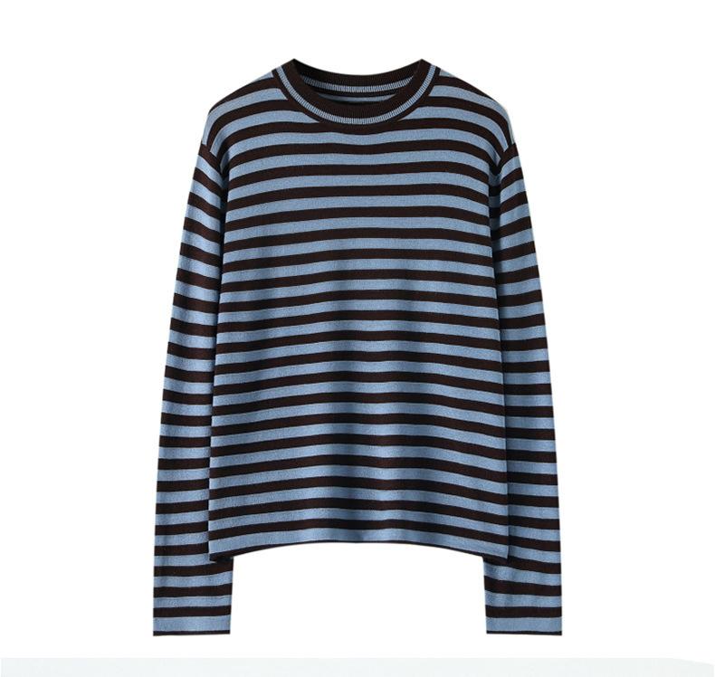 Suéter de Punto Redondo Adelgazante Antiedad para Mujer con Rayas Contrastantes, Camiseta Básica de Manga Larga Suelta, Nuevo Top para Primavera y Otoño 2025