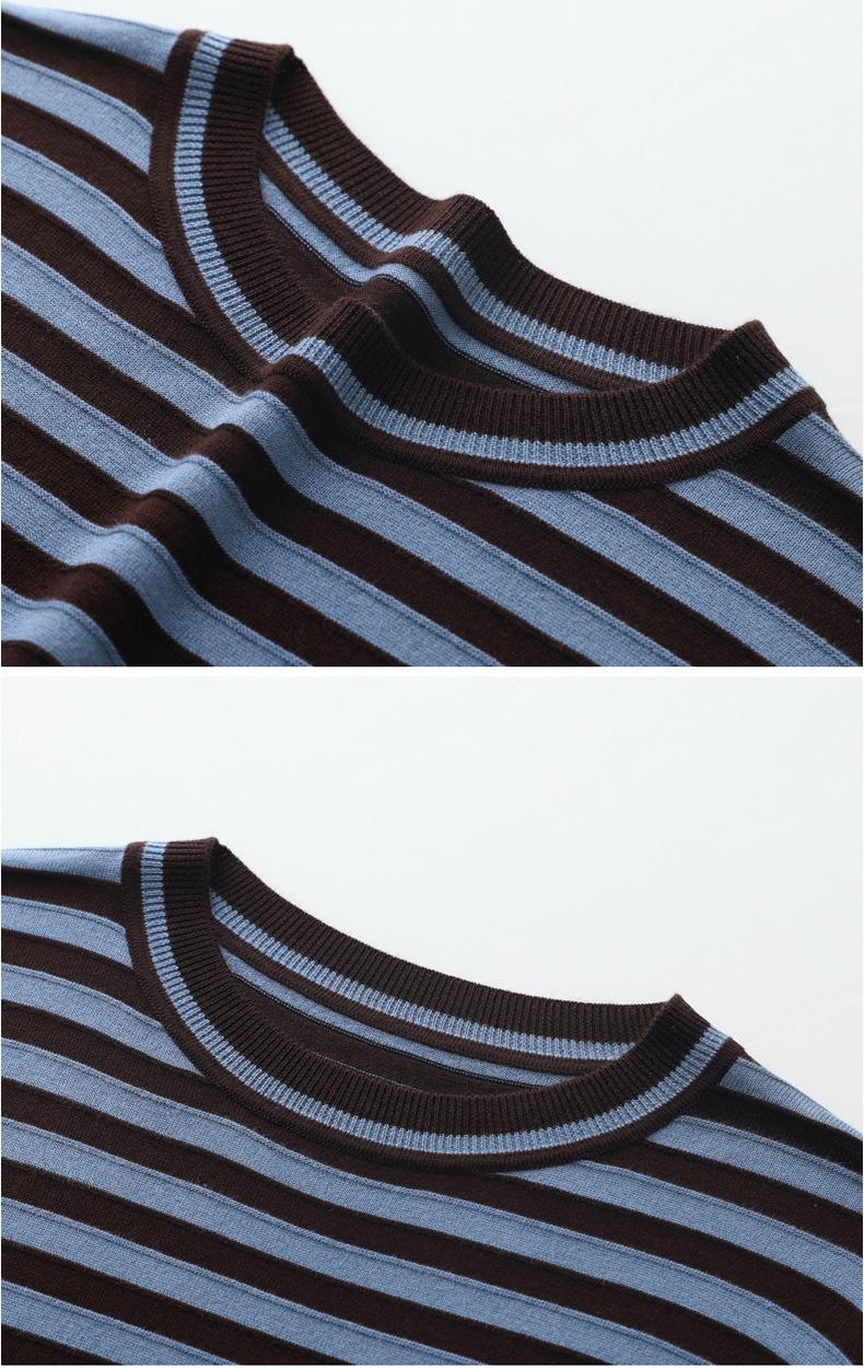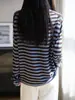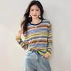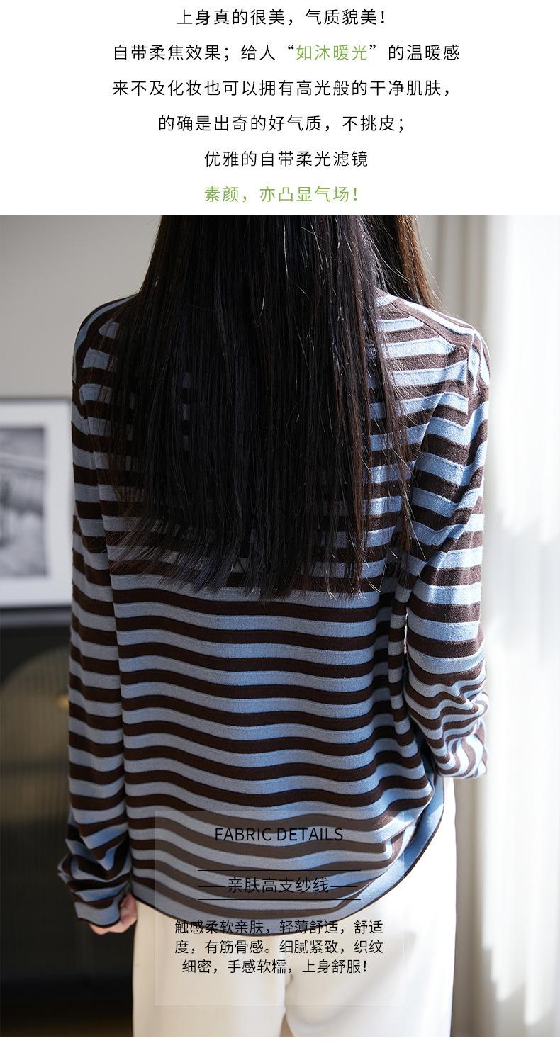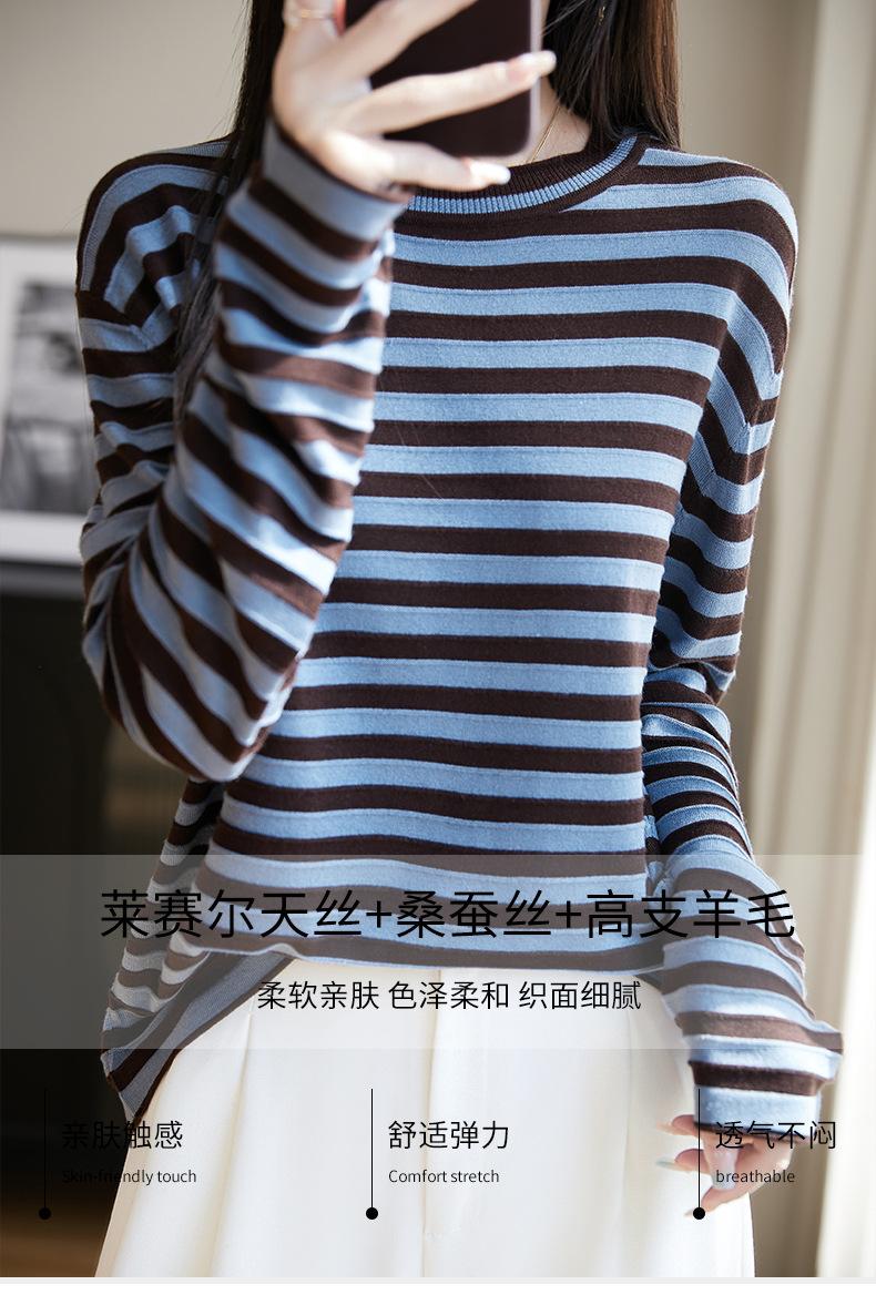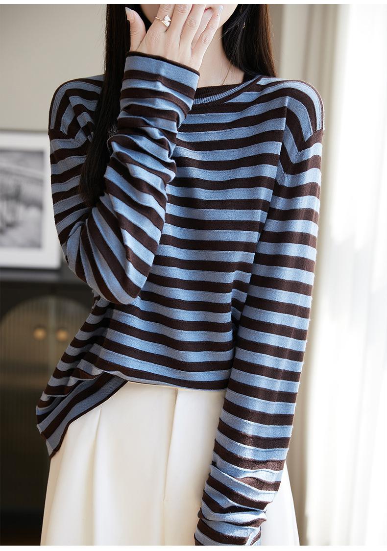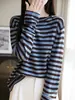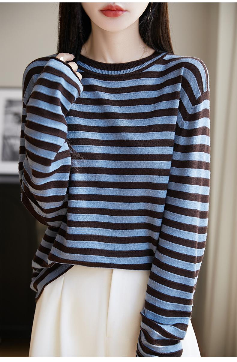 Suéter de Punto Redondo Adelgazante Antiedad para Mujer con Rayas Contrastantes, Camiseta Básica de Manga Larga Suelta, Nuevo Top para Primavera y Otoño 2025