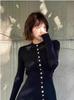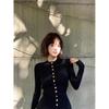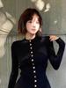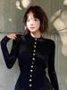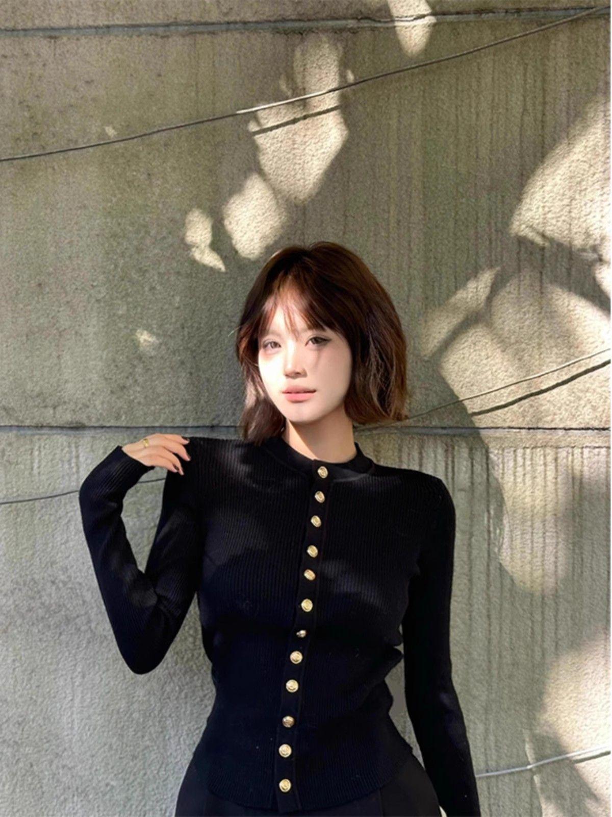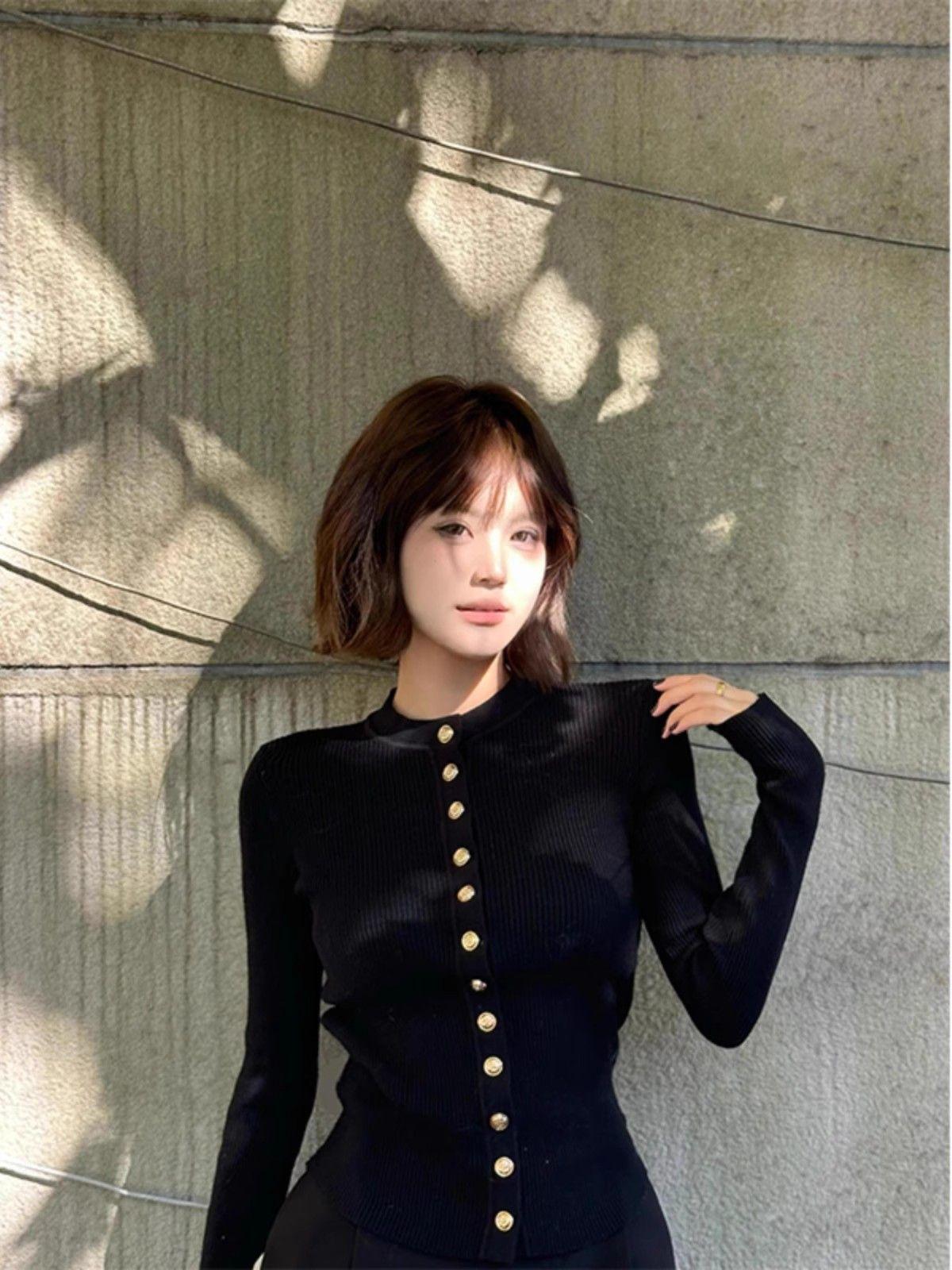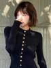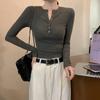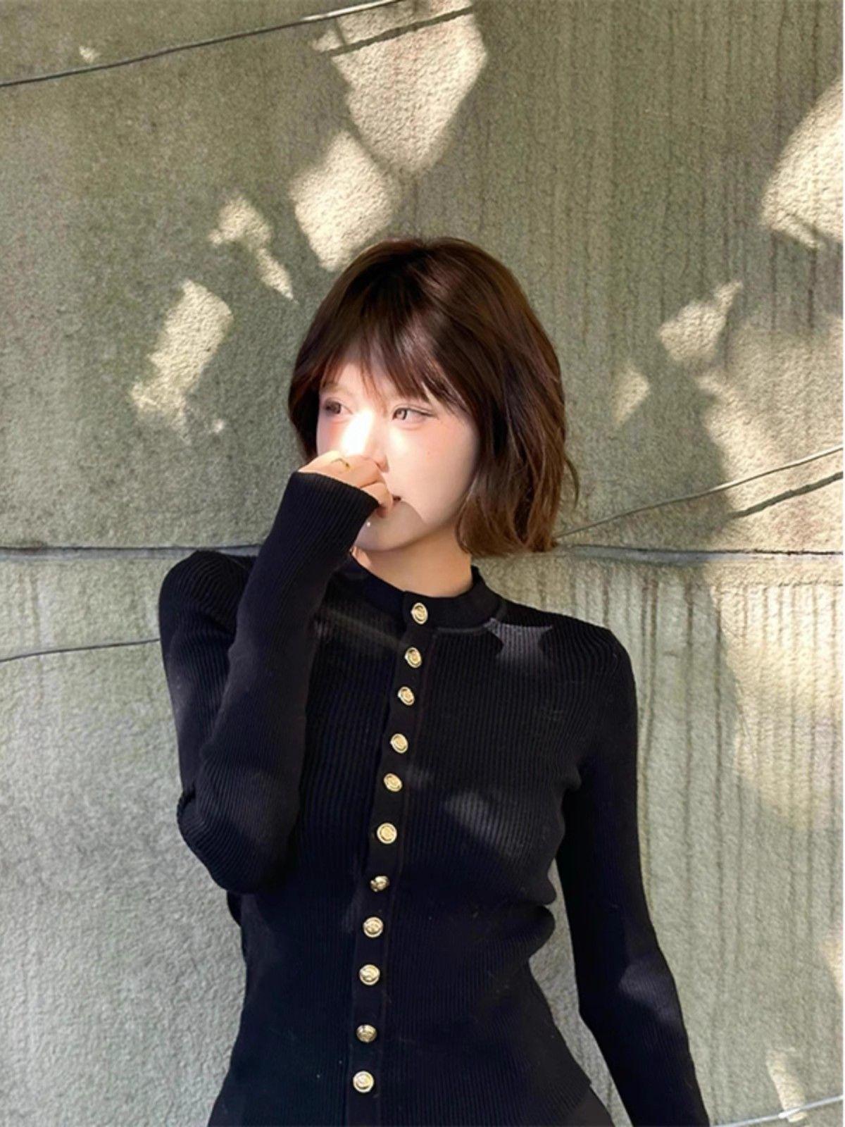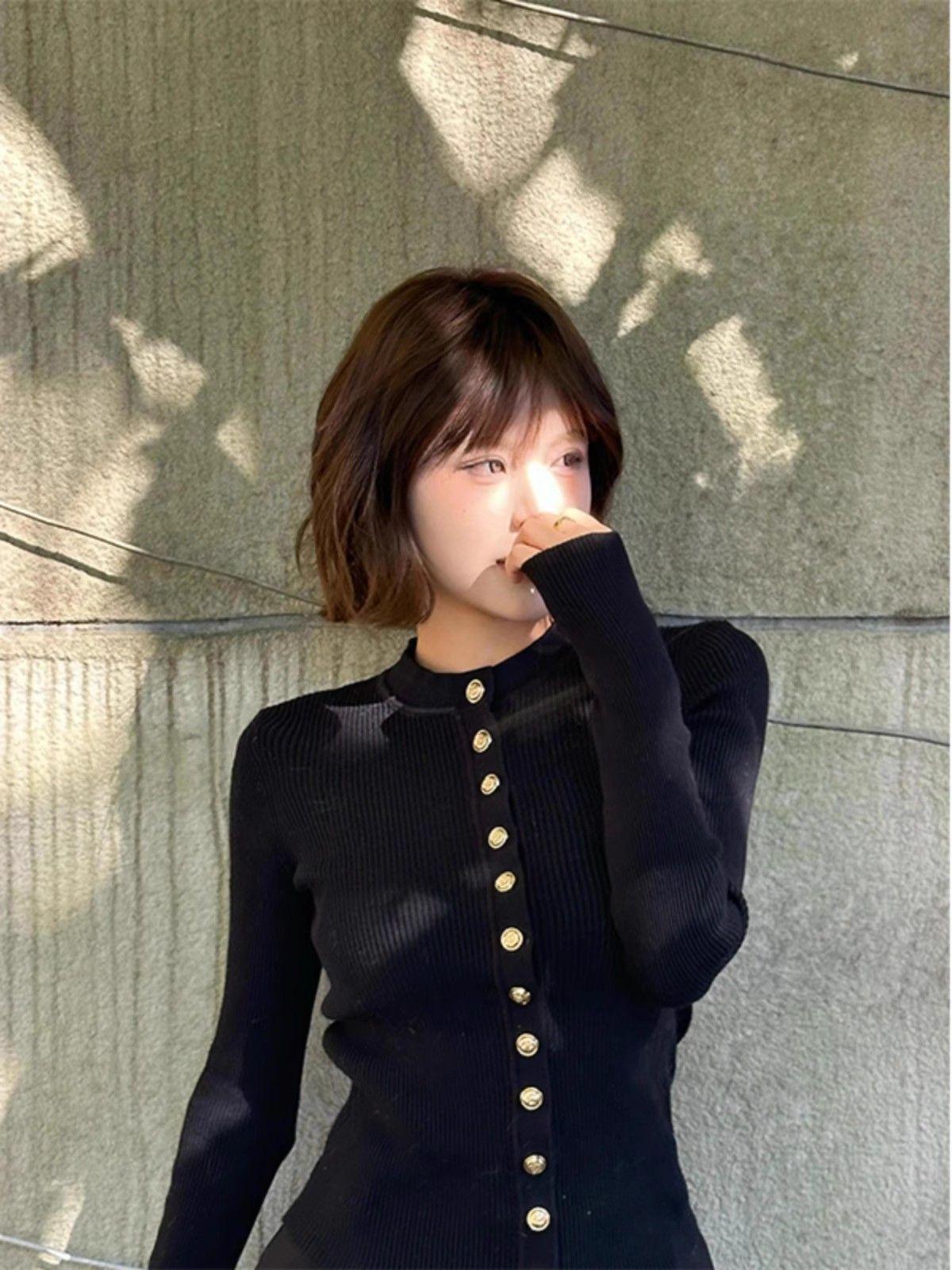 Camiseta de punto de manga larga con hebilla de metal negro para mujer, otoño e invierno, nueva, suave, encerada, ajustada, adelgazante, de nicho, de moda.
