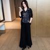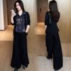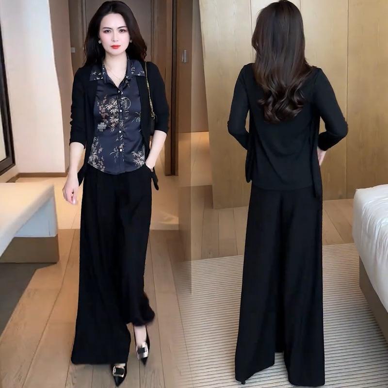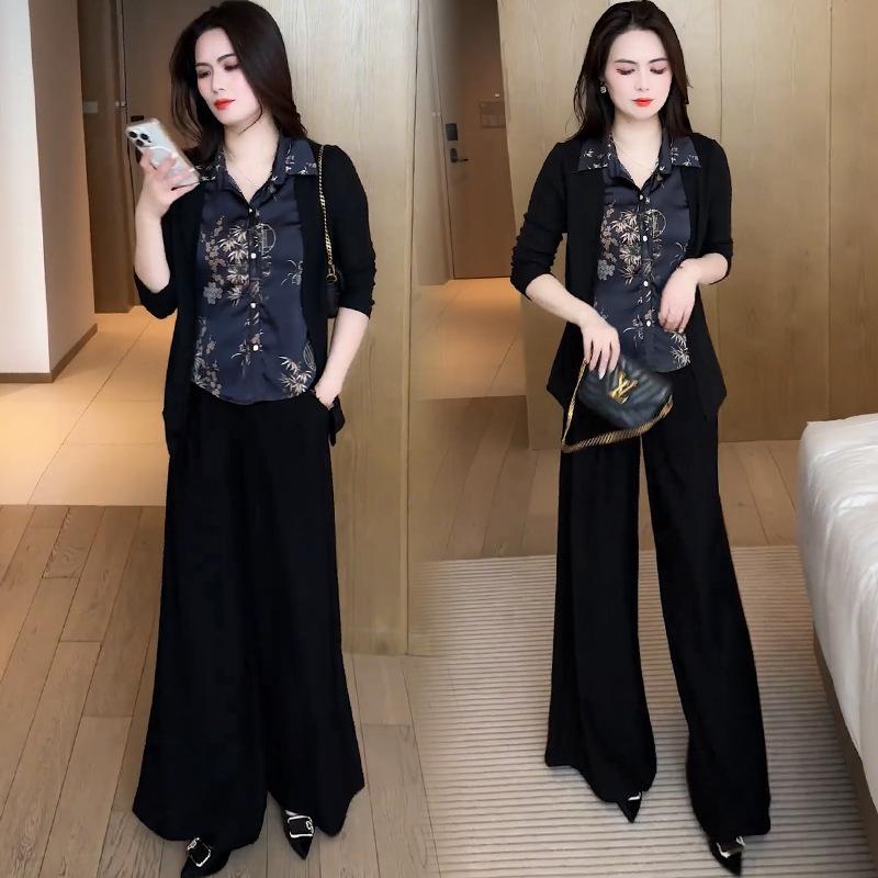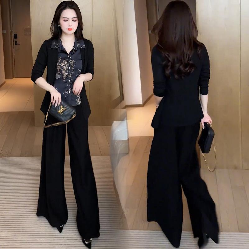 Traje de moda para mujer, primavera 2025, nuevo estilo occidental, ajustado, falso, camisa de dos piezas, pantalones de pierna ancha, conjunto informal de dos piezas antiedad.