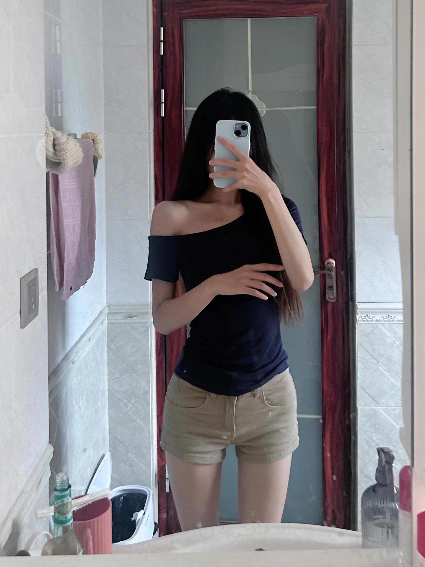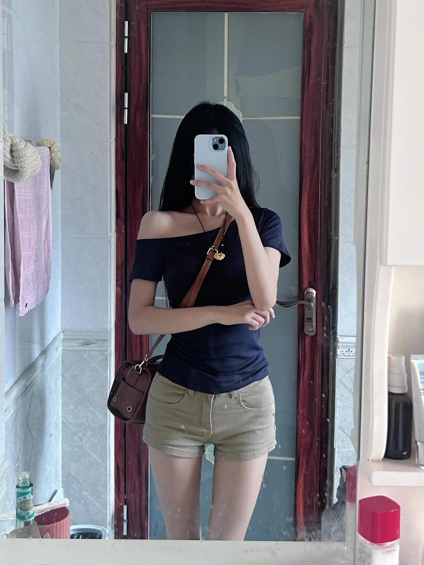Camiseta adelgazante de corte entallado con hombros oblicuos de Design Sense Niche, de manga corta, estilo Spice Girls Pure Desire, sexy, combinable y elegante.