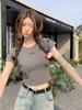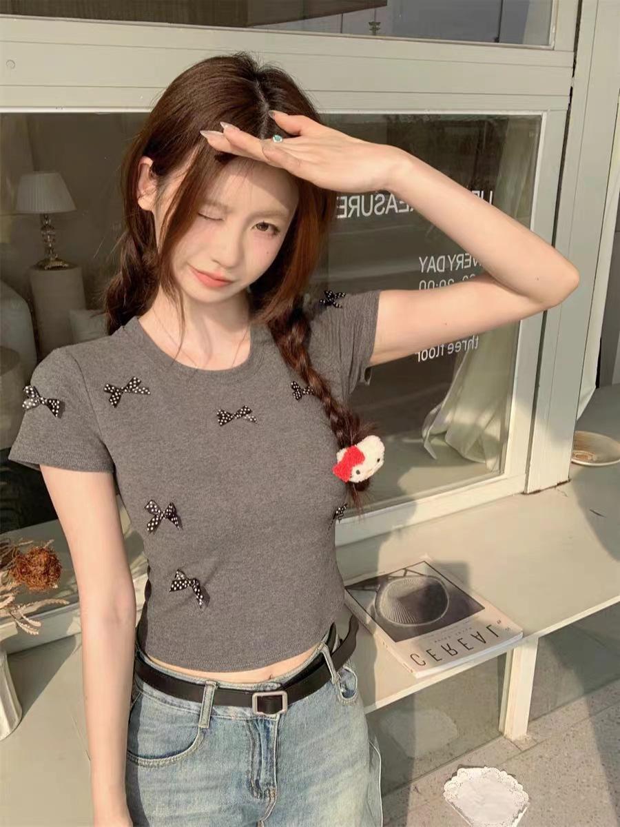 Verano Lazo Manga Corta Ajustado Ajustado Cintura Ceñida Cuello Redondo Camiseta Sentido del Diseño Combinación Total Nicho Ins Deseo Puro Top