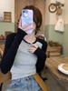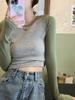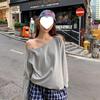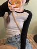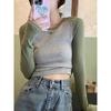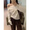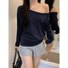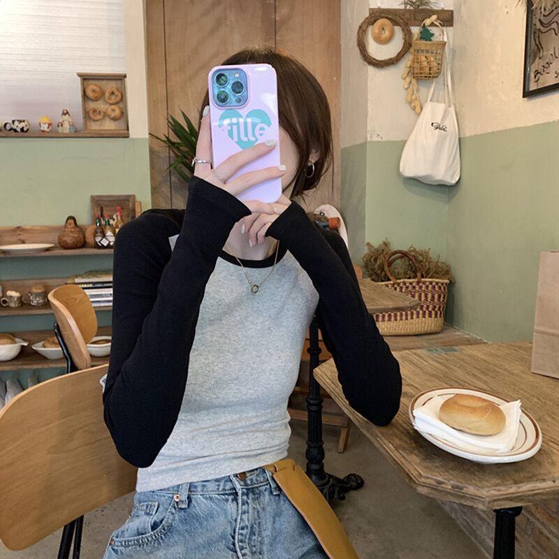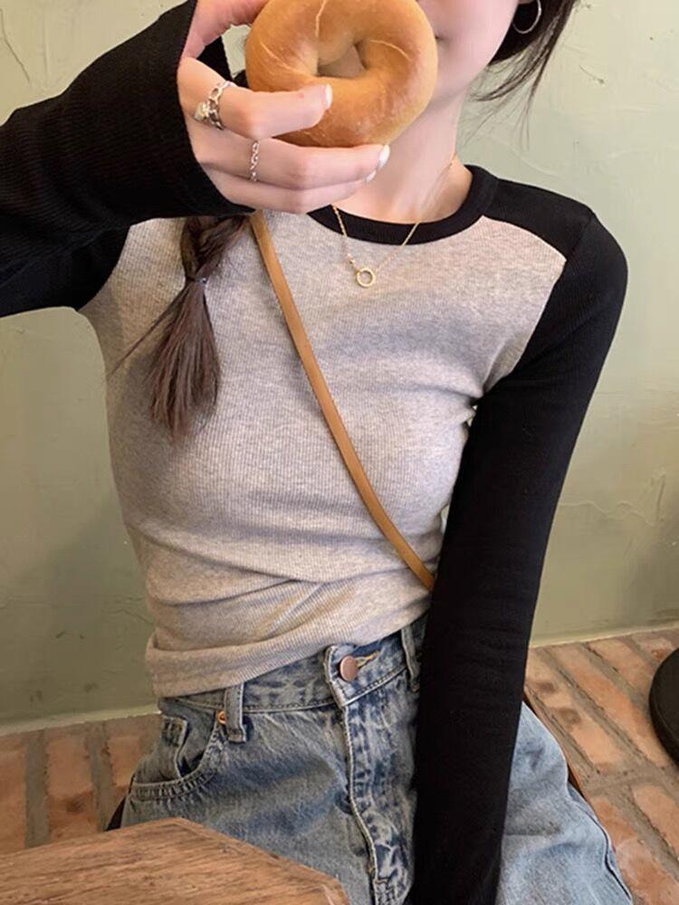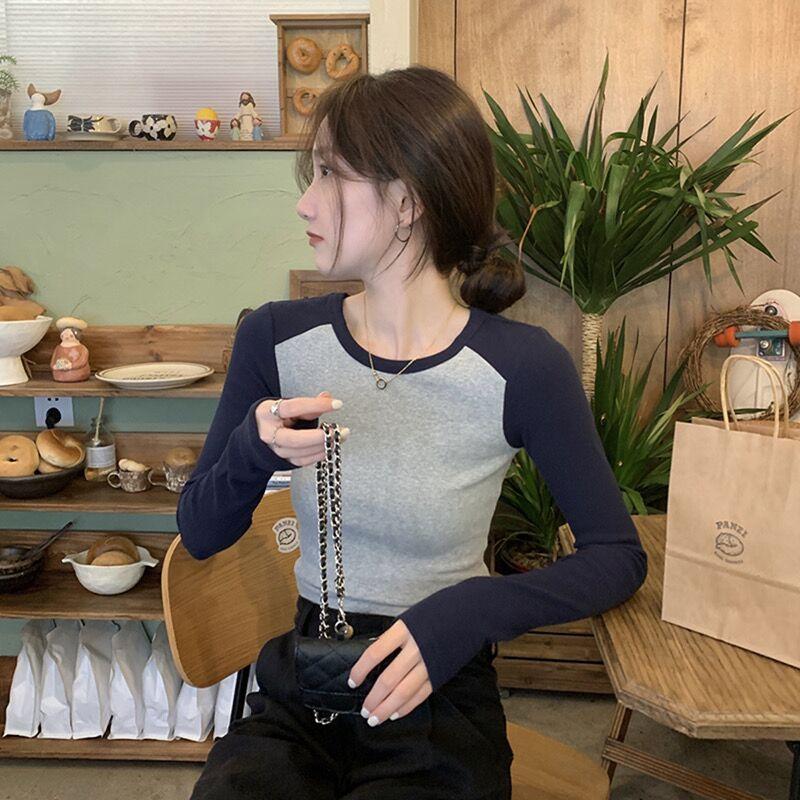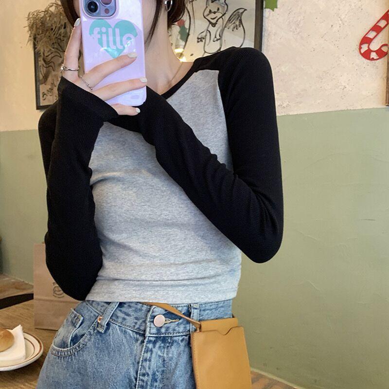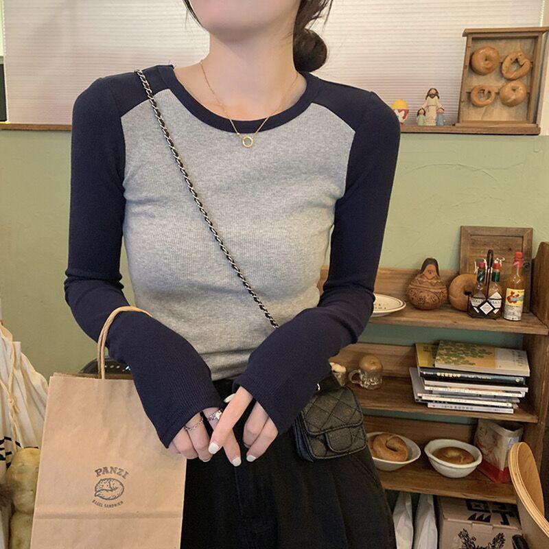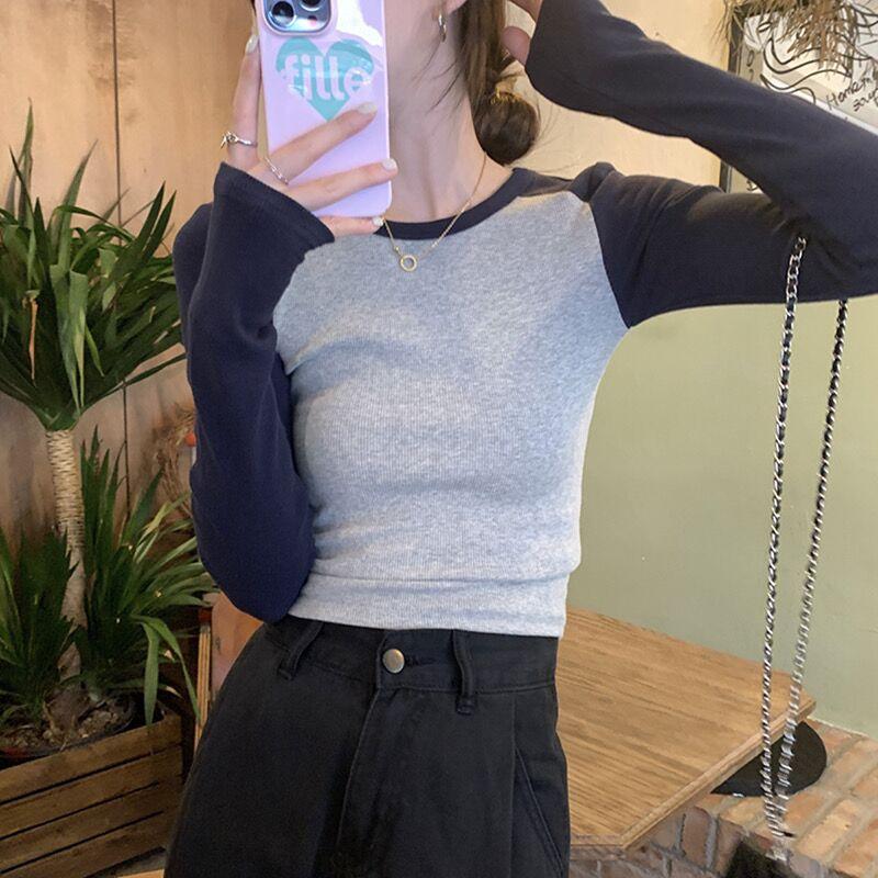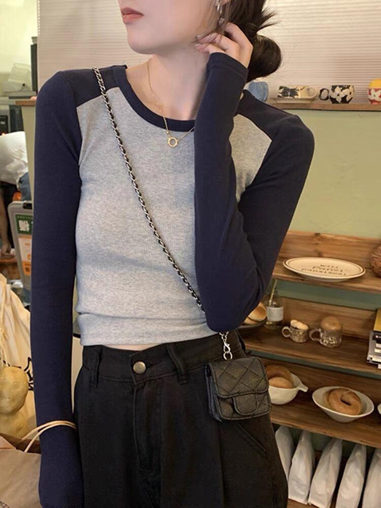 Camiseta ajustada de manga larga con hombros descubiertos y contraste de color para otoño 2024, nueva moda de Spice Girls, top de estilo nicho.